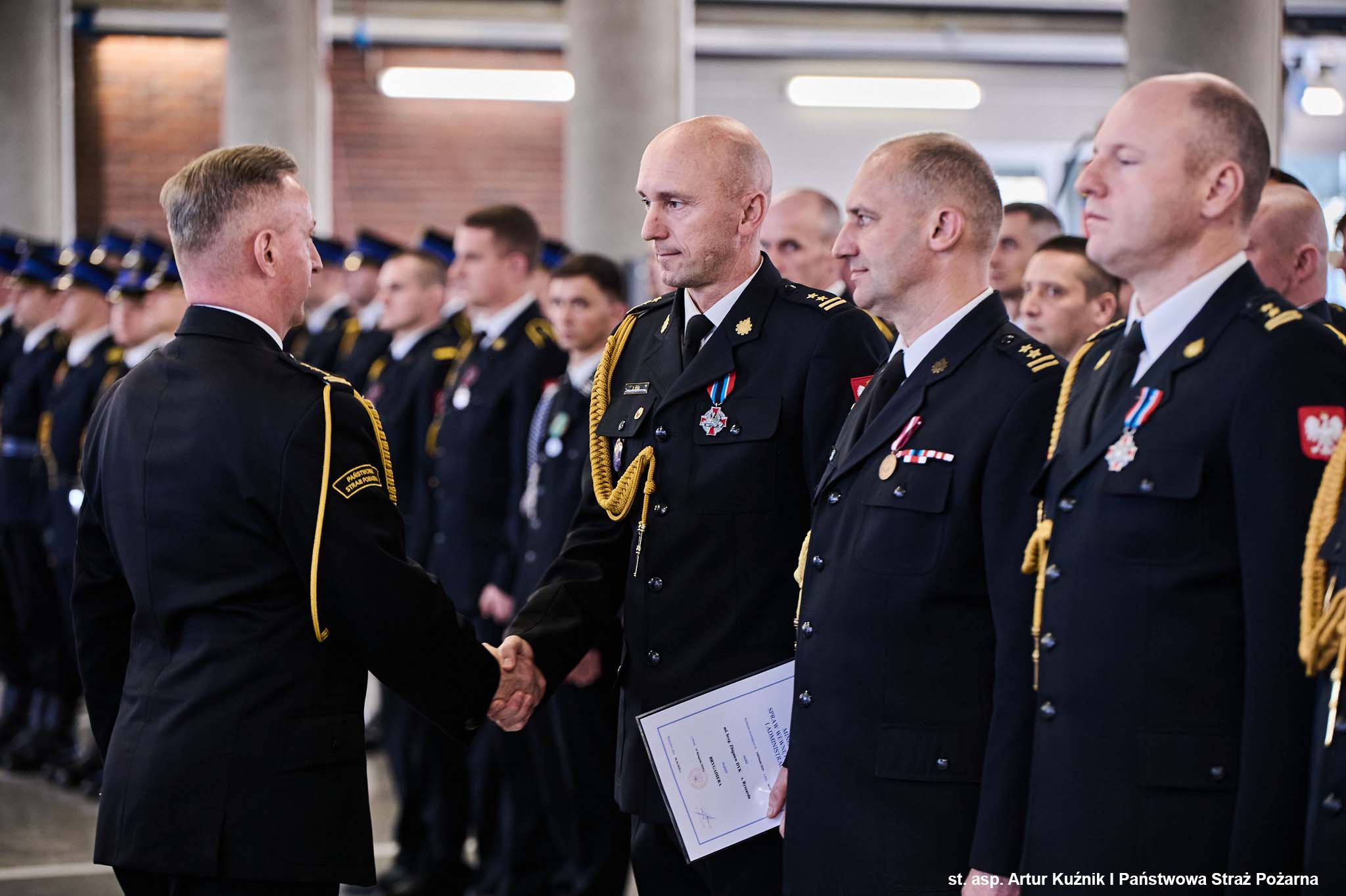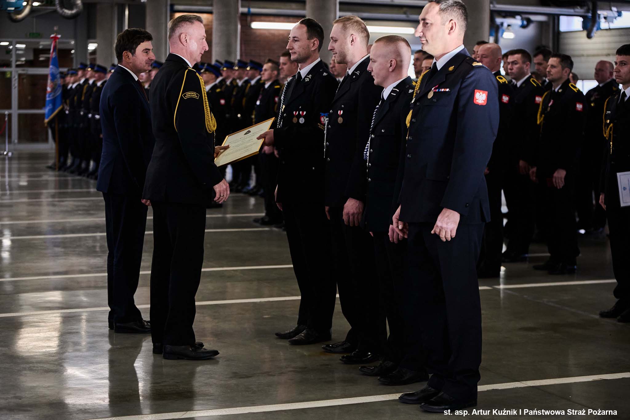 Po ceremonii wręczenia medali i odznaczeń, Śląski Komendant Wojewódzki PSP st. bryg. Damian Legierski oraz Komendant Miejski PSP w Katowicach st. bryg. Arkadiusz Korzeniewski wręczyli funkcjonariuszom akty nadania wyższych stopni służbowych.