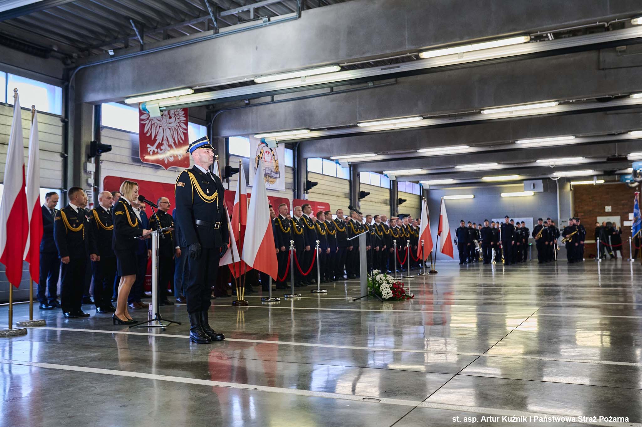 Uroczysta zbiórka rozpoczęła się złożeniem meldunku Śląskiemu Komendantowi Wojewódzkiemu PSP st. bryg. Damianowi Legierskiemu przez dowódcę uroczystości mł. bryg. Tobiasza Klamę i odegraniem hymnu państwowego.
