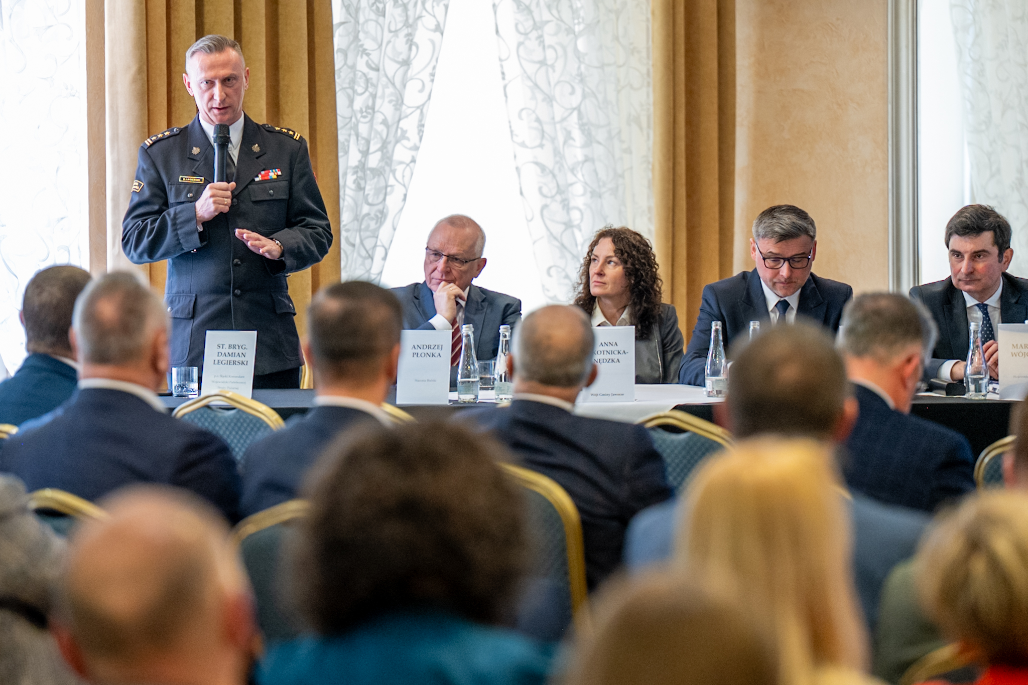 St. bryg. Damian Legierski w swoim wystąpieniu omówił kluczowe wyzwania i zadania, które stoją przed organami i podmiotami ochrony ludności, szczególny nacisk kładąc na zadania Państwowej Straży Pożarnej. Przedstawił stopień realizacji Programu Ochrony Ludności i Obrony Cywilnej na terenie województwa, kwestie związane przygotowaniem planów ewakuacji, przygotowaniami do sprawdzania budowli ochronnych oraz szkoleń dla organów ochrony ludności. Omówił również zadania z rozbudową i integracją systemu ostrzegania i alarmowania (SOiA).