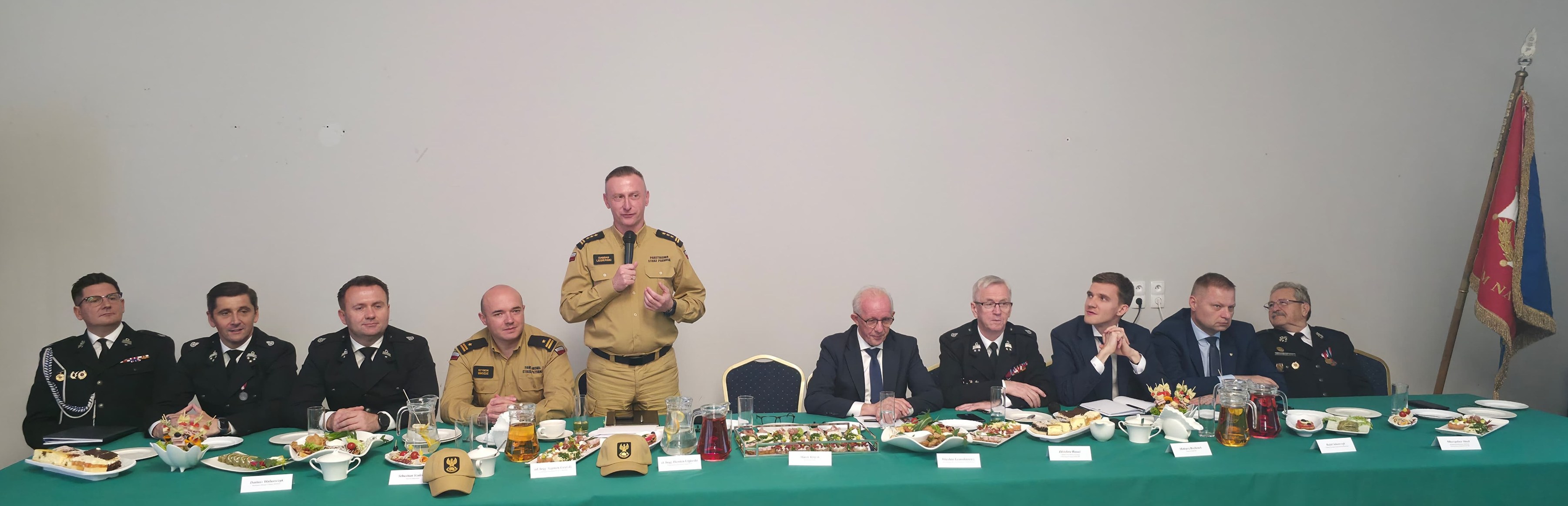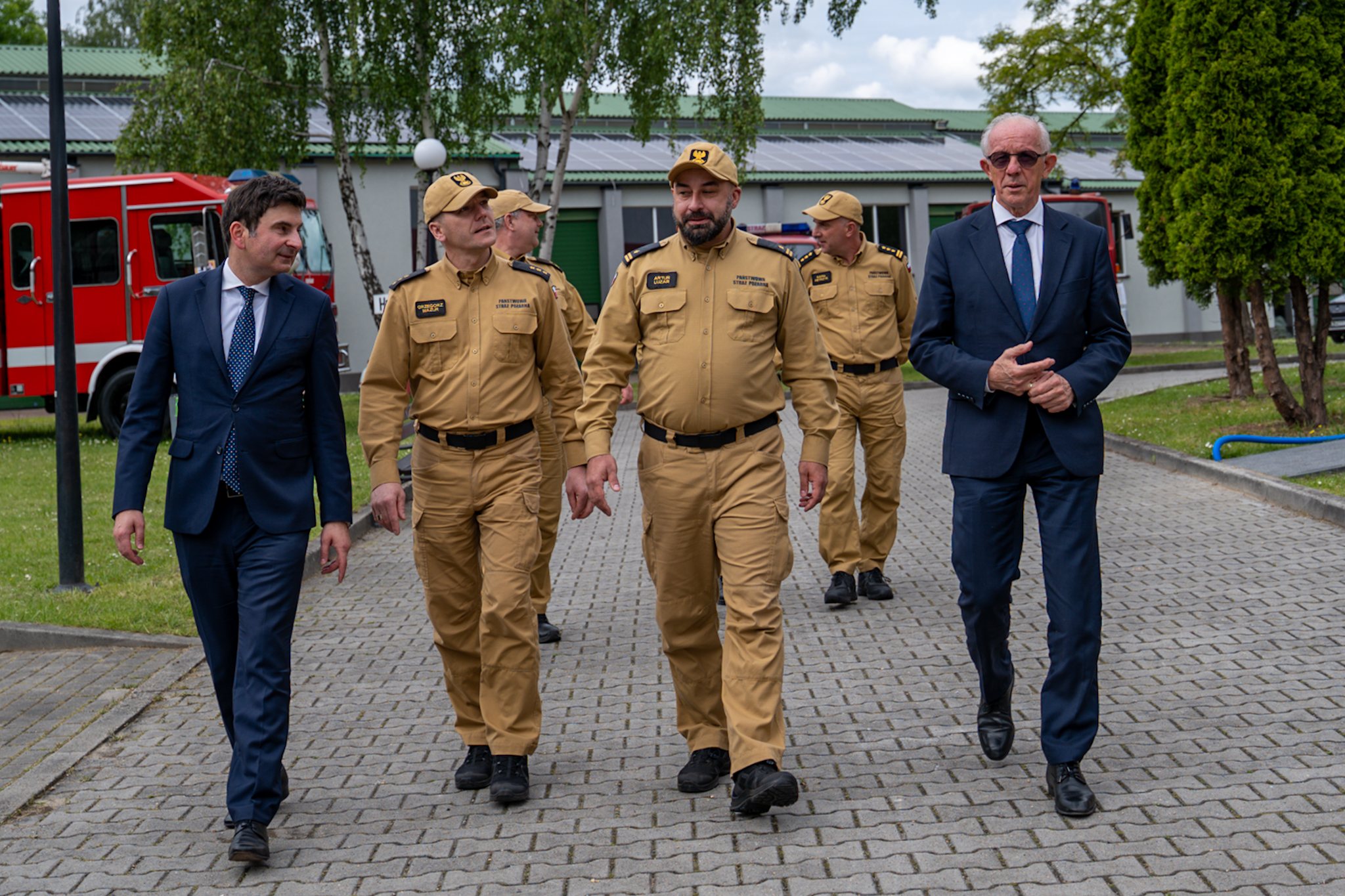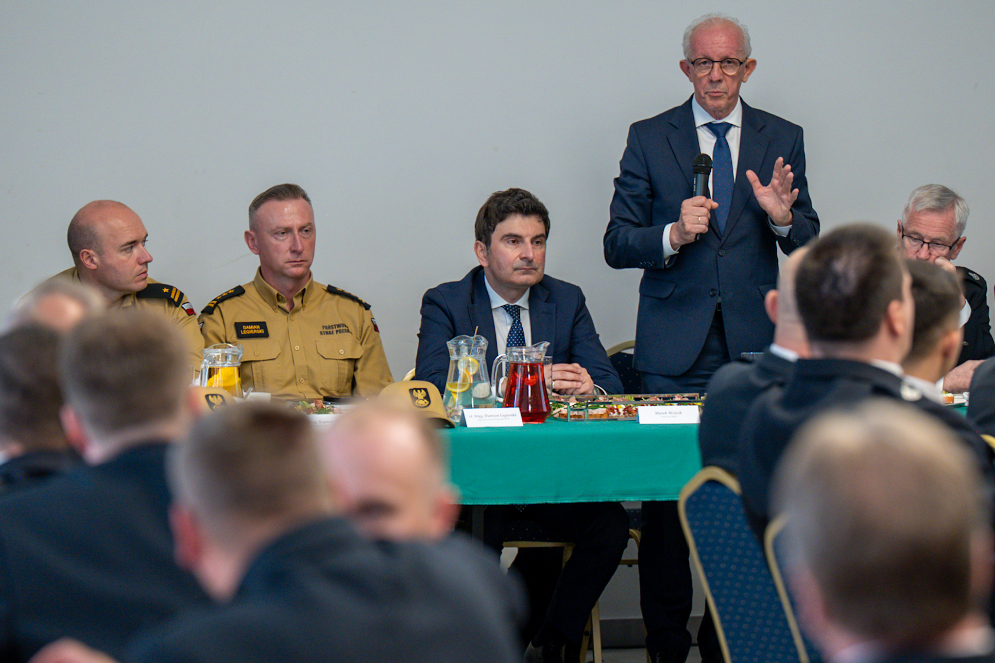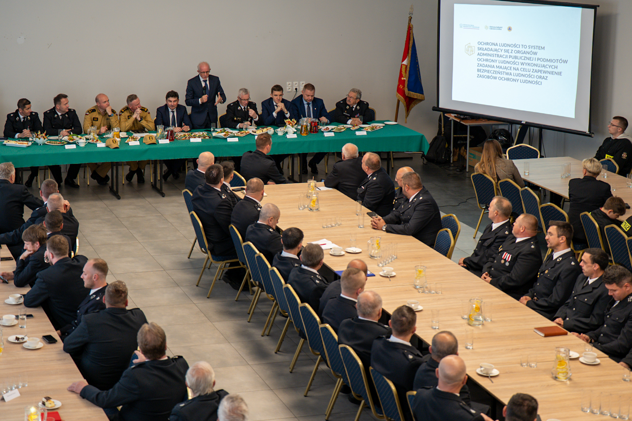 Kulminacyjnym punktem wizyty był udział Podsekretarza Stanu w MSWiA - Pana Wiesława Leśniakiewicza oraz Wojewody Śląskiego - Pan Marka Wójcika w spotkaniu poświęconym ustawie o ochronie ludności i obronie cywilnej, które zorganizowano w remizie Ochotniczej Straży Pożarnej w Wojkowicach Kościelnych. Spotkanie skierowane było do przedstawicieli Ochotniczych Straży Pożarnych z terenu powiatu będzińskiego. Podczas spotkania poruszono praktyczne aspekty wdrażania nowych przepisów, a także wyzwania stojące przed samorządami, PSP i jednostkami OSP. Była to doskonała okazja do wspólnej refleksji nad współodpowiedzialnością za bezpieczeństwo mieszkańców. W gronie zaproszonych gości znaleźli się m.in. Poseł na RP Pan Mateusz Bochenek, Śląski Komendant Wojewódzki PSP st. bryg. Damian Legierski, Wicemarszałek Województwa Śląskiego Pan Rafał Adamczyk, Starosta Będziński Pan Sebastian Szaleniec, Komendant Powiatowy PSP w Będzinie mł. bryg. Szymon Gwóźdź, Burmistrz Miasta i Gminy Siewierz Pan Dariusz Waluszczyk, Wójt Gminy Psary Pan Tomasz Sadłoń, Wójt Gminy Mierzęcice Pan Grzegorz Podlejski oraz Członek Prezydium Zarządu Głównego ZOSP RP dh Zdzisław Banaś.