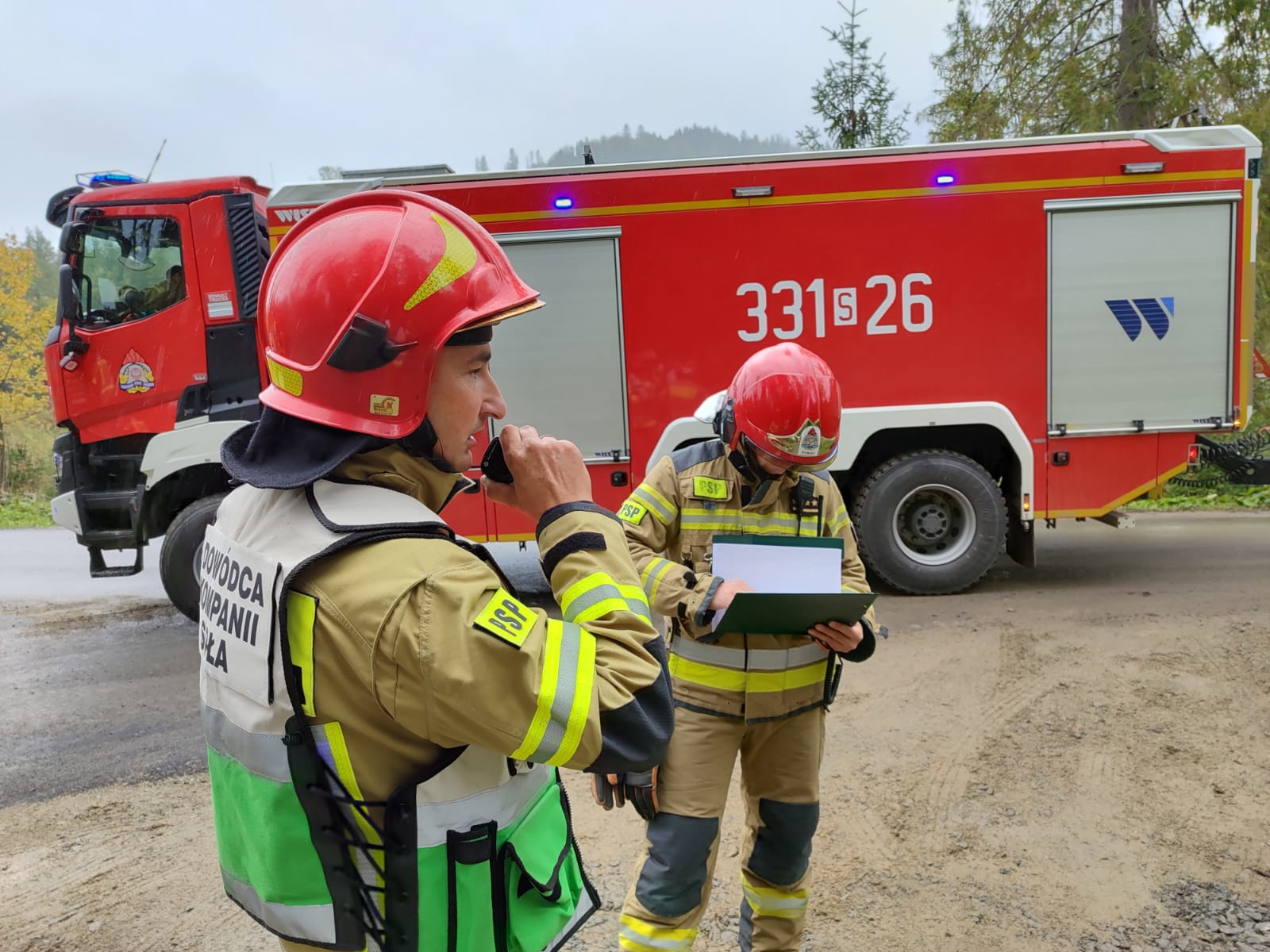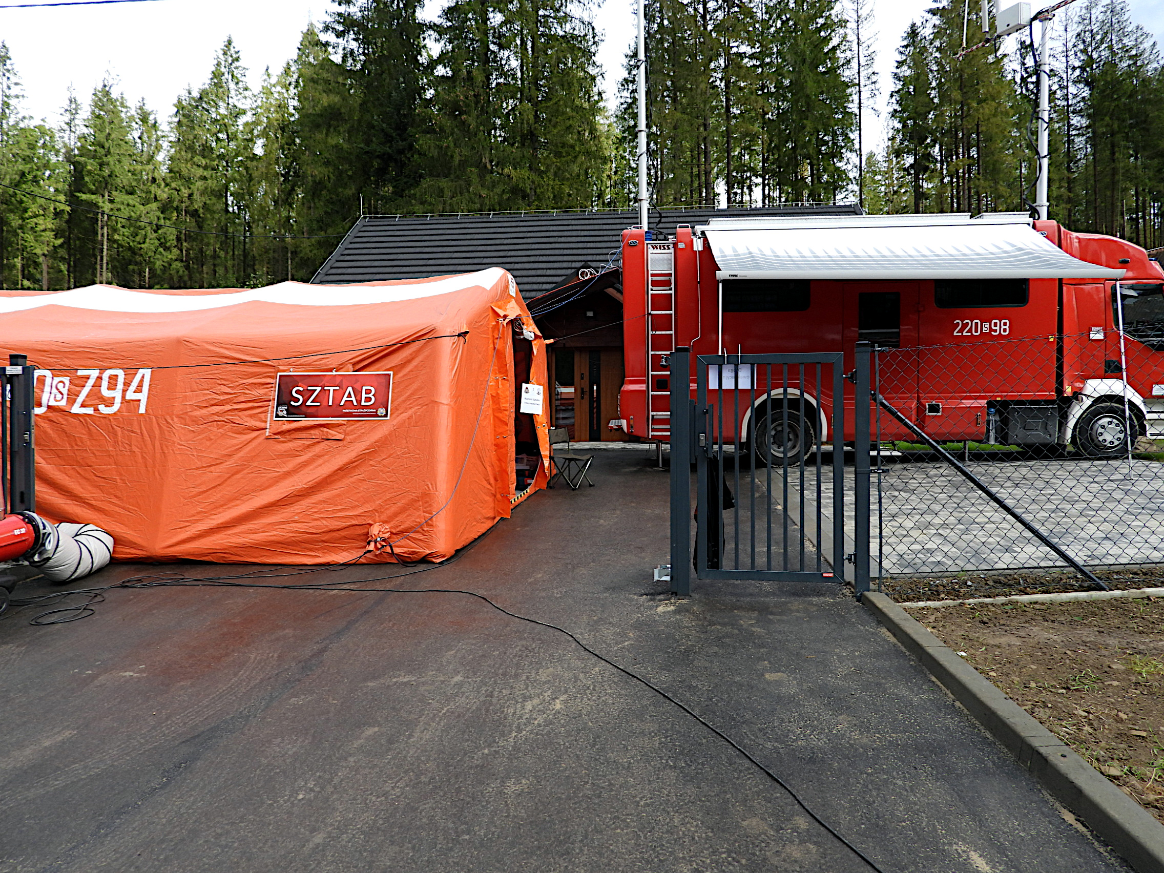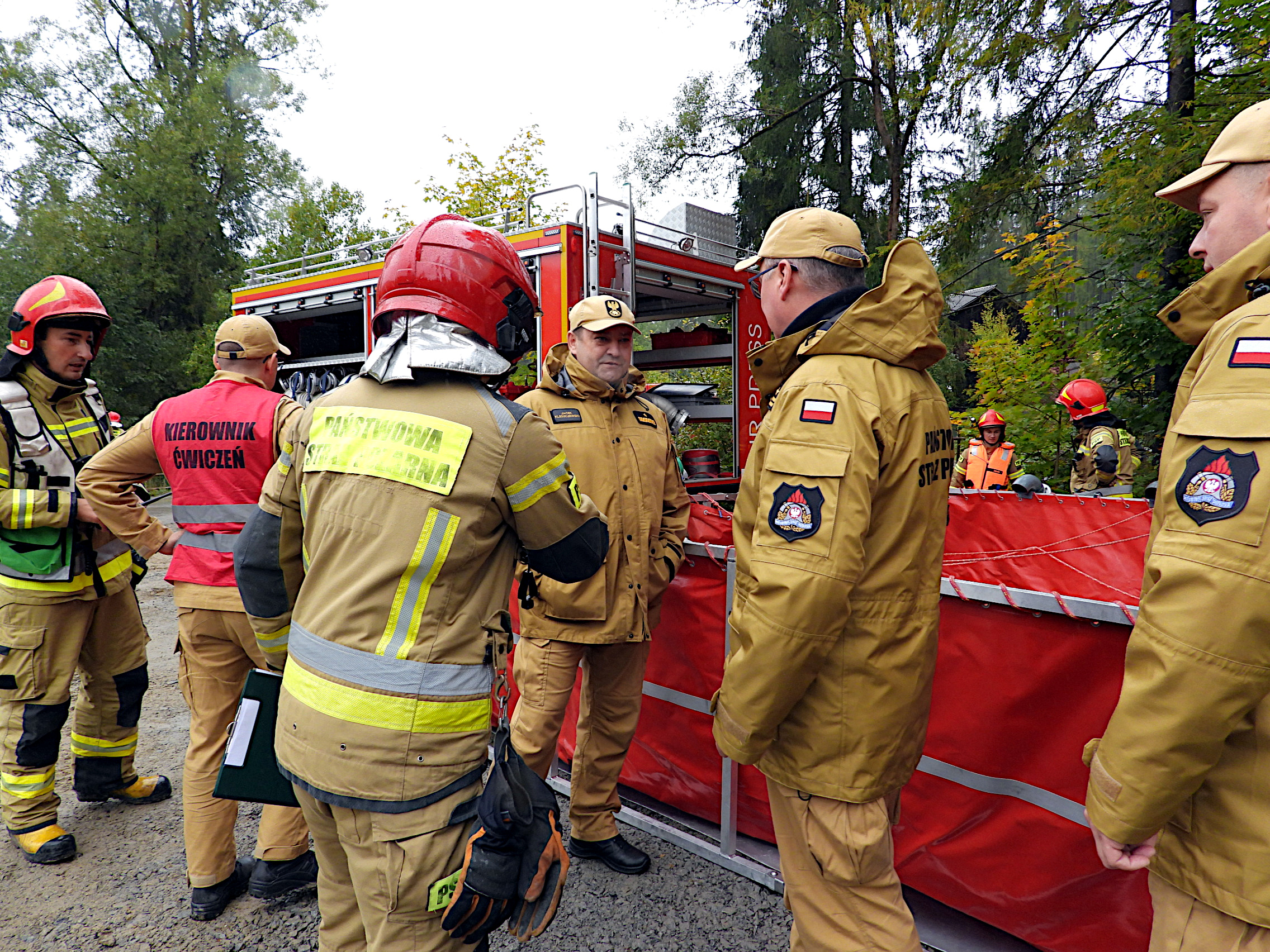 Teren ćwiczeń wizytował Śląski Komendant Wojewódzki PSP nadbryg. Jacek Kleszczewski z Zastępcą st. bryg. Mirosławem Synowcem oraz Komendantem Powiatowym PSP w Żywcu bryg. Łukaszem Węglińskim. Kierownik ćwiczeń wraz z szefem sztabu zreferowali organizację pracy sztabu. Omówili także aktualną sytuację na odcinkach bojowych.