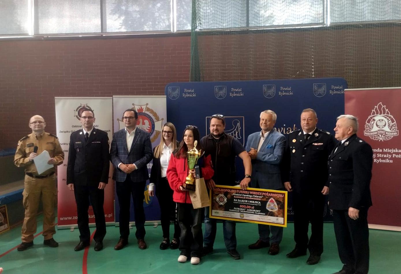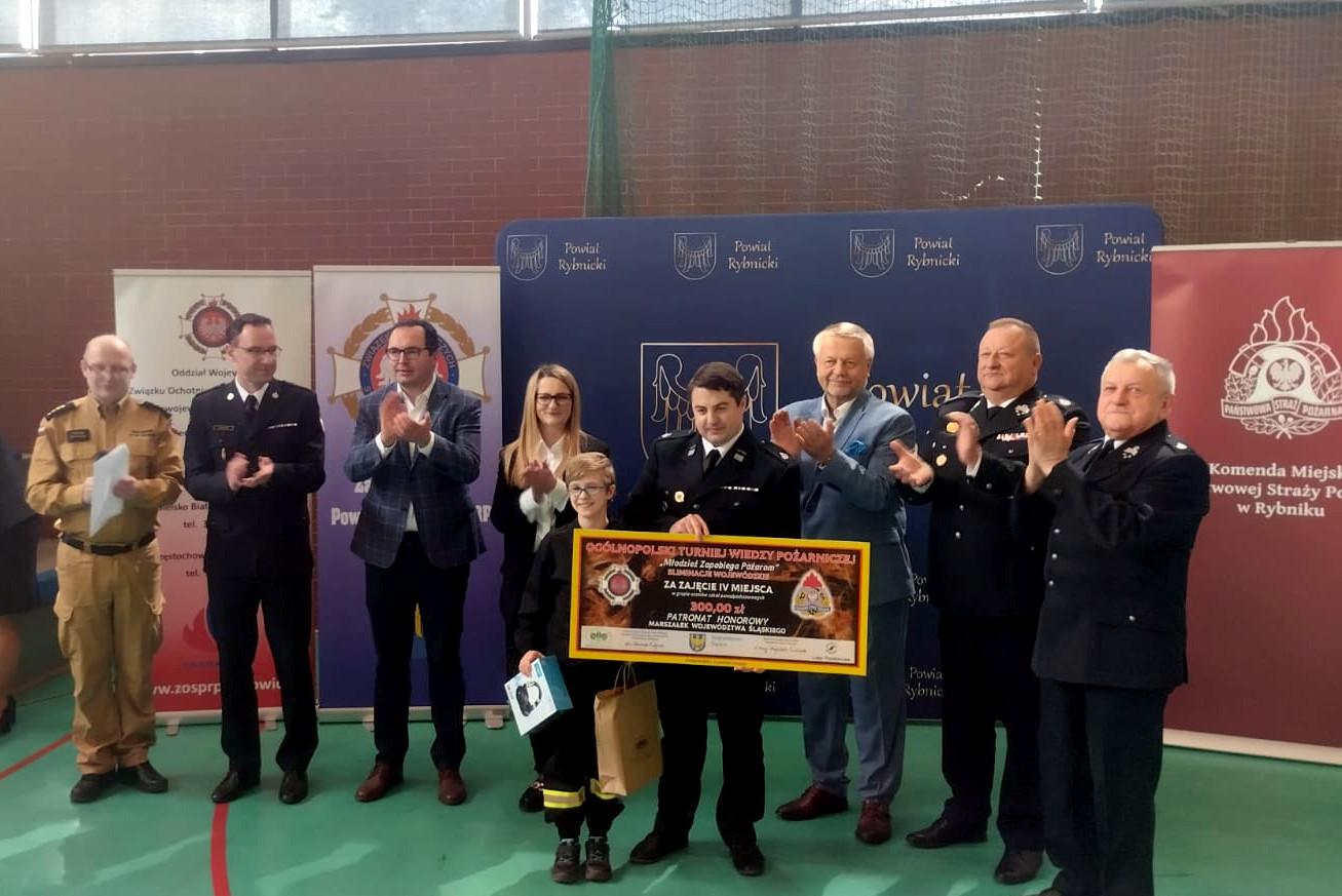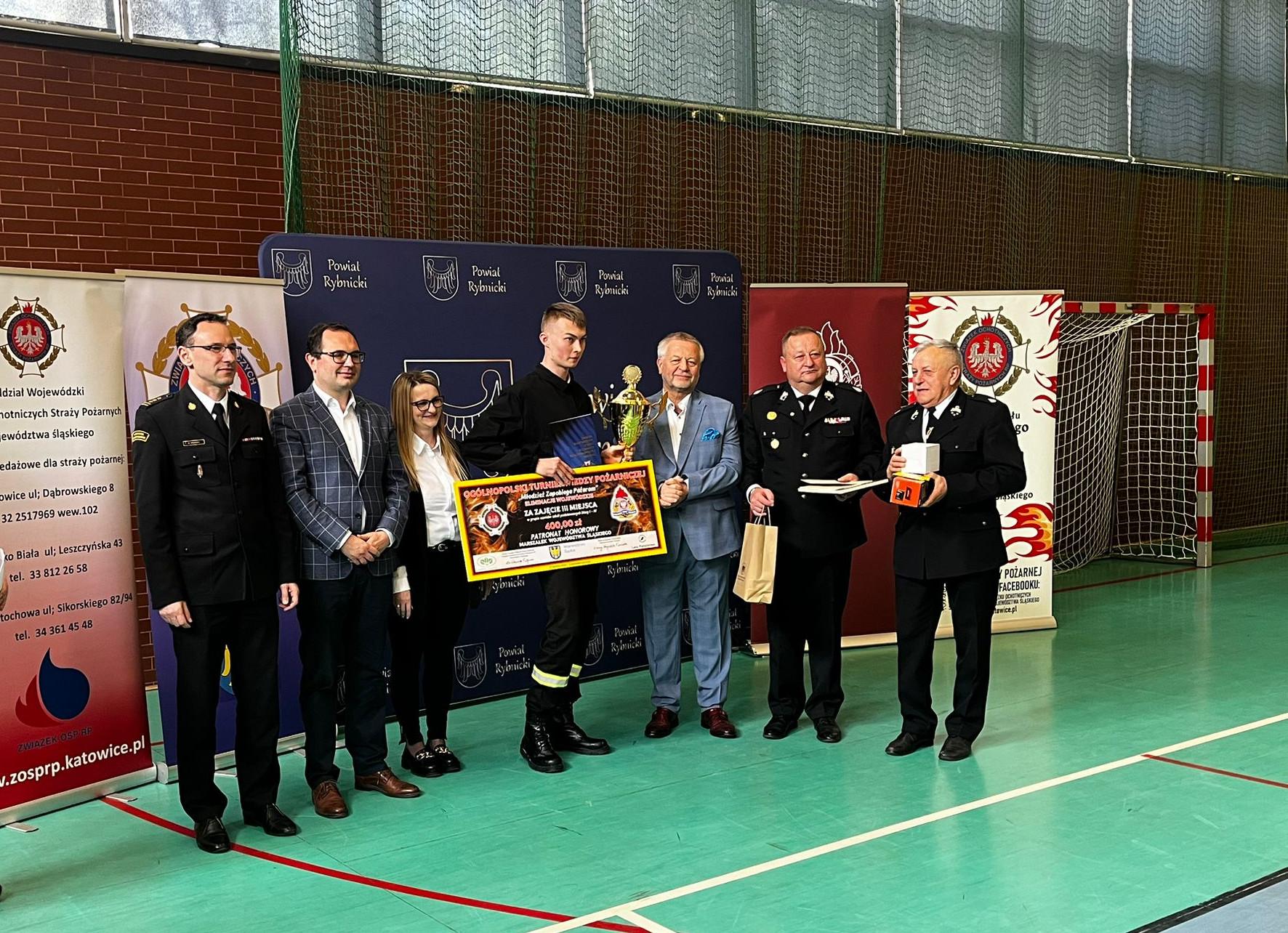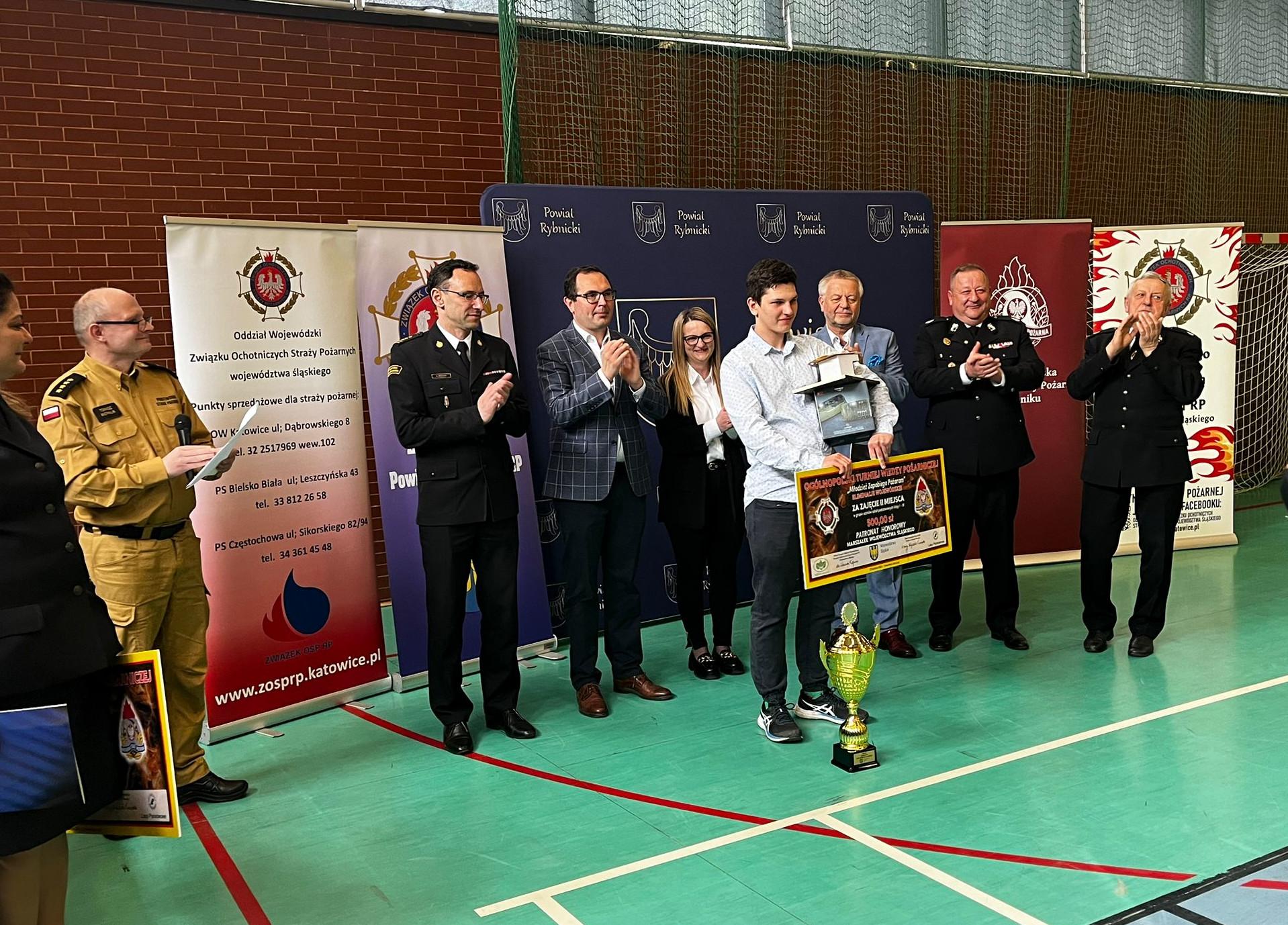 Puchary, dyplomy i nagrody laureatom wręczyli: Wicewojewoda Śląski Pan Michał Kopański, Śląski Komendant Wojewódzki PSP st. bryg. Wojciech Kruczek, Wiceprezes WFOŚiGW w Katowicach Pani Iwona Gejdel-Targosz, Wiceprezes Zarządu Oddziału Wojewódzkiego ZOSP RP woj. śląskiego dh Stefan Kaptur oraz Starosta Powiatu Rybnickiego Pan Damian Mrowiec.