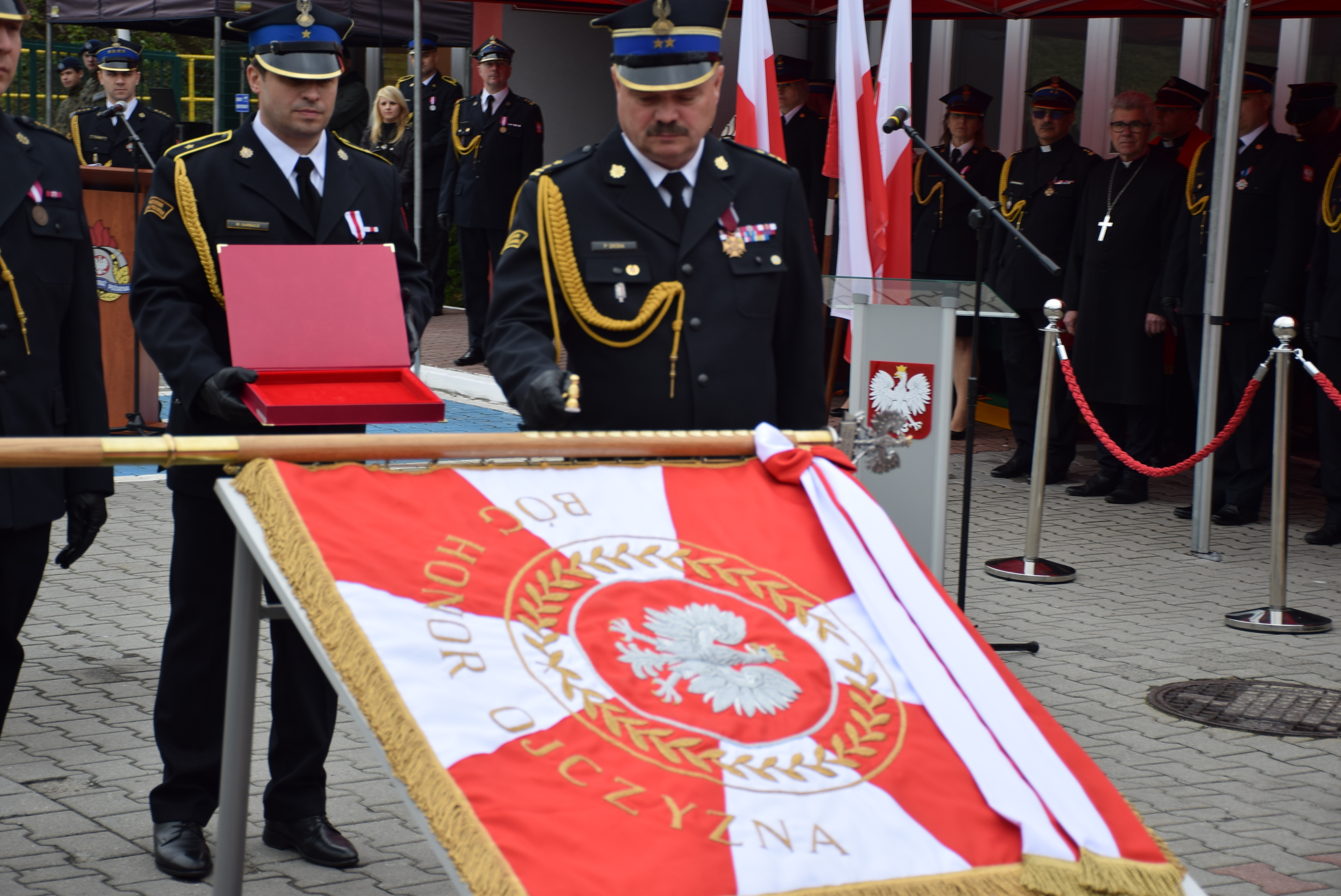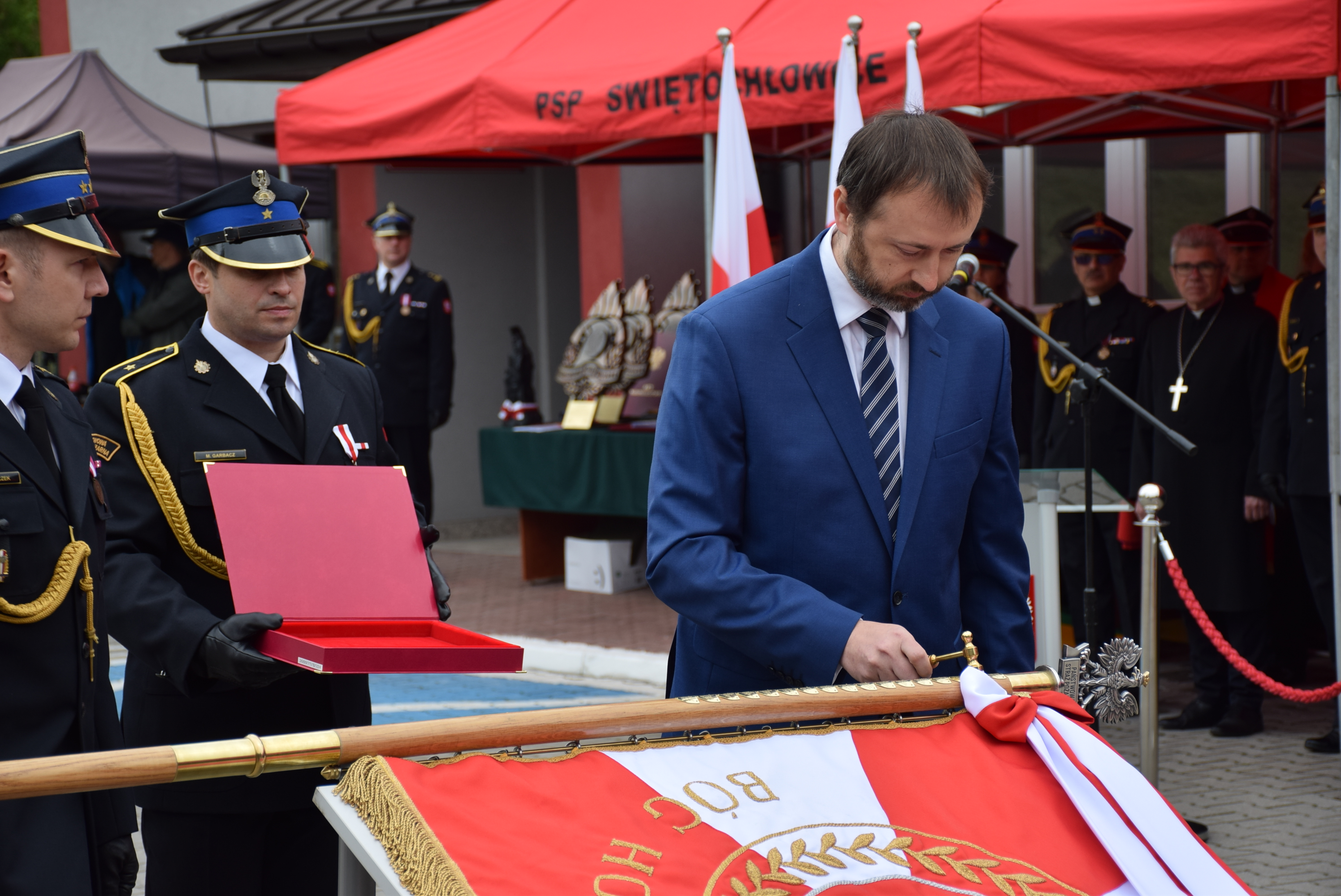 Przekazanie sztandaru zostało poprzedzone wbiciem pamiątkowych gwoździ w jego drzewiec, wpisami do księgi pamiątkowej oraz błogosławieństwem. W imieniu Komendy sztandar przyjął komendant miejski PSP w Świętochłowicach bryg. Piotr Skóra, przekazując go pocztowi sztandarowemu Komendy.