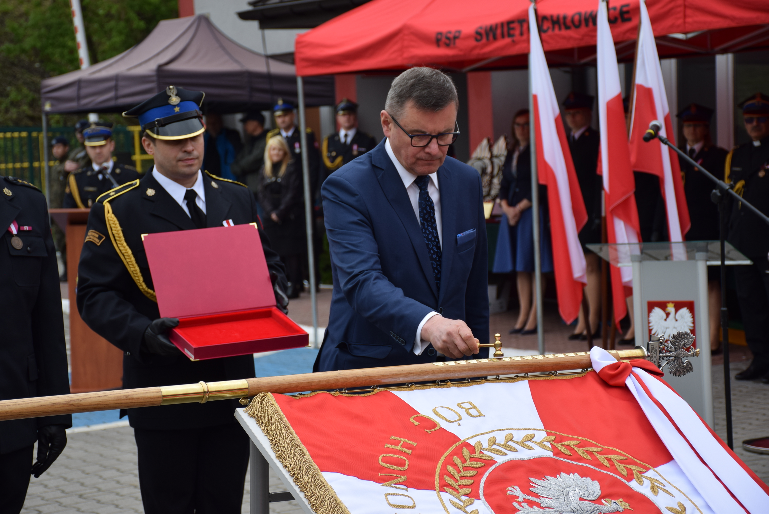 Następnie, w ramach Wojewódzkich Obchodów Dnia Strażaka wręczono, nadane przez Prezydenta Rzeczpospolitej Polskiej, 2 Krzyże Zasługi, 24 Medale za Długoletnią Służbę oraz 4 Krzyże Świętego Floriana, wręczone po raz pierwszy podczas wojewódzkich obchodów. Krzyż Świętego Floriana ustanowiony w grudniu 2021 roku, przyznawany jest szczególnie wyróżniającym się i zasłużonym członkom Ochotniczych Straży Pożarnych. Wręczenia odznaczeń dokonał wojewoda śląski Pan Jarosław Wieczorek w asyście zastępcy komendanta głównego PSP nadbryg. Krzysztofa Hejduka i śląskiego komendanta wojewódzkiego PSP nadbryg. Jacka Kleszczewskiego. Wojewoda śląski odczytał okolicznościowy list Prezesa Rady Ministrów Pana Mateusza Morawieckiego oraz złożył na ręce komendanta miejskiego PSP w Świętochłowicach gratulacje, w związku z nadaniem Komendzie sztandaru.