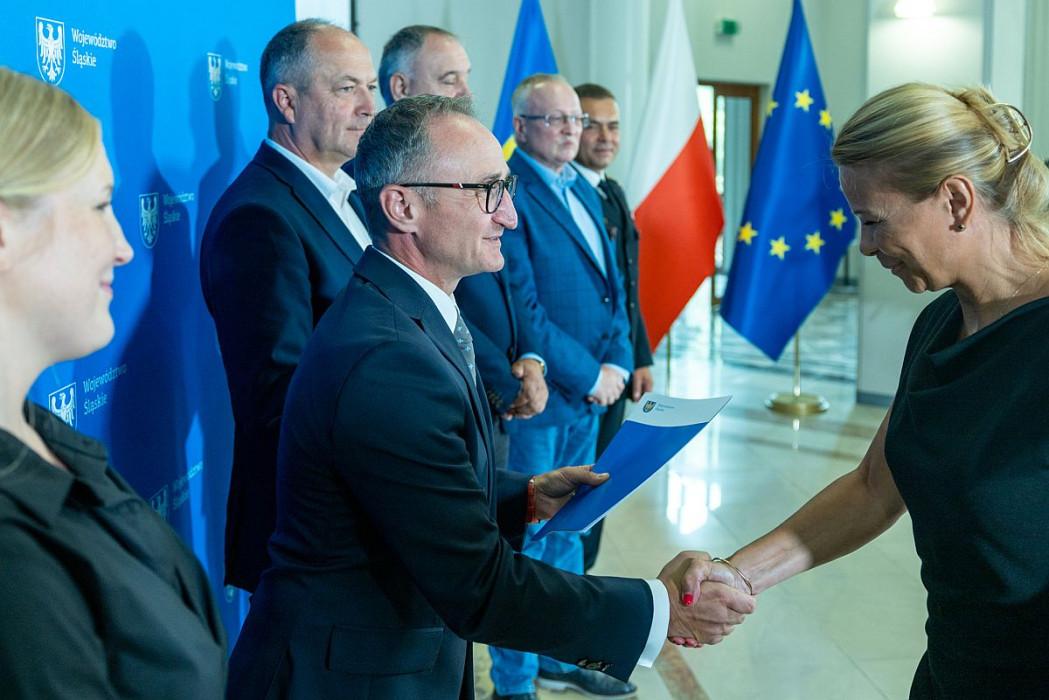 W przekazaniu umów uczestniczyli m.in. wicemarszałek Pan Grzegorz Boski, członkini zarządu Pani Joanna Bojczuk, sekretarz stanu w Ministerstwie Edukacji Narodowej Pan Henryk Kiepura, zastępca śląskiego komendanta śląskiego Państwowej Straży Pożarnej - st. bryg. Arkadiusz Krzemiński oraz radni Sejmiku Pan Marek Bieniek i Pan Grzegorz Wolnik.