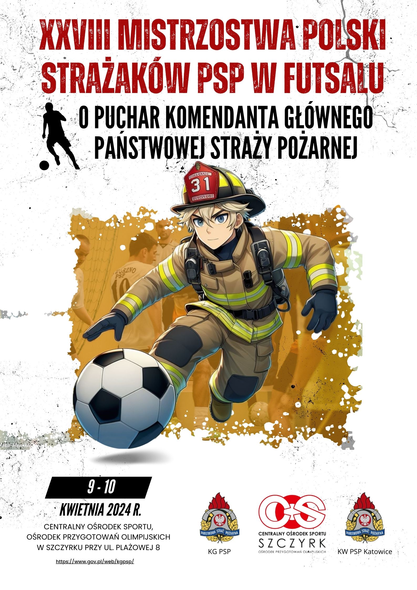 XXVIII Mistrzostwa Polski Strażaków PSP w Futsalu o Puchar Komendanta Głównego PSP odbędą w dniach 9 -10 kwietnia 2024 roku, na terenie obiektów sportowych Centralnego Ośrodka Sportu, Ośrodka Przygotowań Olimpijskich w Szczyrku przy ul. Plażowej 8.