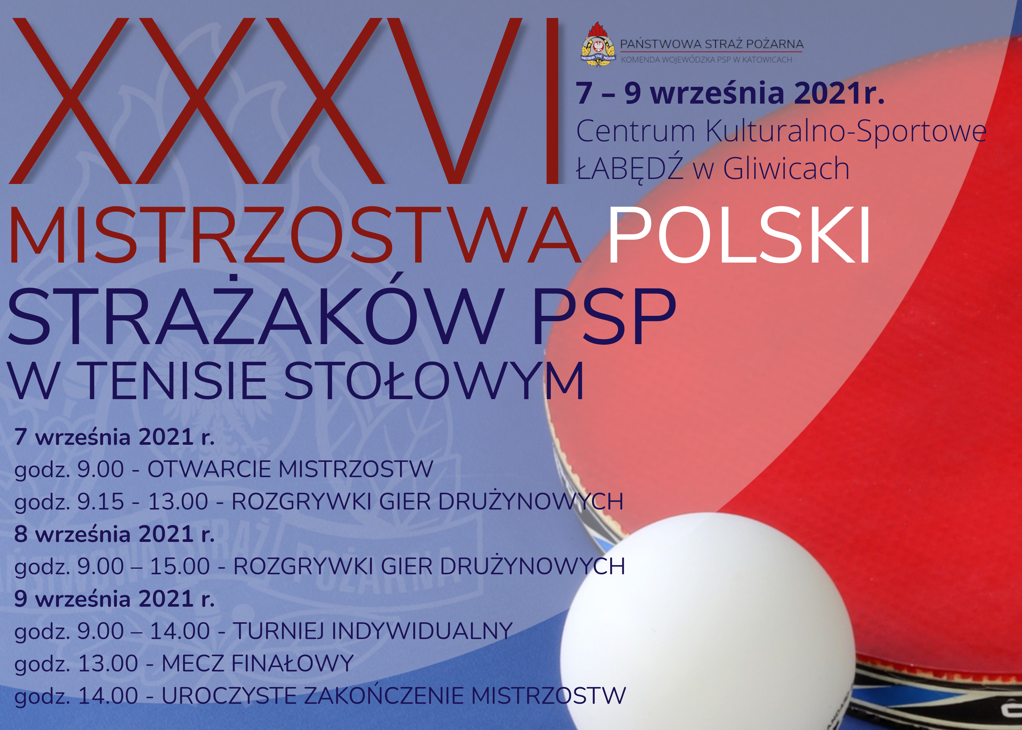 W dniach od 7 do 9 września 2021 r. w hali Centrum Kulturalno-Sportowego „ŁABĘDŹ”, przy ul. Partyzantów 25 w Gliwicach odbędą się XXXVII Mistrzostwa Polski Strażaków PSP w Tenisie Stołowym. Organizatorem Mistrzostw Polski jest Komenda Główna Państwowej Straży Pożarnej, Komenda Wojewódzka PSP w Katowicach oraz Komenda Miejska PSP w Gliwicach.
