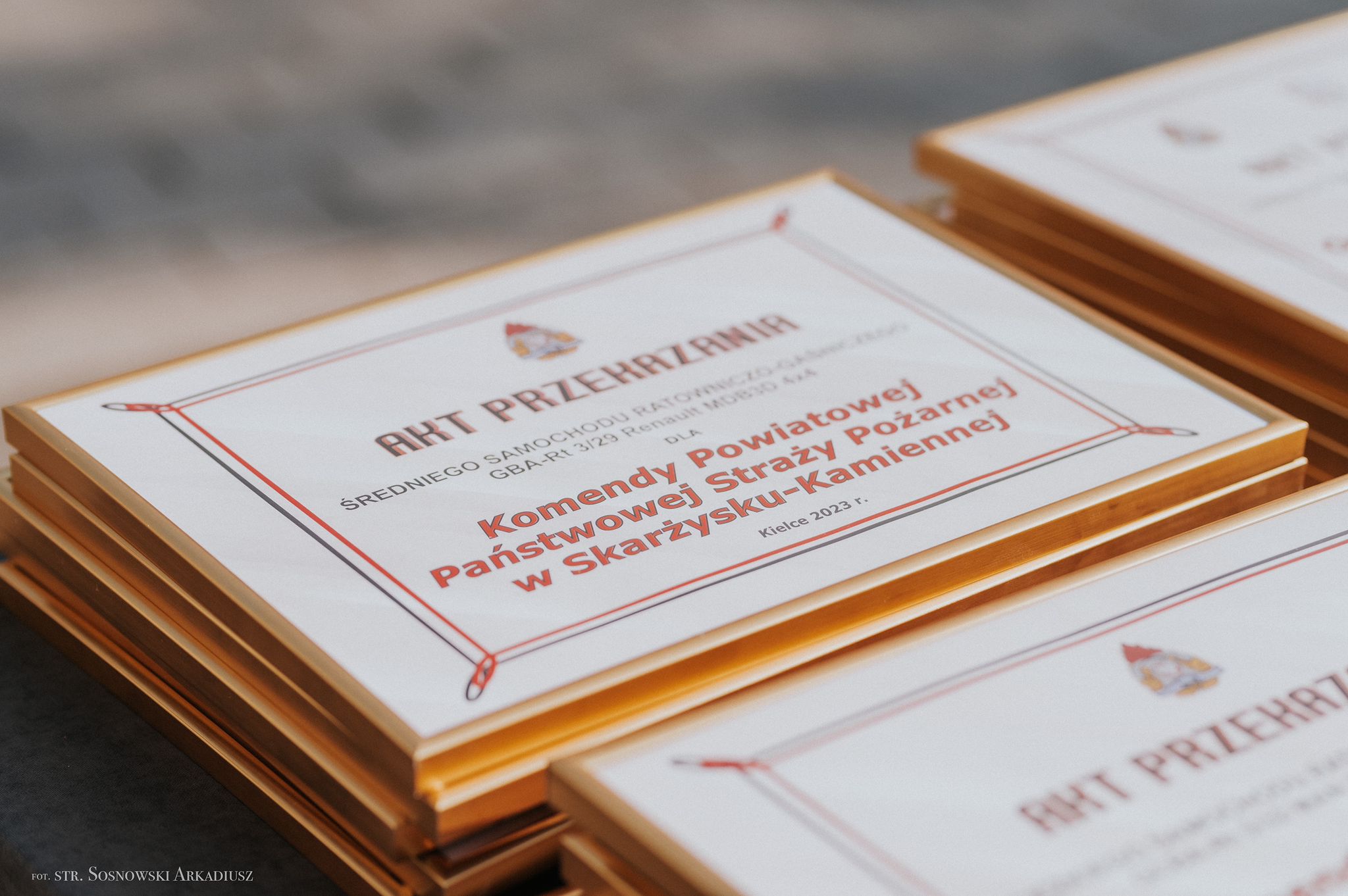 Wręczenia symbolicznych aktów przekazania dla przedstawicieli każdej doposażonej jednostki dokonali Zastępca Komendanta Głównego PSP nadbryg. Krzysztof Hejduk, Wojewoda Świętokrzyski Pan Zbigniew Koniusz, Świętokrzyski Komendant Wojewódzki PSP nadbryg. Krzysztof Ciosek oraz parlamentarzyści.