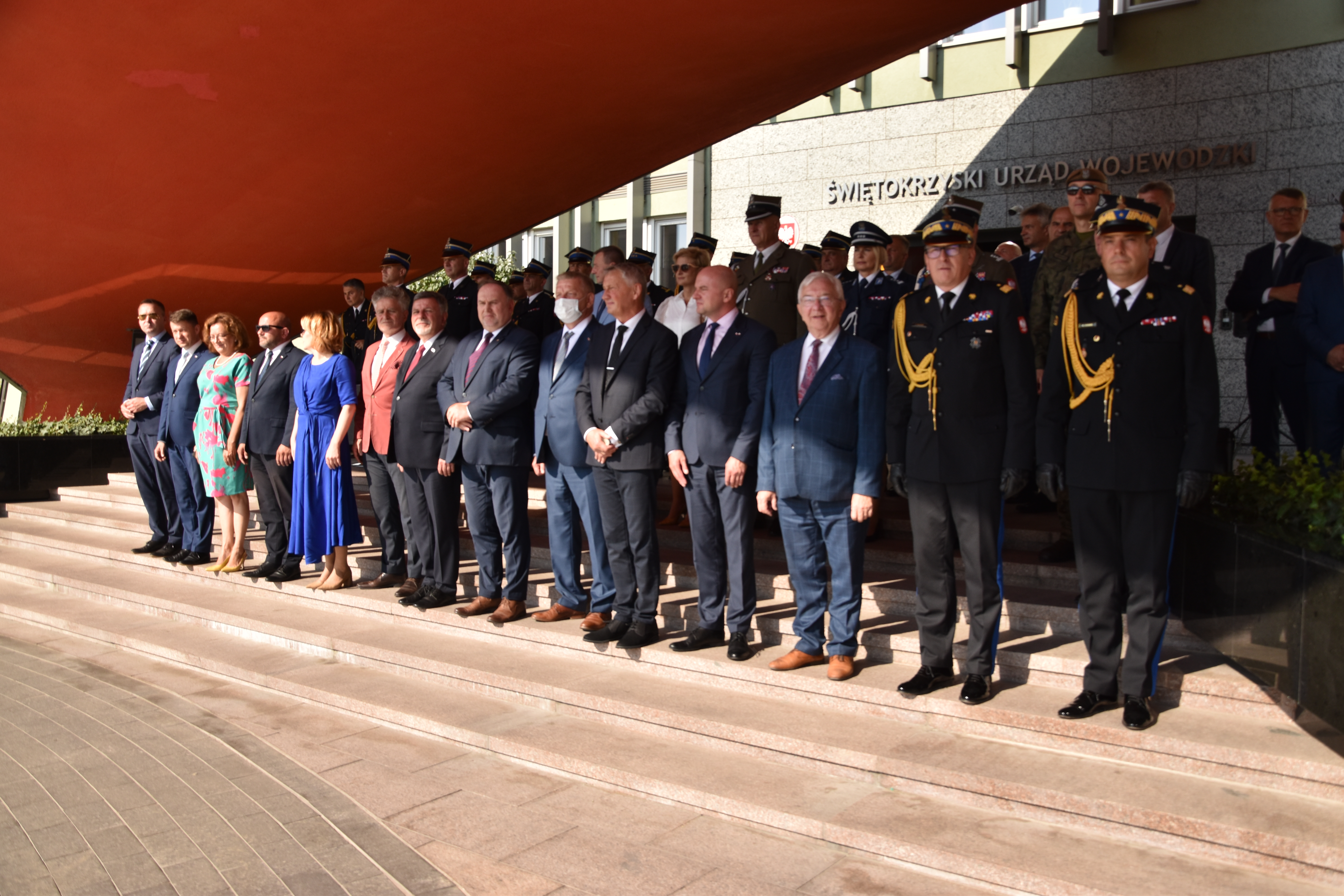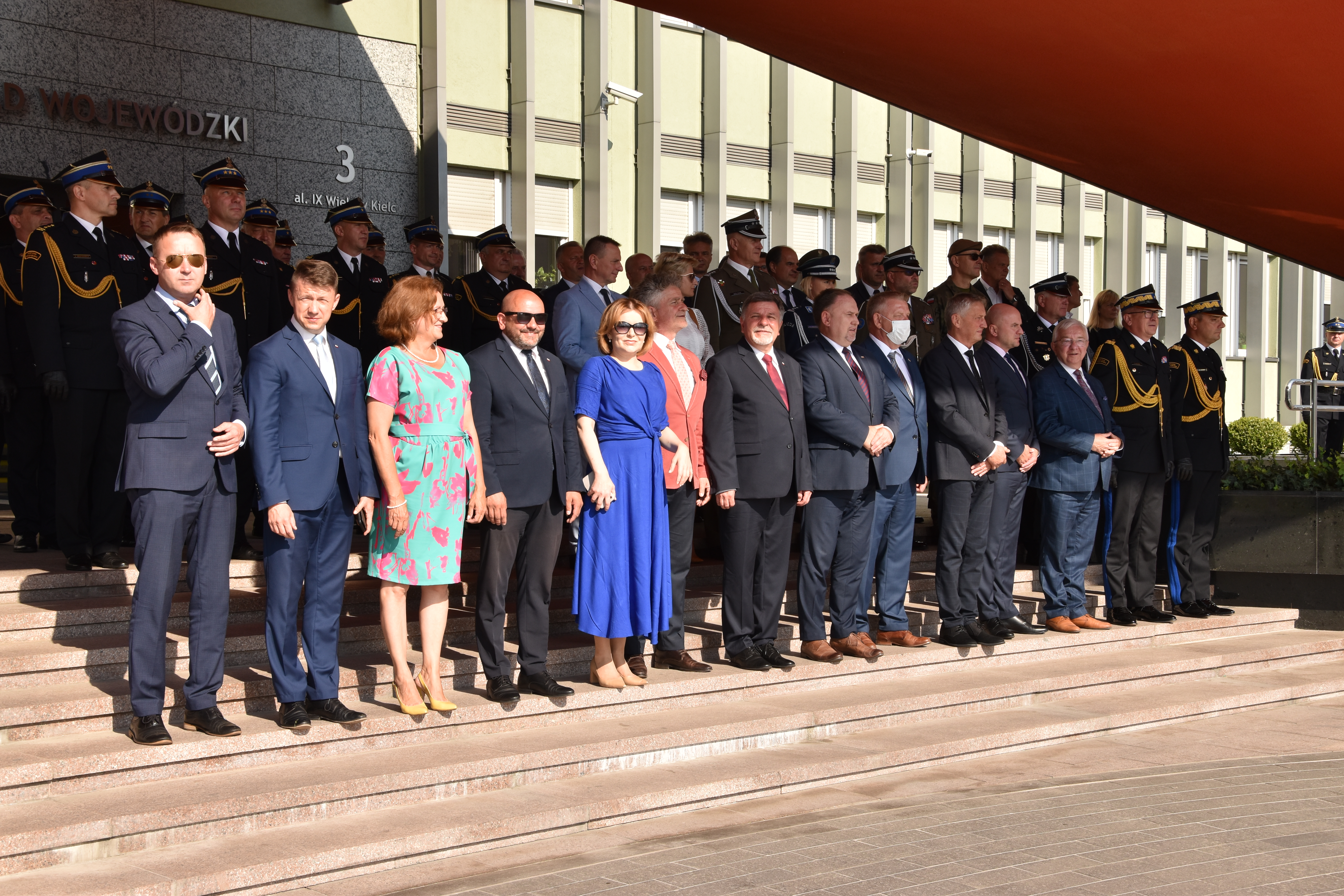 Uroczystą zbiórkę rozpoczął meldunek dowódcy uroczystości, który przyjął gość honorowy zastępca Komendanta Głównego Państwowej Straży Pożarnej nadbryg. Krzysztof Hejduk. Następnie w miejsce uroczystości wprowadzony został sztandar KW PSP Kielce, odegrano hymn państwowy i podniesiono flagę na maszt. Kolejnym punktem było powitanie gości przez gospodarza miejsca uroczystości i współorganizatora wydarzenia Wojewodę Świętokrzyskiego Zbigniewa Koniusza. W wydarzeniu udział wzięli: