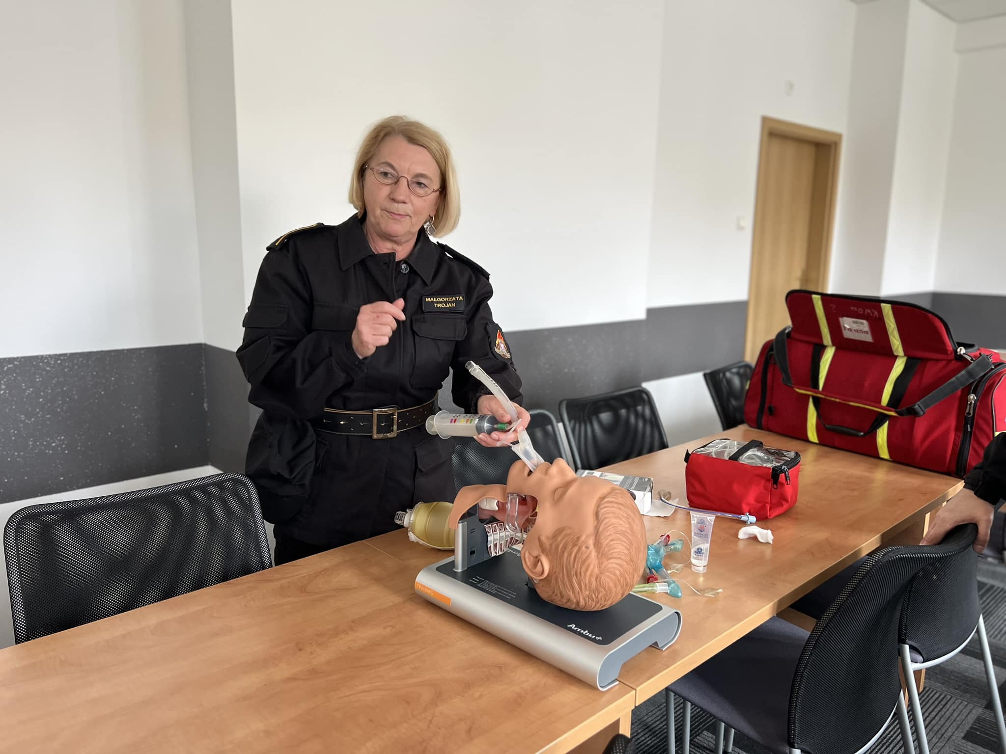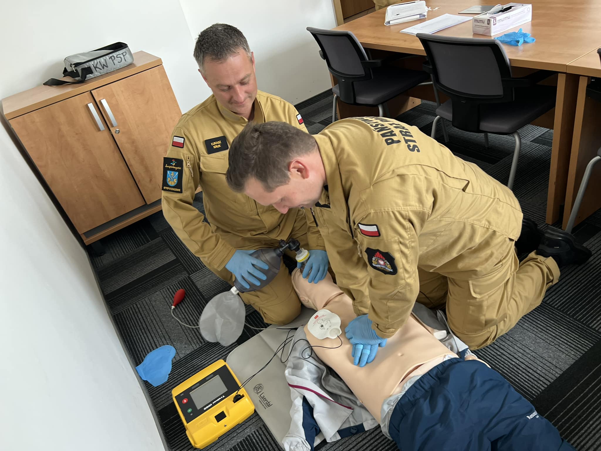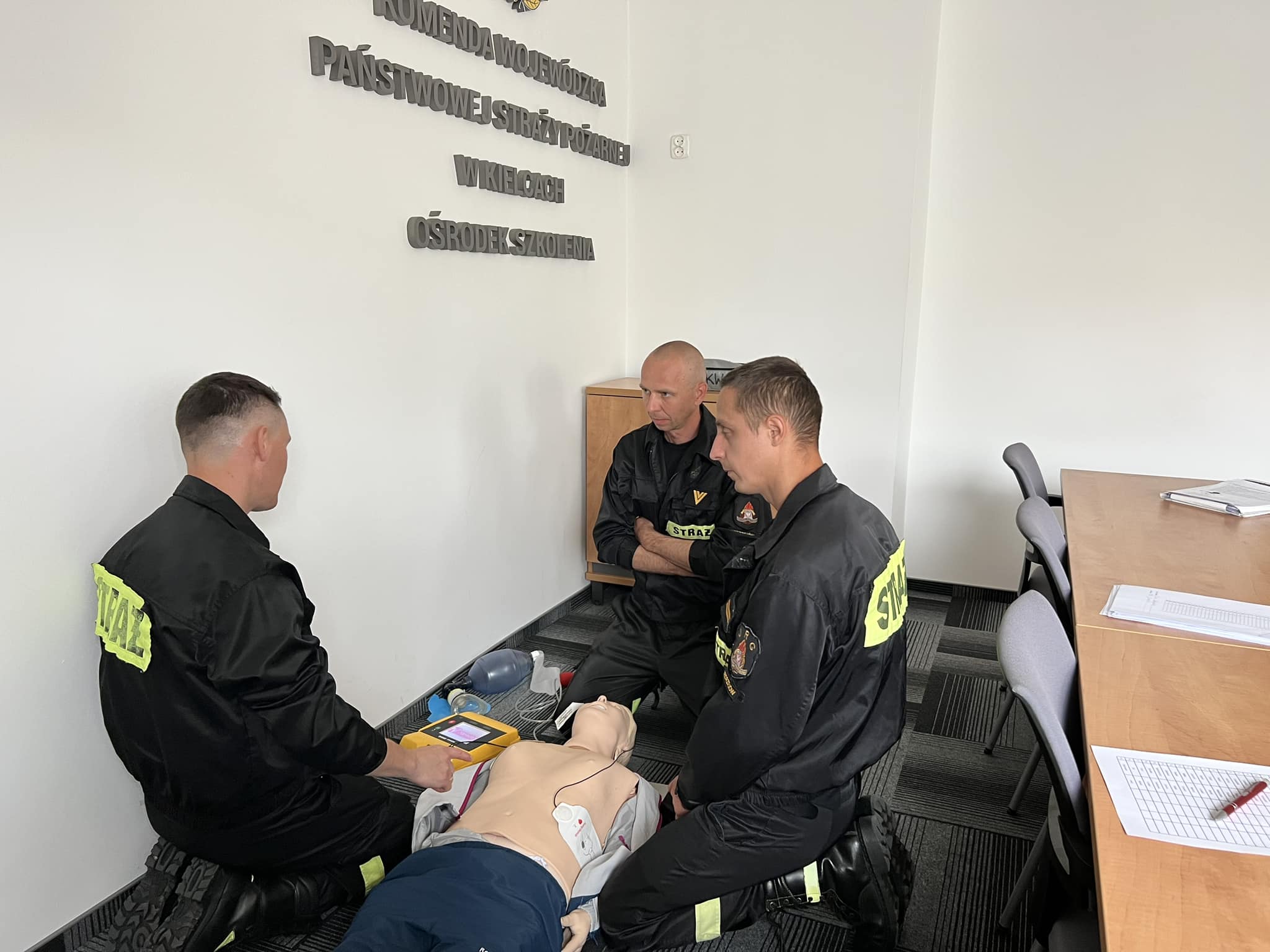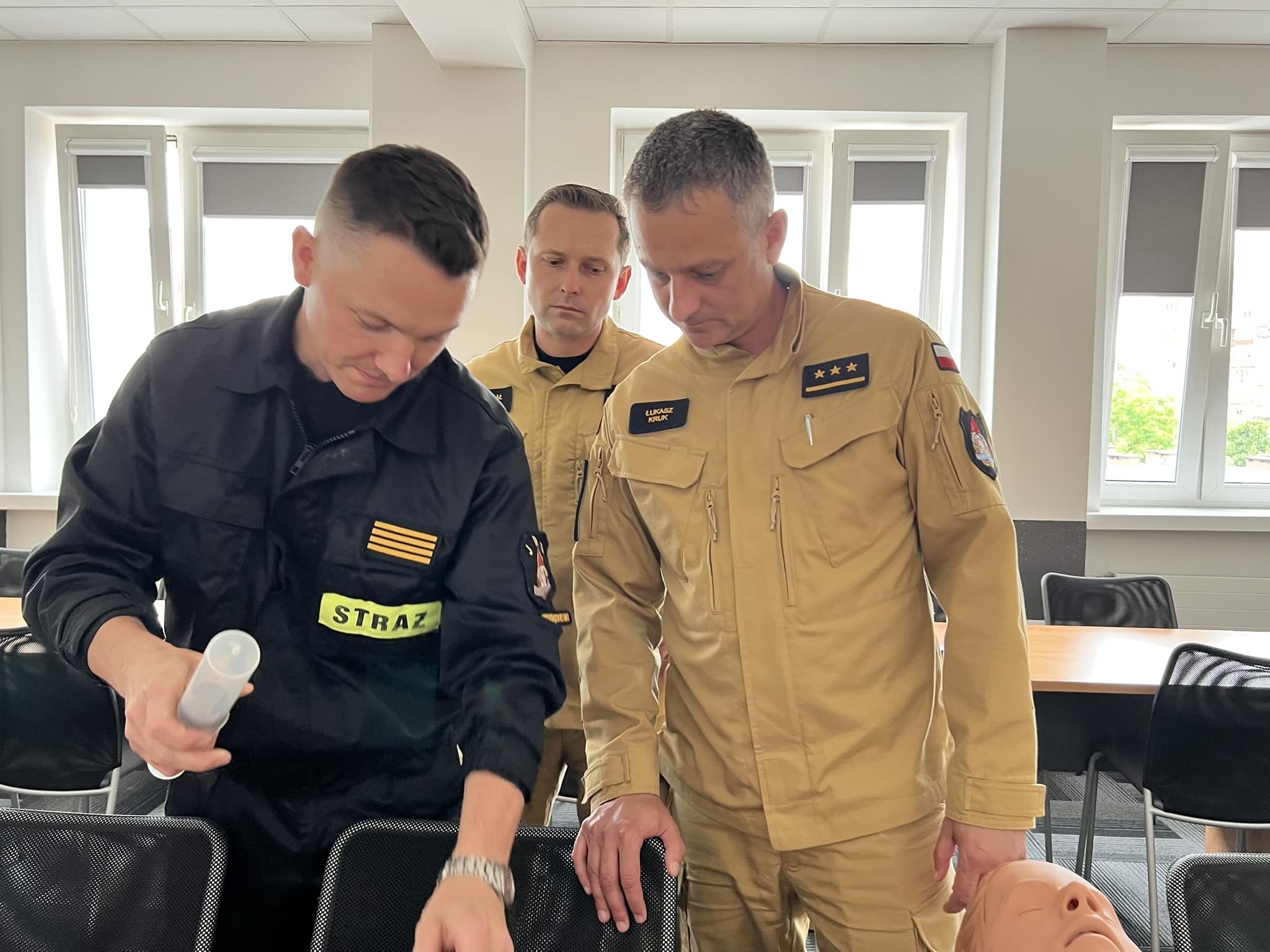 Ponadto, po egzaminie praktycznym z kwalifikowanej pierwszej pomocy 14 strażaków systemu zmianowego odbyło ćwiczenie w komorze dymowej.