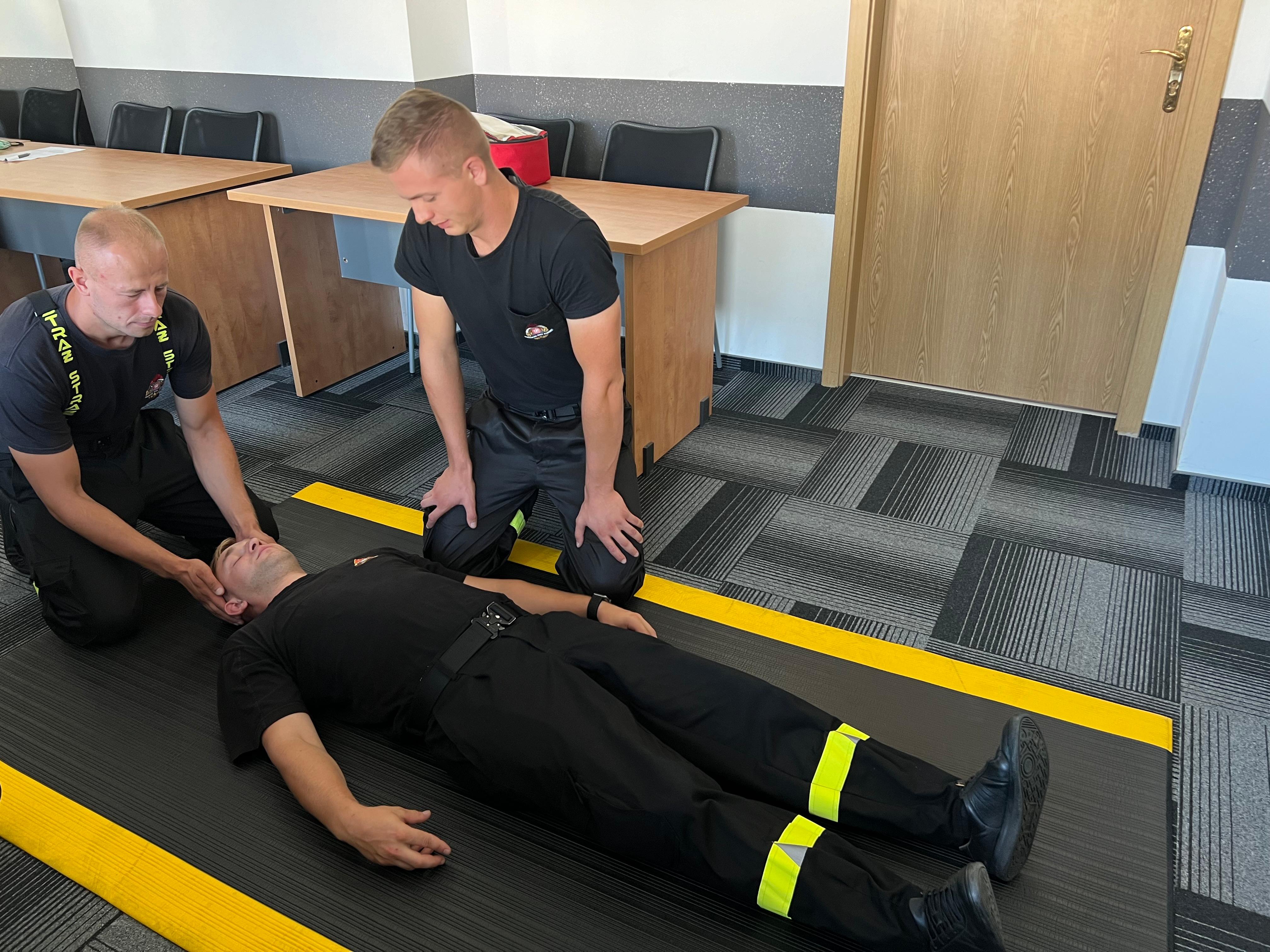 Ponadto, po egzaminie praktycznym z kwalifikowanej pierwszej pomocy 18 strażaków systemu zmianowego odbyło ćwiczenie w komorze dymowej.