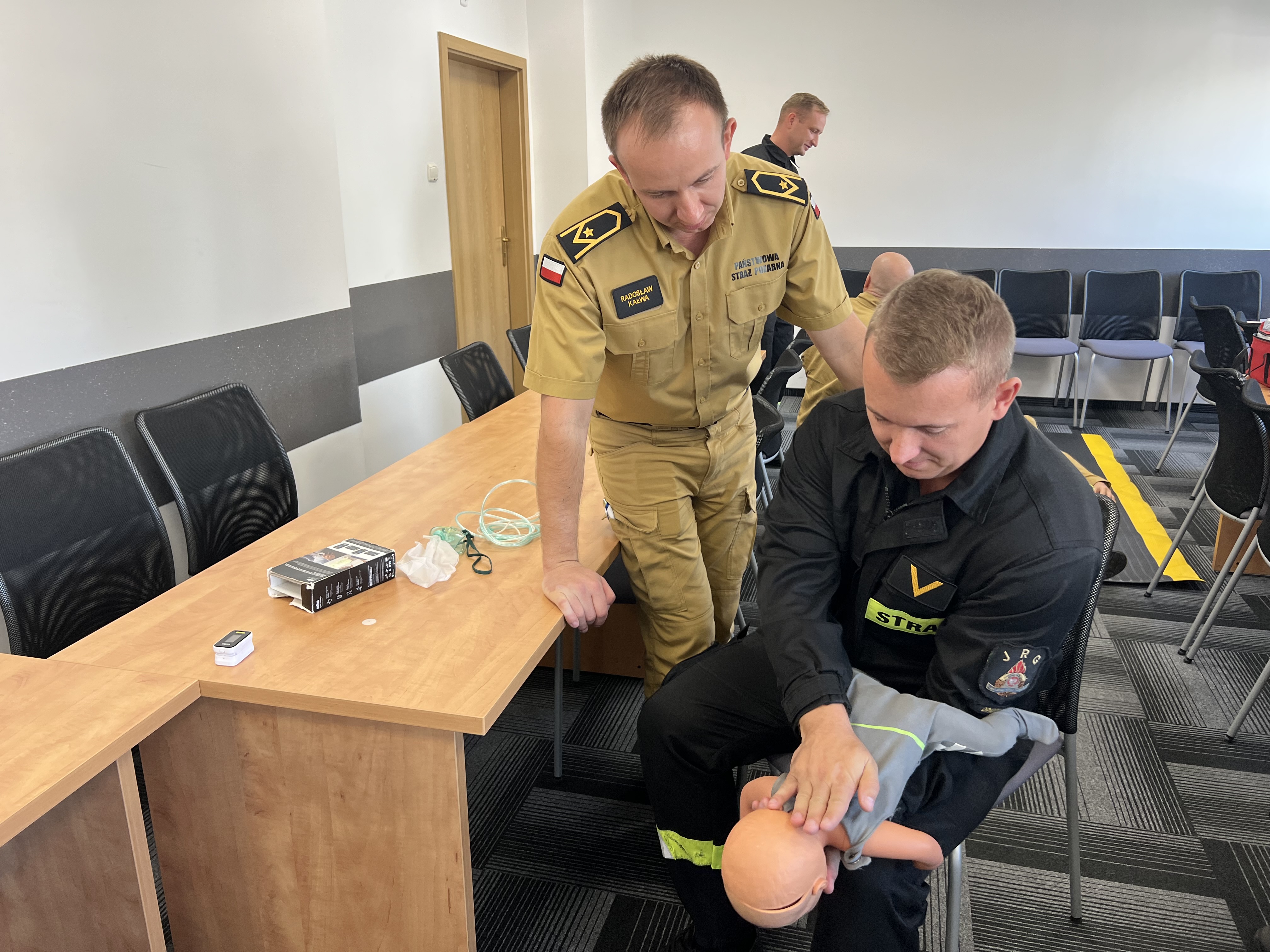 Ponadto, po egzaminie praktycznym z kwalifikowanej pierwszej pomocy 20 strażaków systemu zmianowego odbyło ćwiczenie w komorze dymowej.