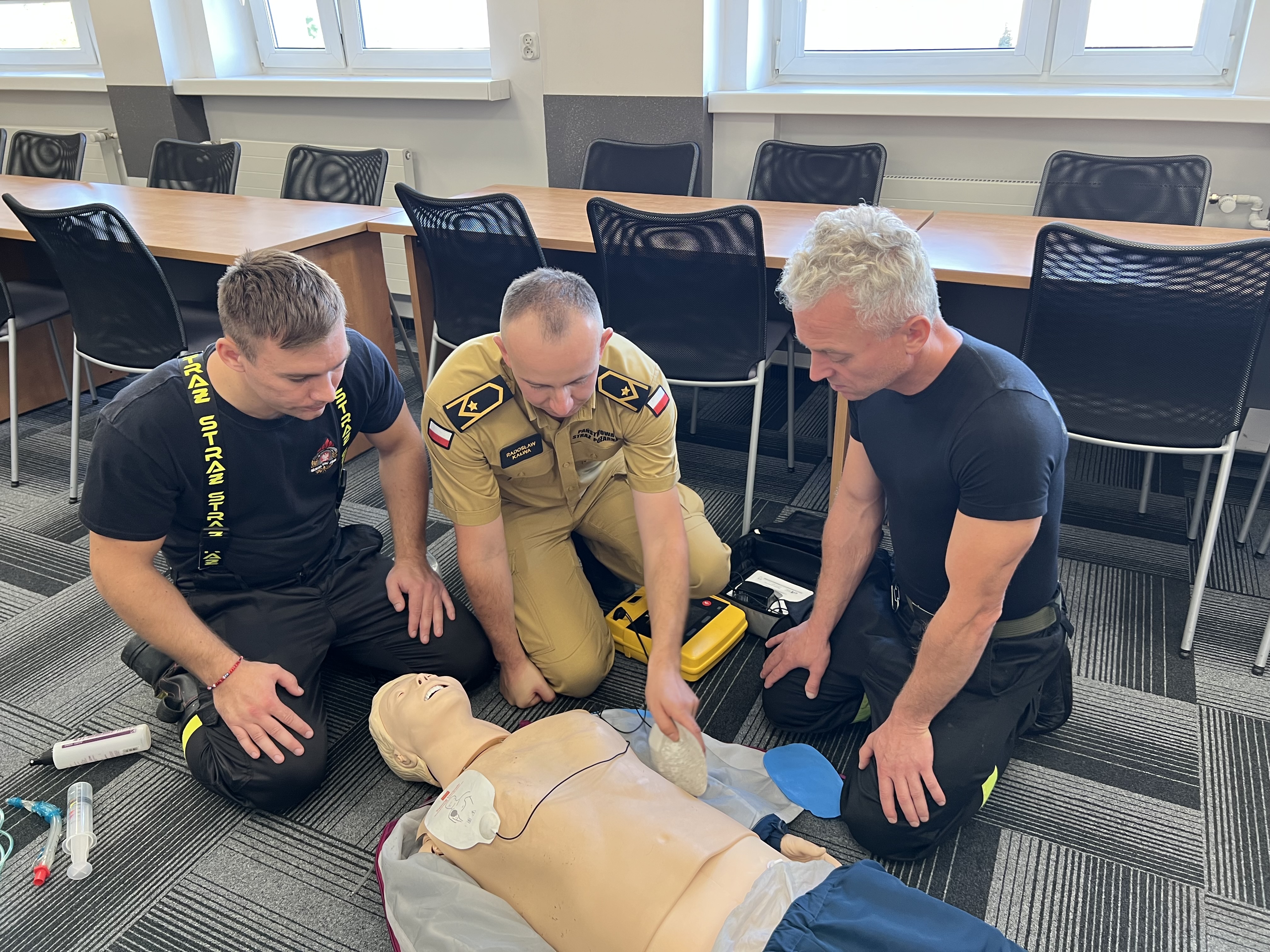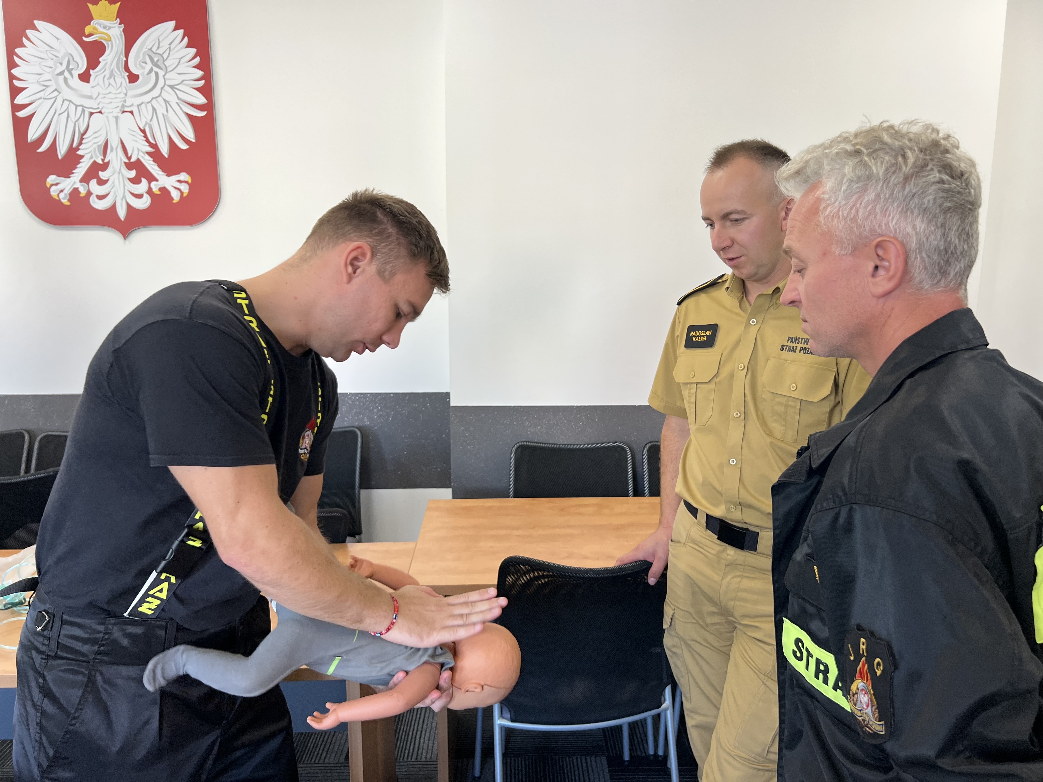Ponadto, po egzaminie praktycznym z kwalifikowanej pierwszej pomocy 18 strażaków systemu zmianowego odbyło ćwiczenie w komorze dymowej.