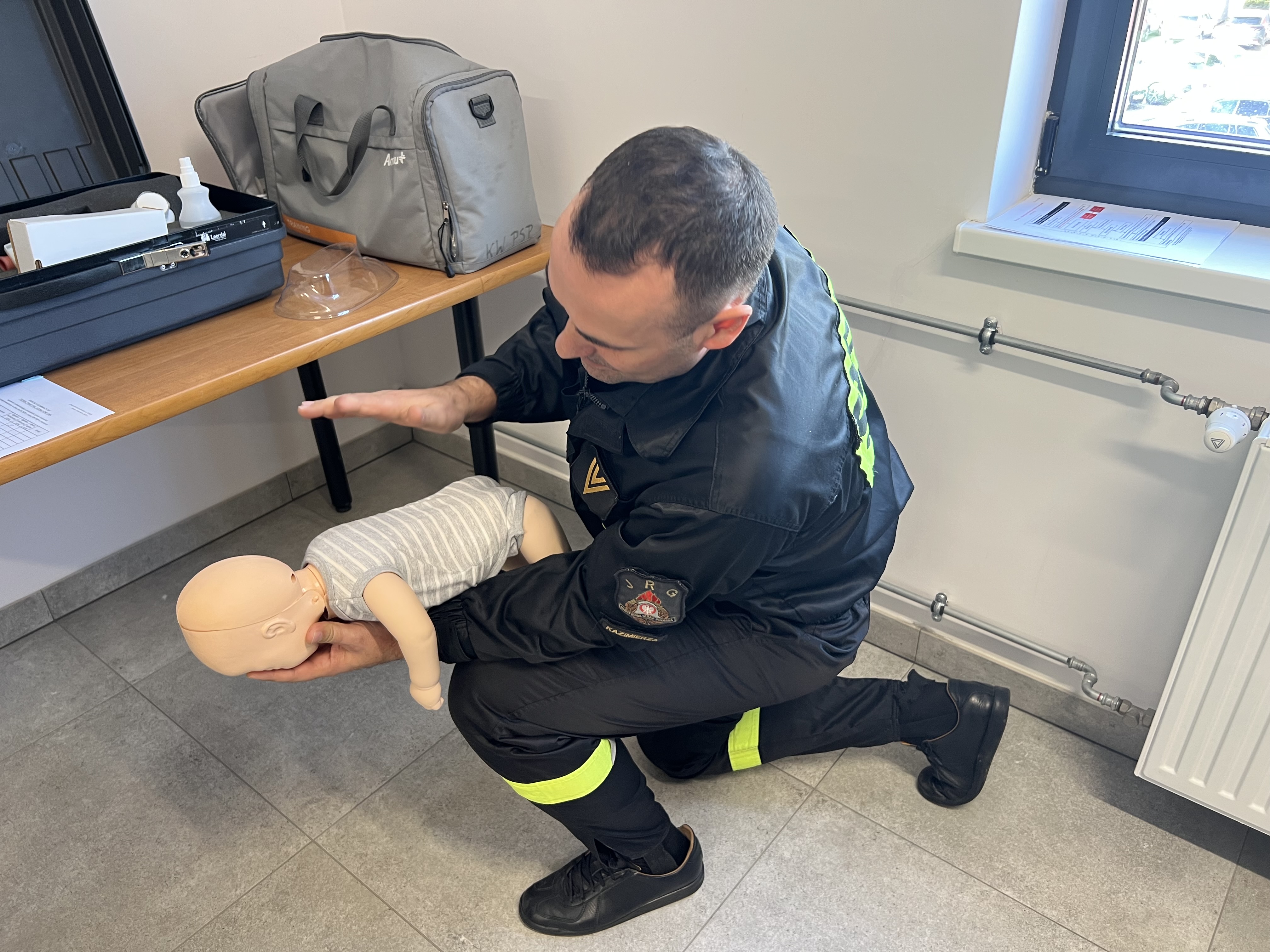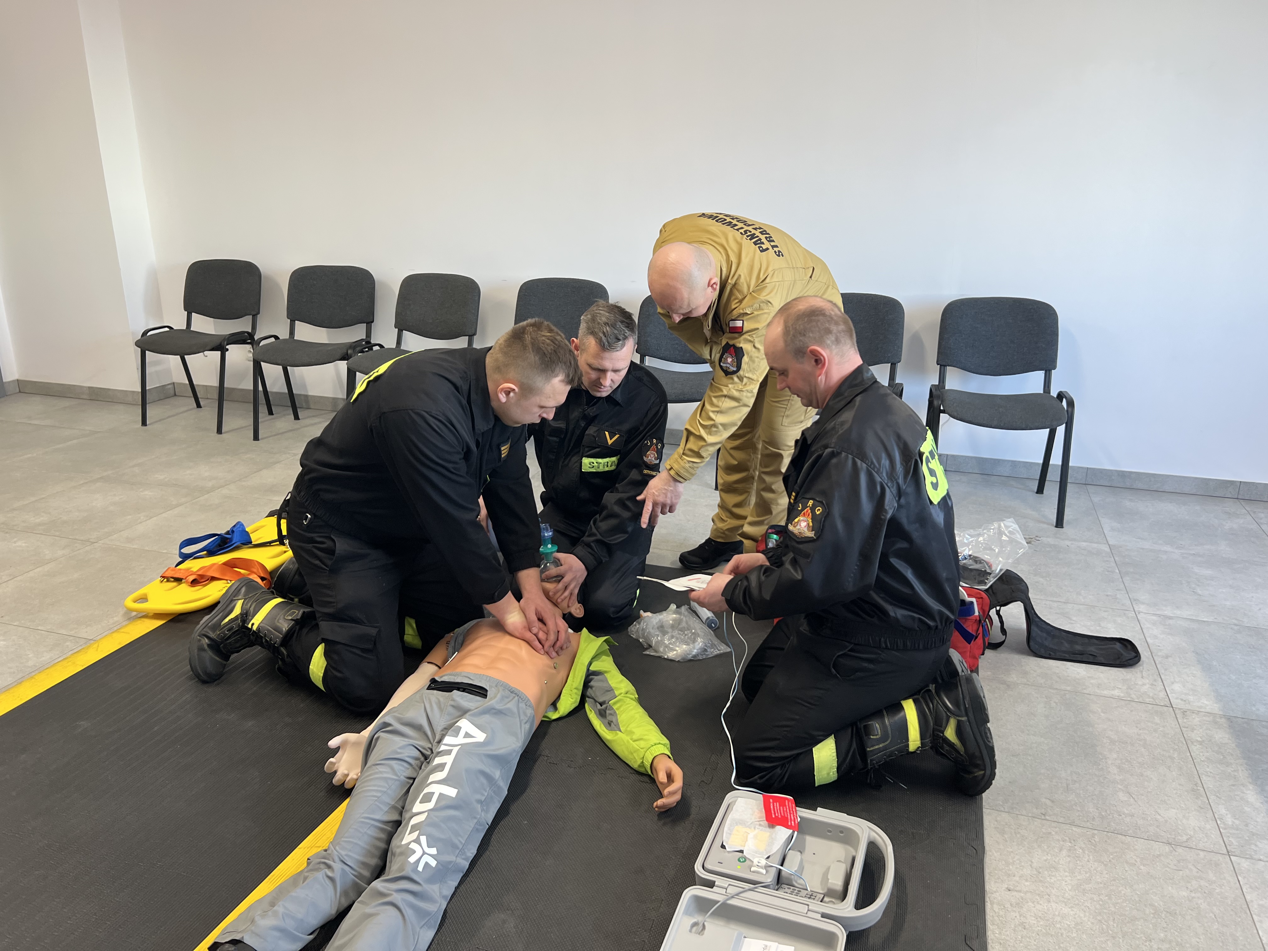 Ponadto, po egzaminie praktycznym z kwalifikowanej pierwszej pomocy 23 strażaków systemu zmianowego odbyło ćwiczenie w komorze dymowej.