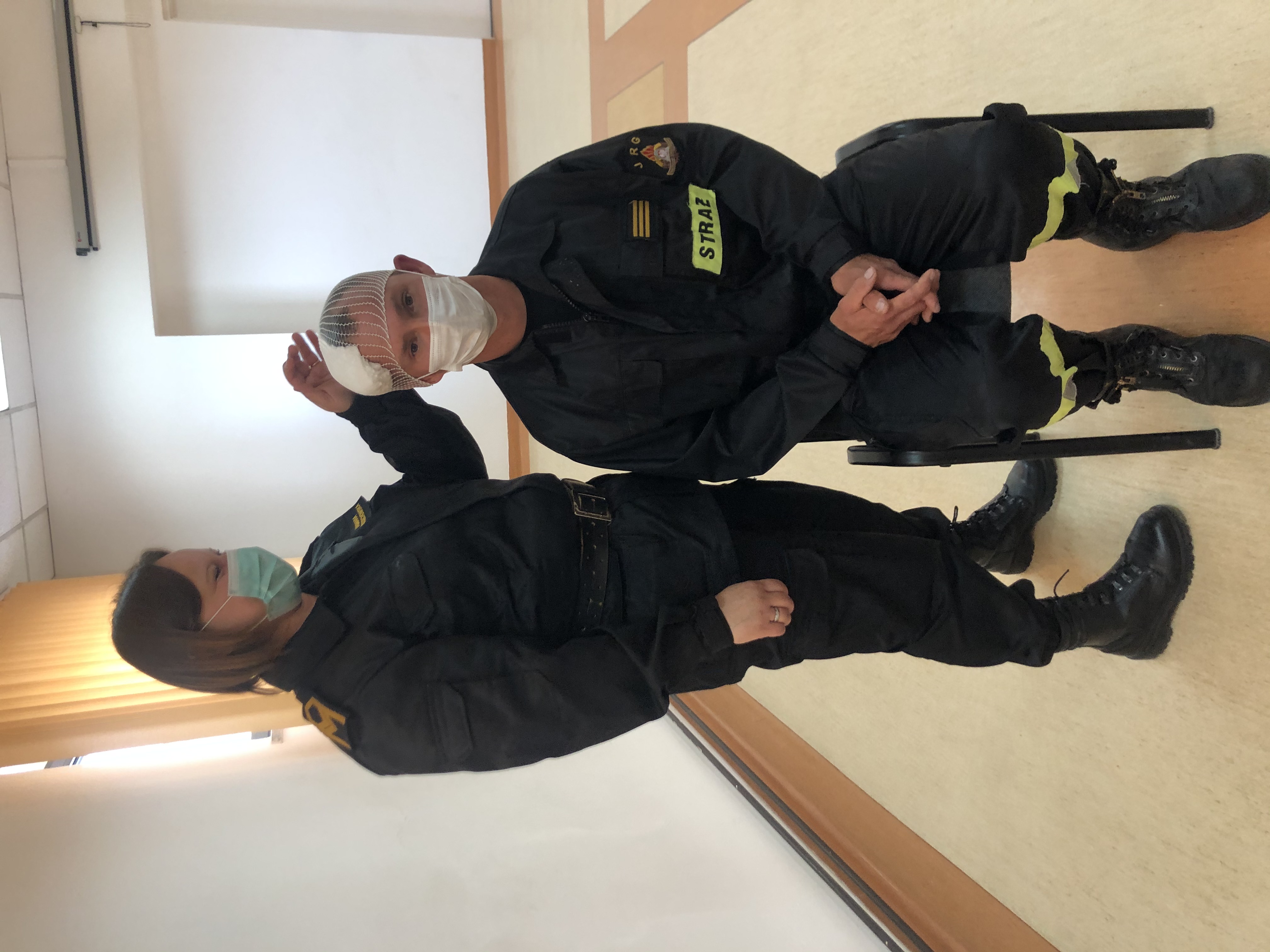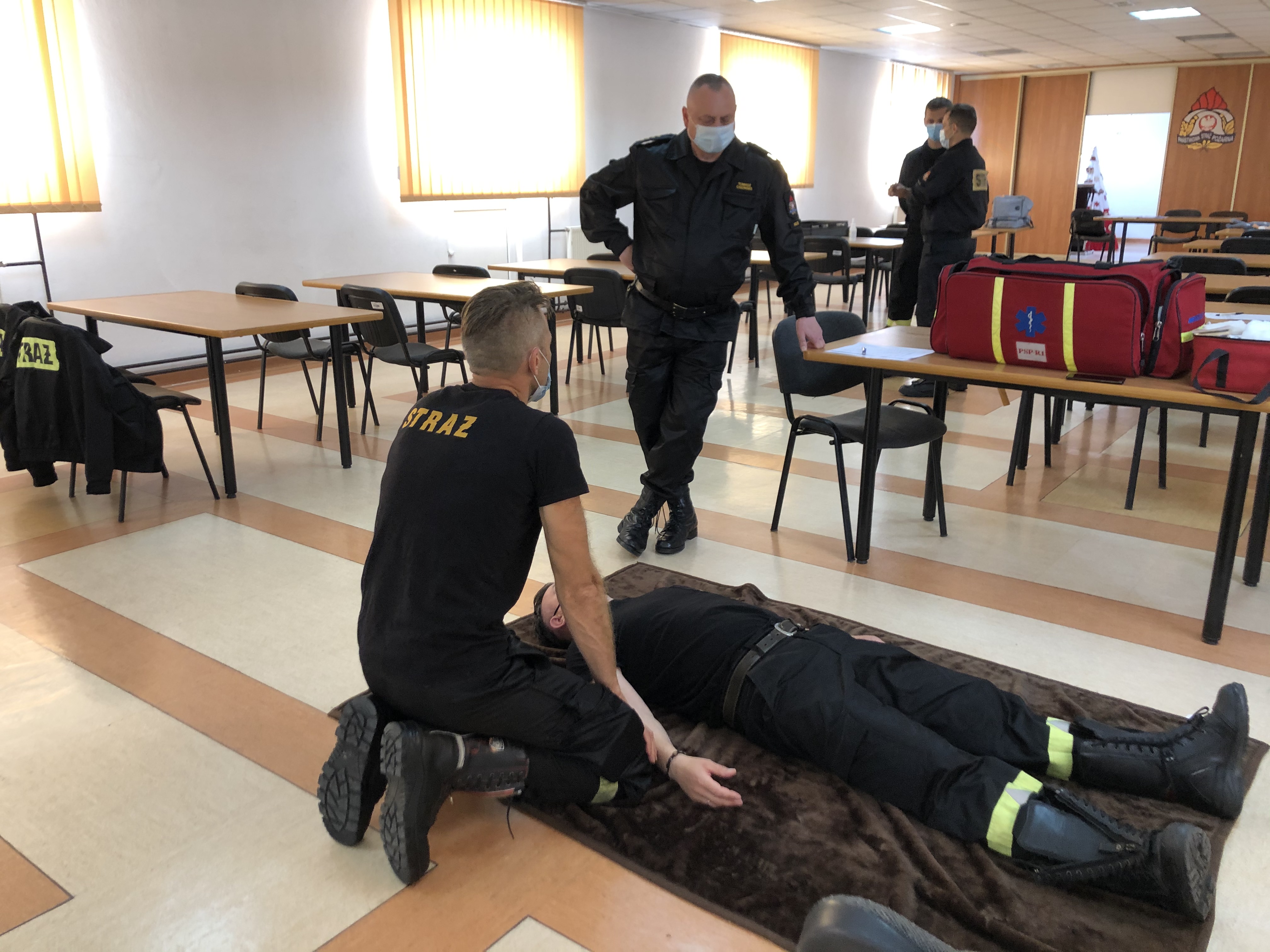 Ponadto, po egzaminie praktycznym z kwalifikowanej pierwszej pomocy 22 strażaków systemu zmianowego odbyło ćwiczenie w komorze dymowej.