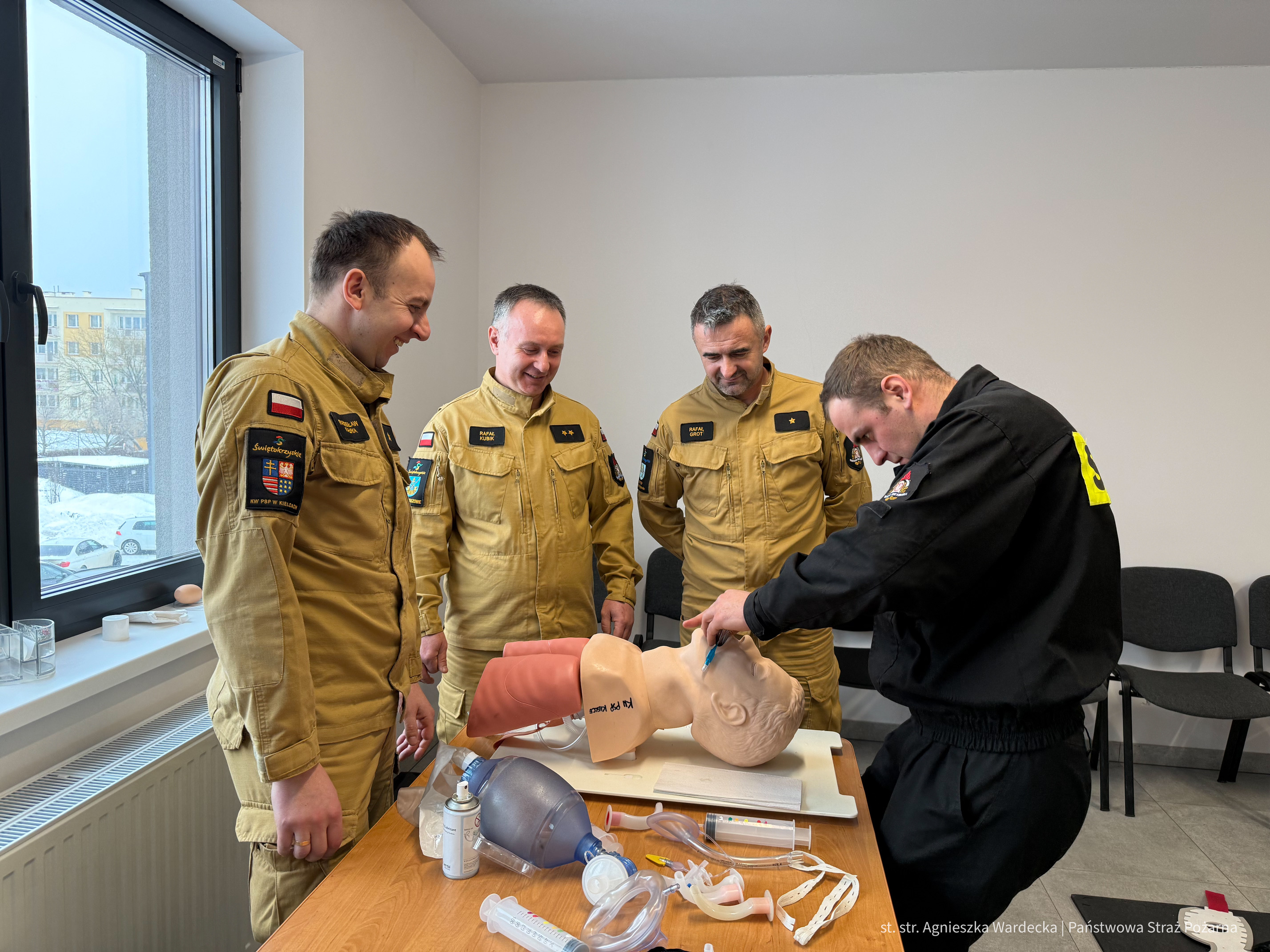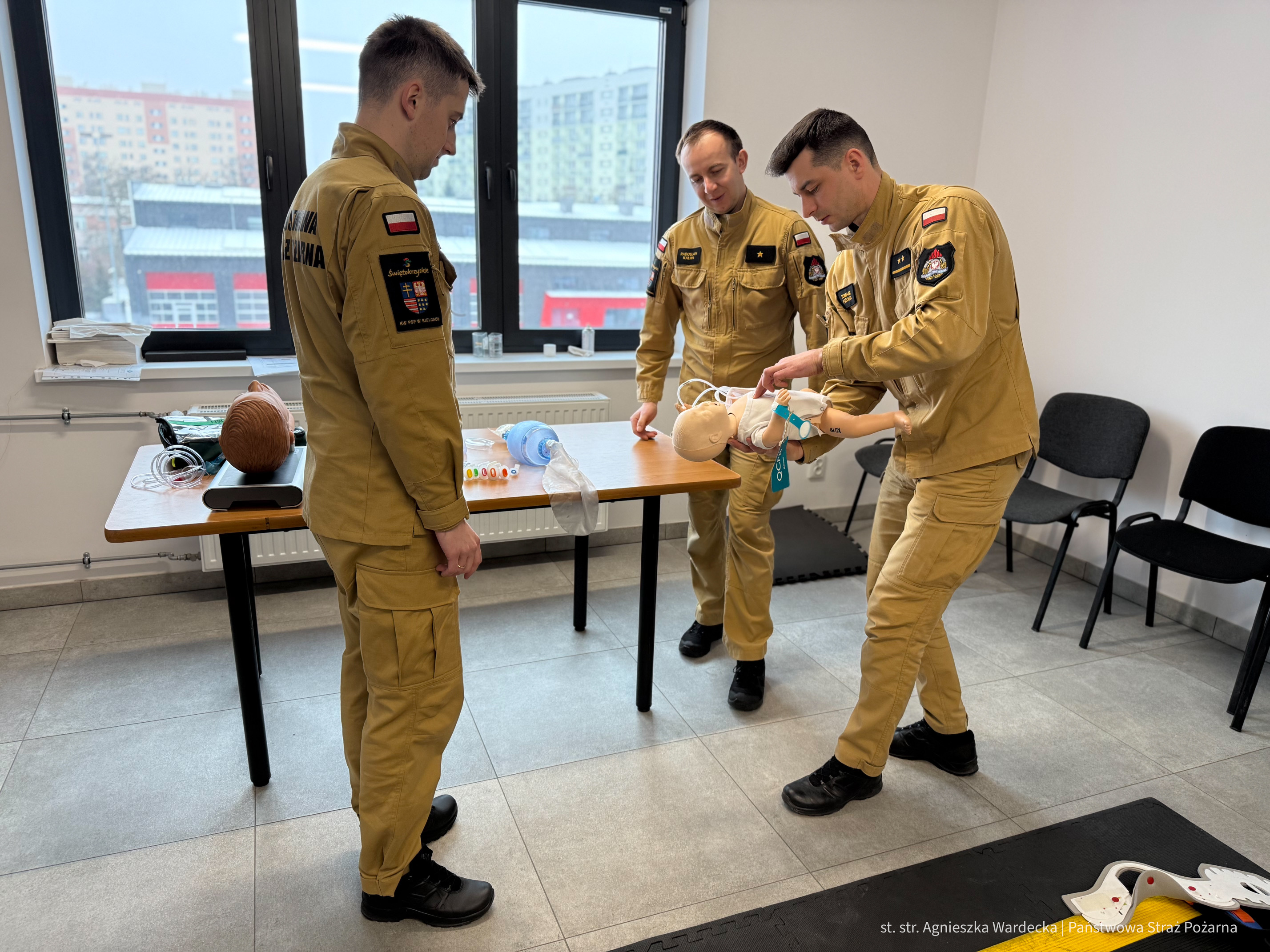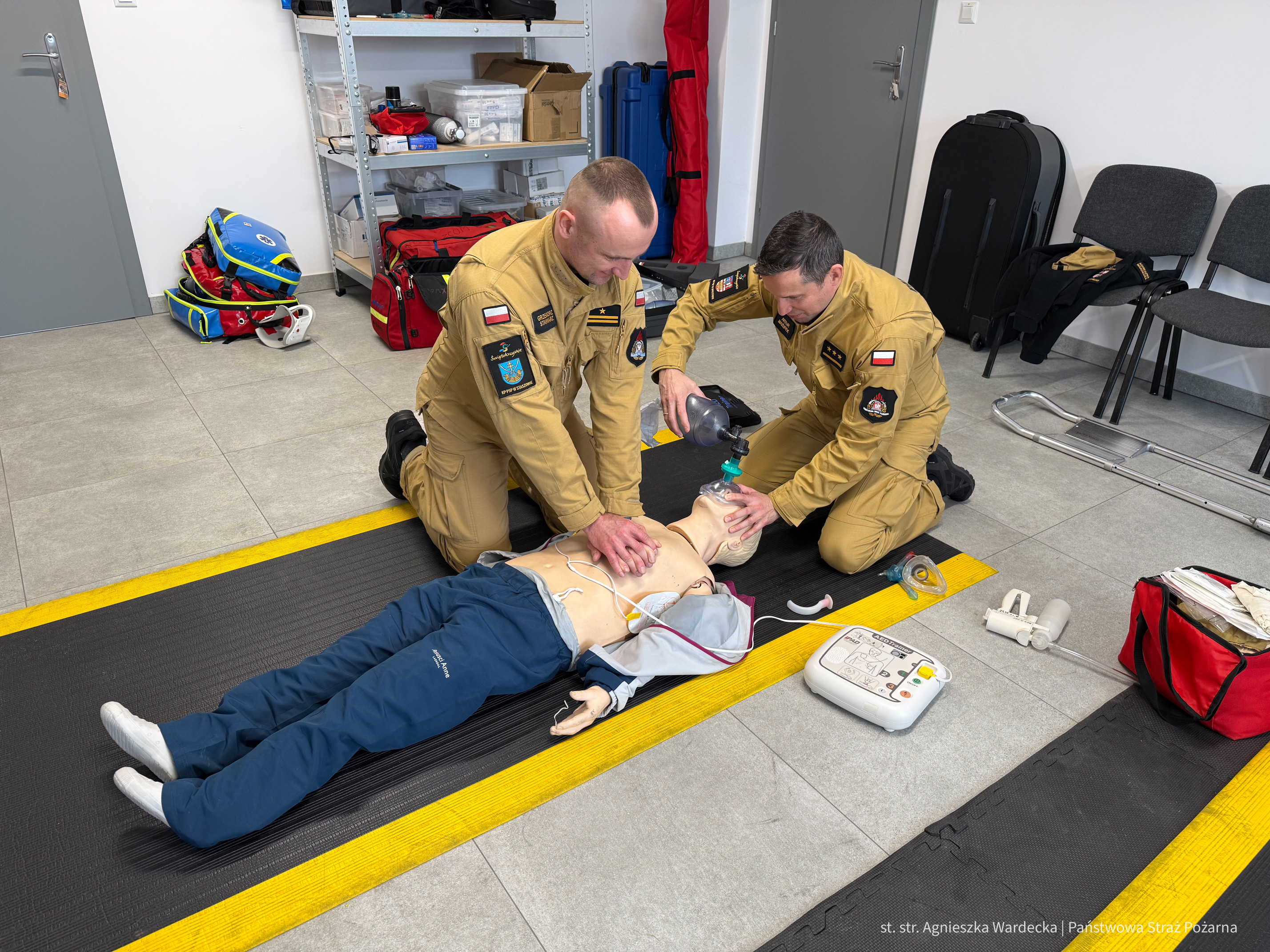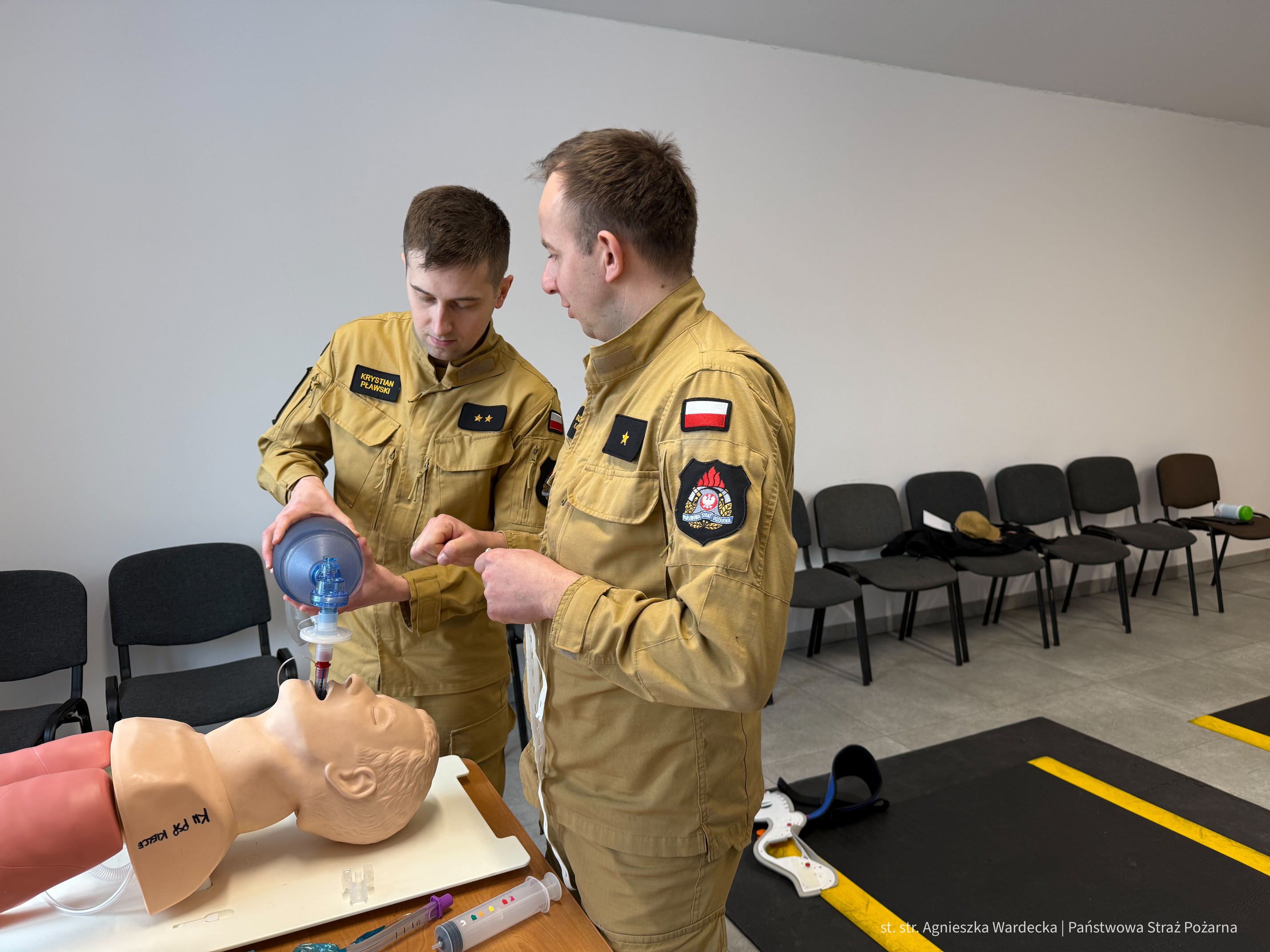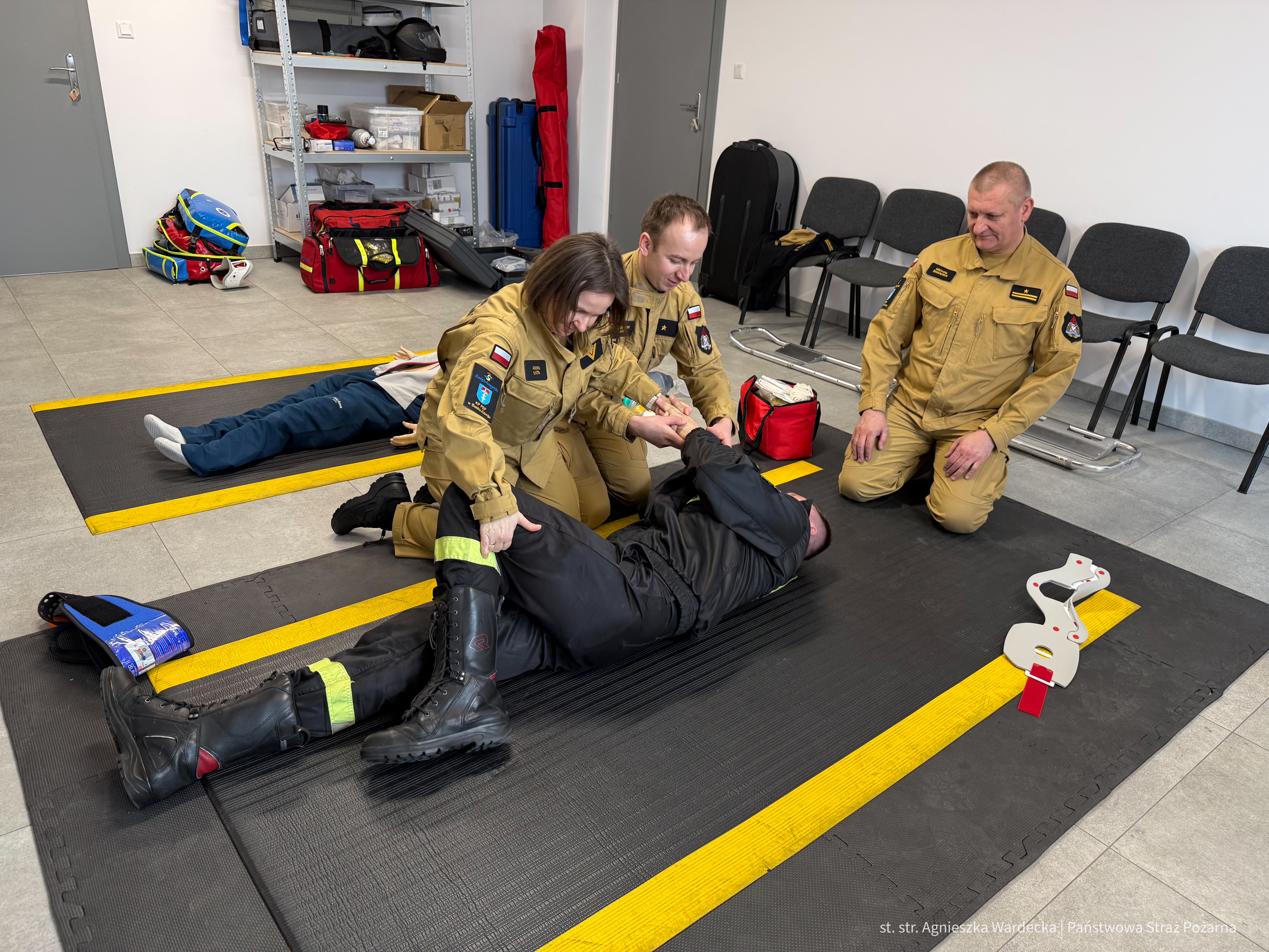 Ponadto, po egzaminie praktycznym z kwalifikowanej pierwszej pomocy, 28 strażaków systemu zmianowego odbyło ćwiczenie w komorze dymowej.