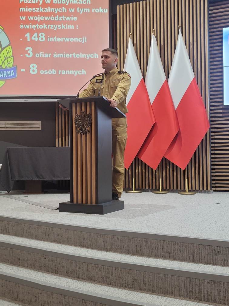 Na wydarzenie zorganizowane w Świętokrzyskim Urzędzie Wojewódzkim licznie przybyli zaproszeni seniorzy, dla których przedstawiciele służb przygotowali warsztaty szkoleniowe. Funkcjonariusz Komendy Wojewódzkiej PSP w Kielcach st. kpt. Marcin Bajur omawiał zagrożenia związane z pożarmi w budynkach mieszkalnych oraz zatruciem tlenkiem węgla.
