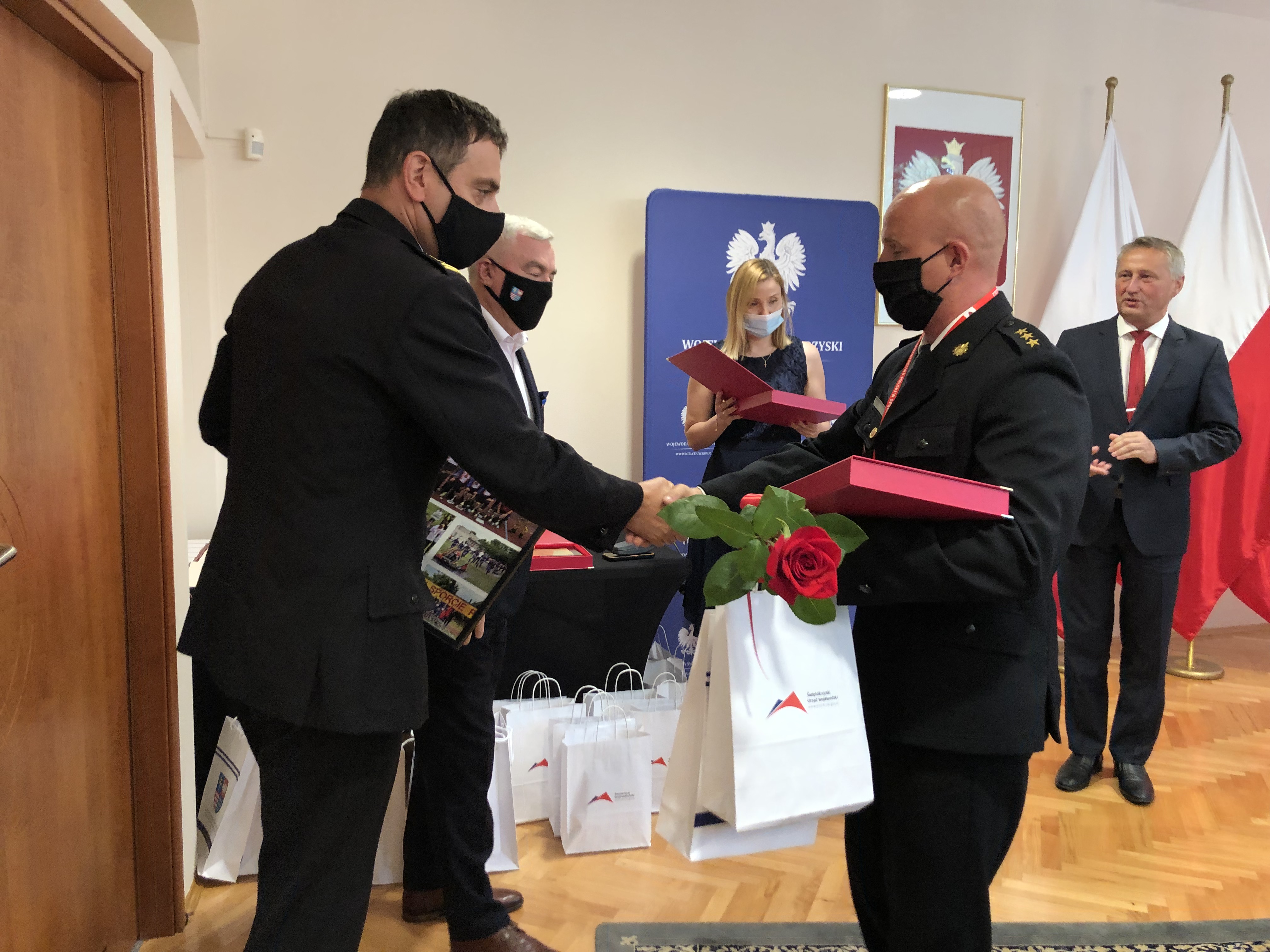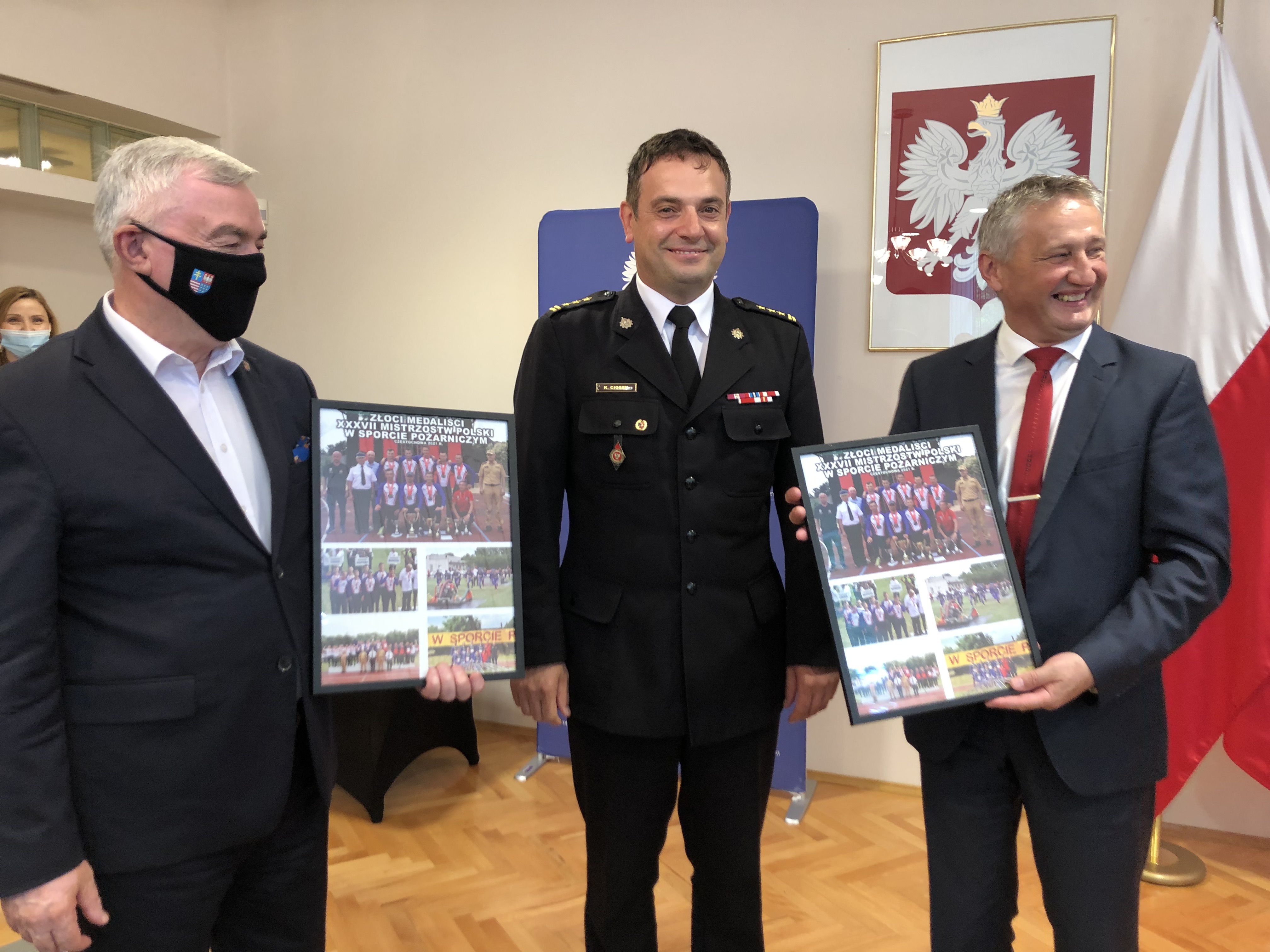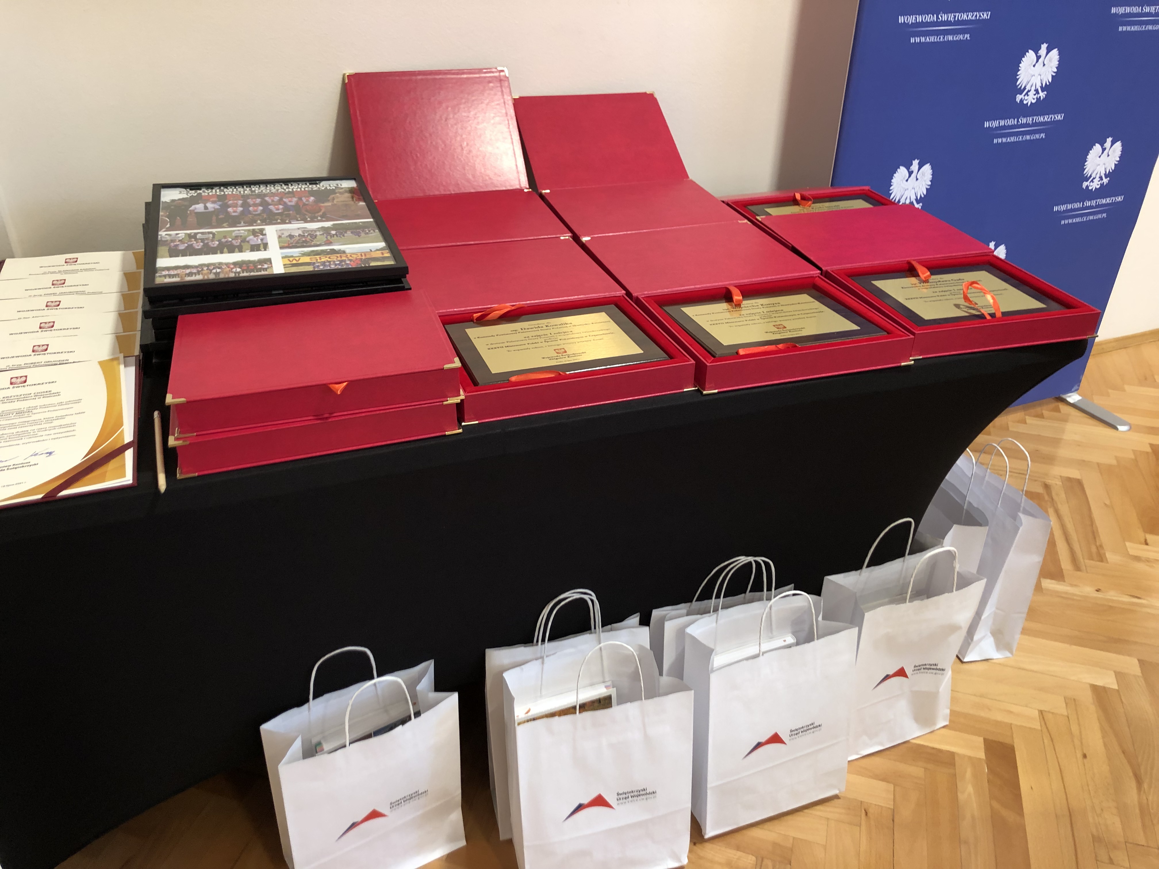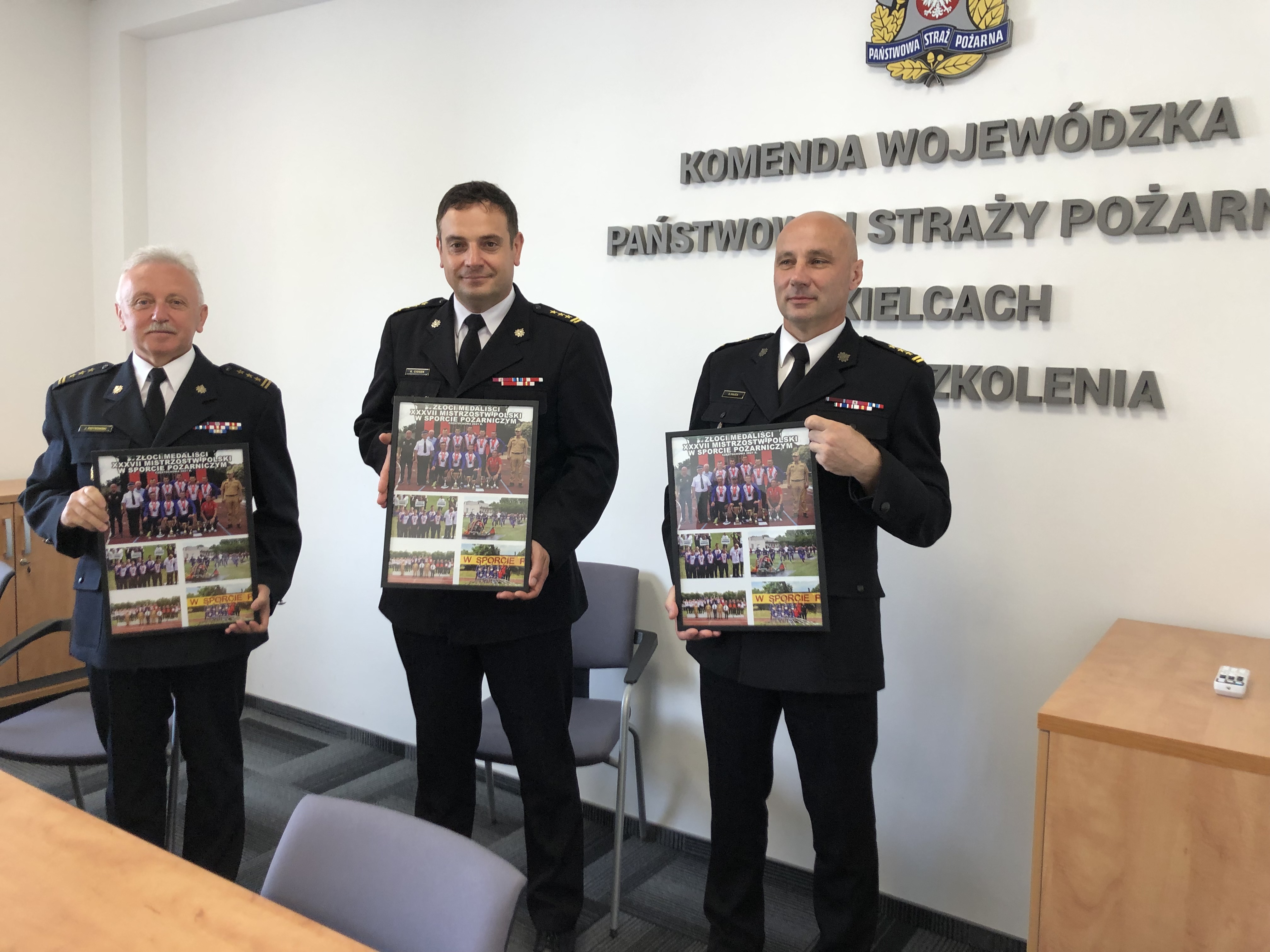 16.07.2021 w Świętokrzyskim Urzędzie Wojewódzkim w Kielcach odbyło się spotkanie władz województwa świętokrzyskiego ze złotymi medalistami XXXVII Mistrzostw Polski w Sporcie Pożarniczym. Wojewoda Świętokrzyski Zbigniew Koniusz oraz Marszałek Województwa Świętokrzyskiego Andrzej Bętkowski pogratulowali sportowcom historycznego sukcesu i podziękowali za reprezentowanie woj. świętokrzyskiego. Na pamiątkę wydarzenia sportowcy otrzymali okolicznościowe upominki.