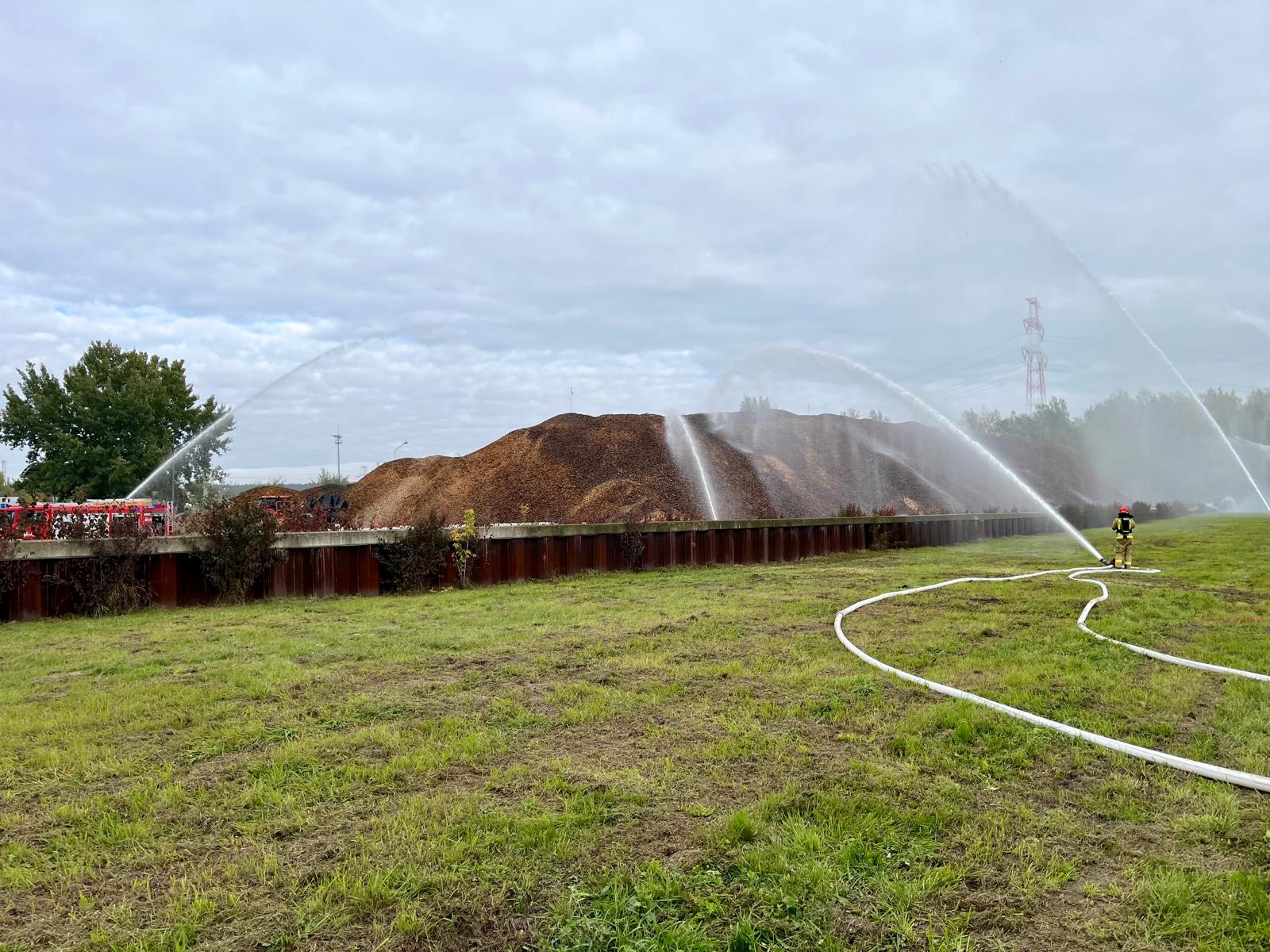 Ten epizod płynnie przeszedł w kolejny, kiedy to ogień rozprzestrzenił się na pryzmę biomasy o wymiarach 60 m na 20 m, ale jej usytuowanie stwarzało realne zagrożenie dla kolejnej, znacznie większej pryzmy zgromadzonej biomasy. Strażacy, którzy walczyli z ogniem znaleźli nieprzytomnego mężczyznę. Wdrożyli procedury KPP w stosunku do poszkodowanego i przekazali go służbom medycznym. Niekorzystne warunki atmosferyczne oraz niewystarczające siły i środki spowodowały, że pożar rozprzestrzenia się na pryzmę biomasy. Dodatkowo w tym rejonie dochodzi do zderzenia samochodu osobowego z koparką, w aucie zostają uwięzione osoby. Strażacy prowadzili gaszenie pożaru oraz chronili zagrożony drzewostan, budowali magistralę zapewniającą wymaganą ilość środka gaśniczego, wydobyli osobę poszkodowaną z pojazdu i udzielili mu niezbędnej pomocy. Tutaj zaangażowani 49 strażackich zastępów i ponad 130 ratowników.