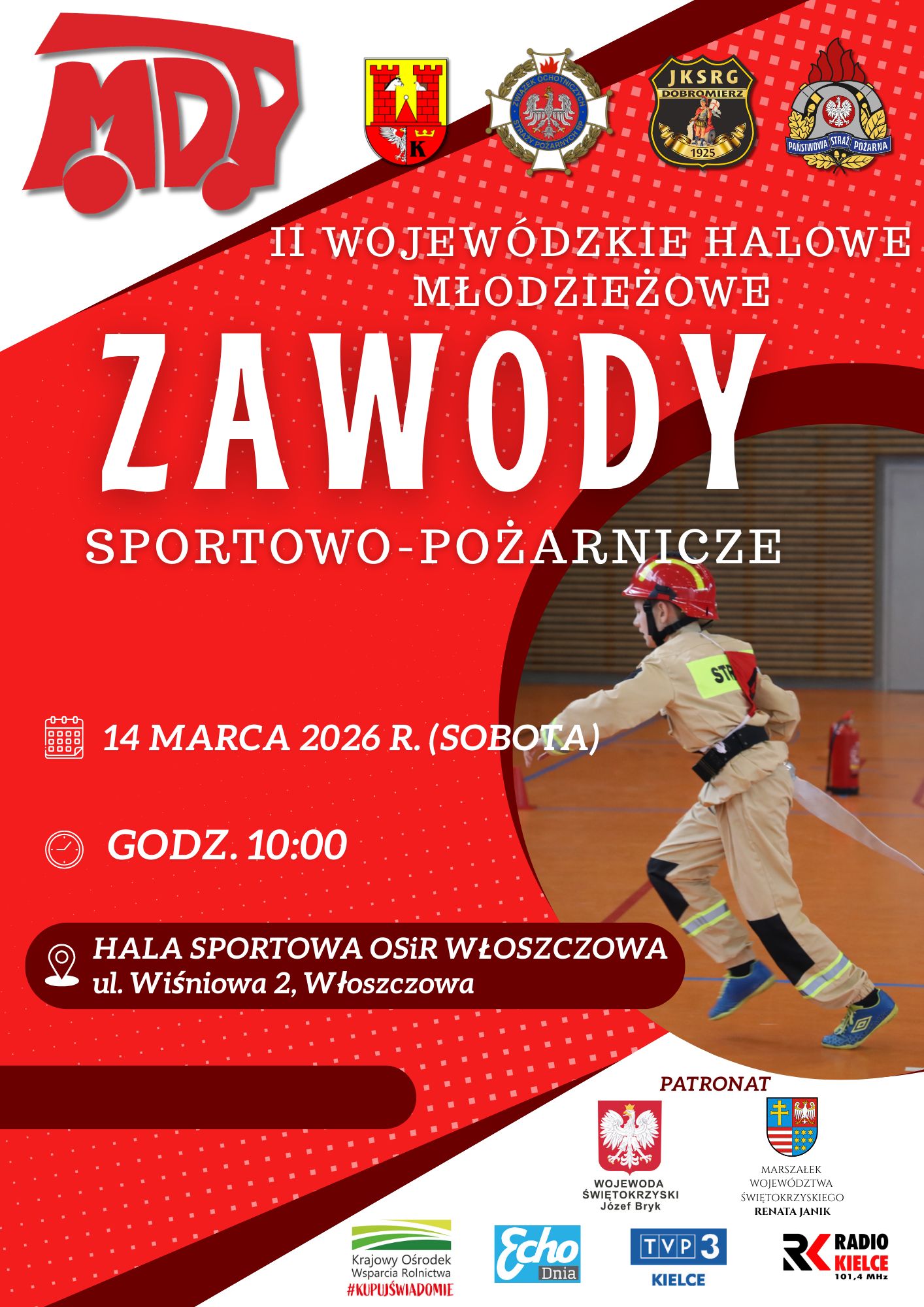 14 marca 2026 roku o godzinie 10:00 w Hali Sportowej OSiR we Włoszczowie odbędą się II Halowe Wojewódzkie Młodzieżowe Zawody Sportowo-Pożarnicze.