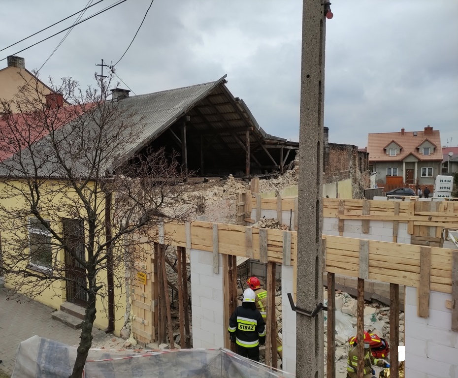 Po przybyciu na miejsce zdarzenia zastępów straży pożarnej kierujący działaniem ratowniczym stwierdził zawalenie się ściany szczytowej budynku mieszkalnego w wyniku czego dwie osoby prowadzące prace budowlane na sąsiedniej posesji zostały poszkodowane. Działania straży pożarnej polegały na zabezpieczeniu miejsca akcji oraz do czasu przybycia na miejsce Zespołów Ratownictwa Medycznego udzieleniu kwalifikowanej pierwszej pomocy dwóm mężczyznom poszkodowanym w tym zdarzeniu. Równocześnie przystąpiono do sprawdzania wnętrza uszkodzonego budynku mieszkalnego. Ze względu na stan obiektu, niebezpieczeństwo dalszego zawalenia budynku, z jego pomieszczeń ewakuowano mężczyznę. Dalsze działania strażaków-ratowników polegały na rozebraniu uszkodzonych rusztowań oraz przeszukaniu gruzowiska celem wykluczenia innych poszkodowanych osób.