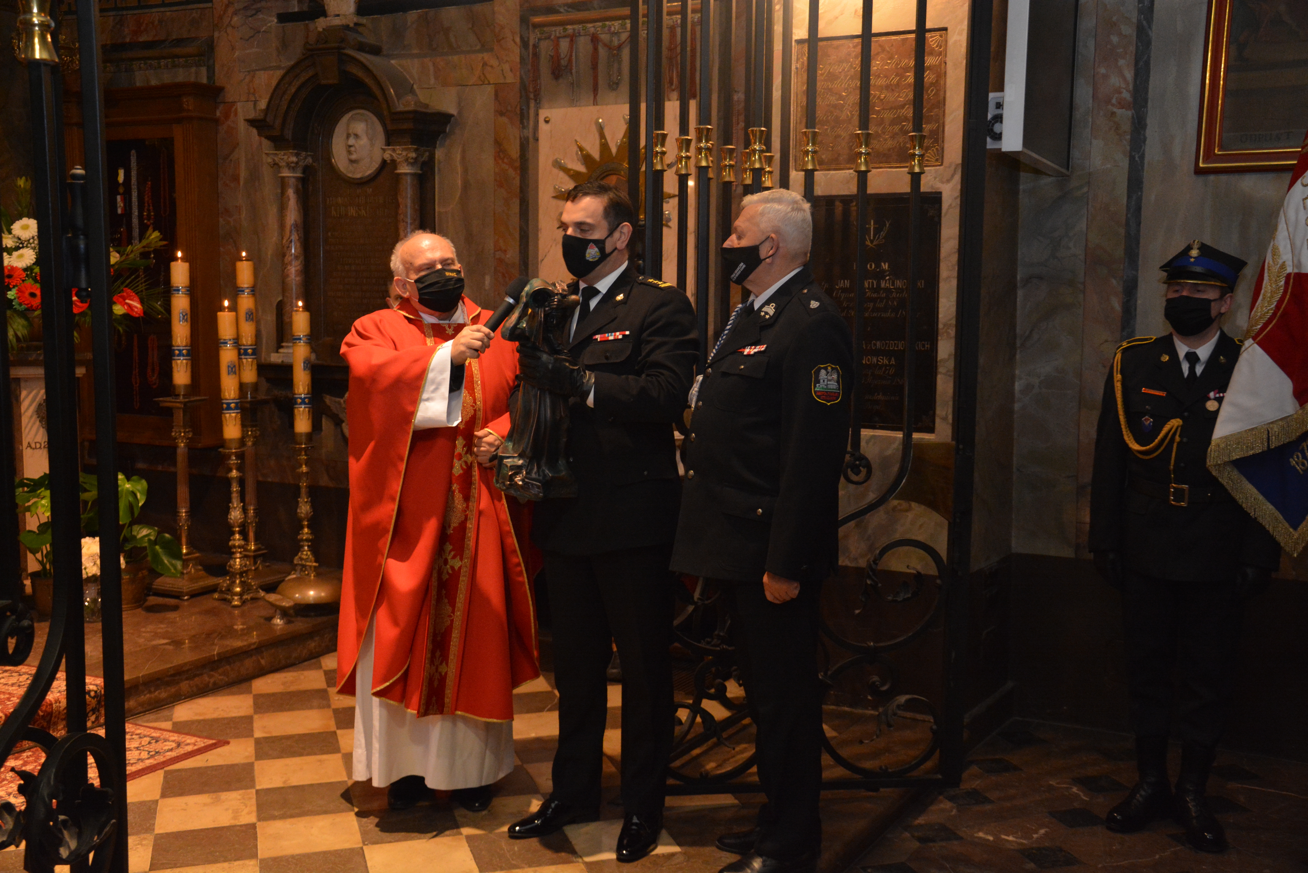 Po mszy świętej, której przewodniczył biskup kielecki Jan Piotrowski, Świętokrzyski Komendant Wojewódzki PSP w Kielcach st. bryg. Krzysztof Ciosek przekazał w darze dla Bazyliki figurę Św. Floriana.