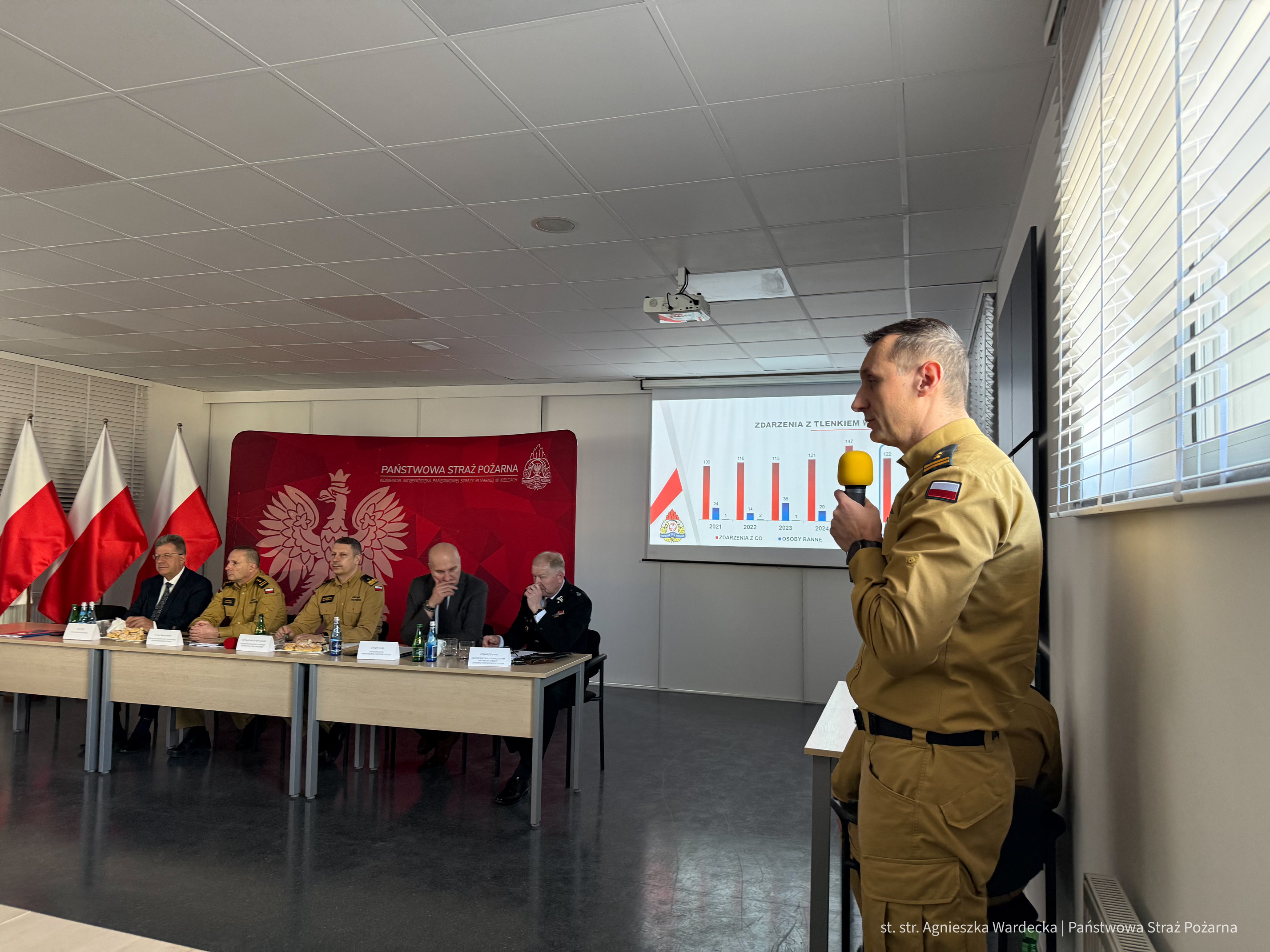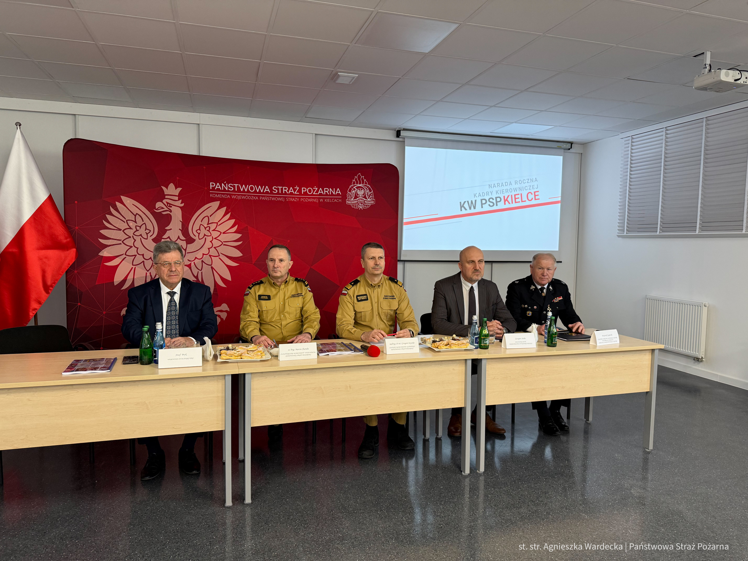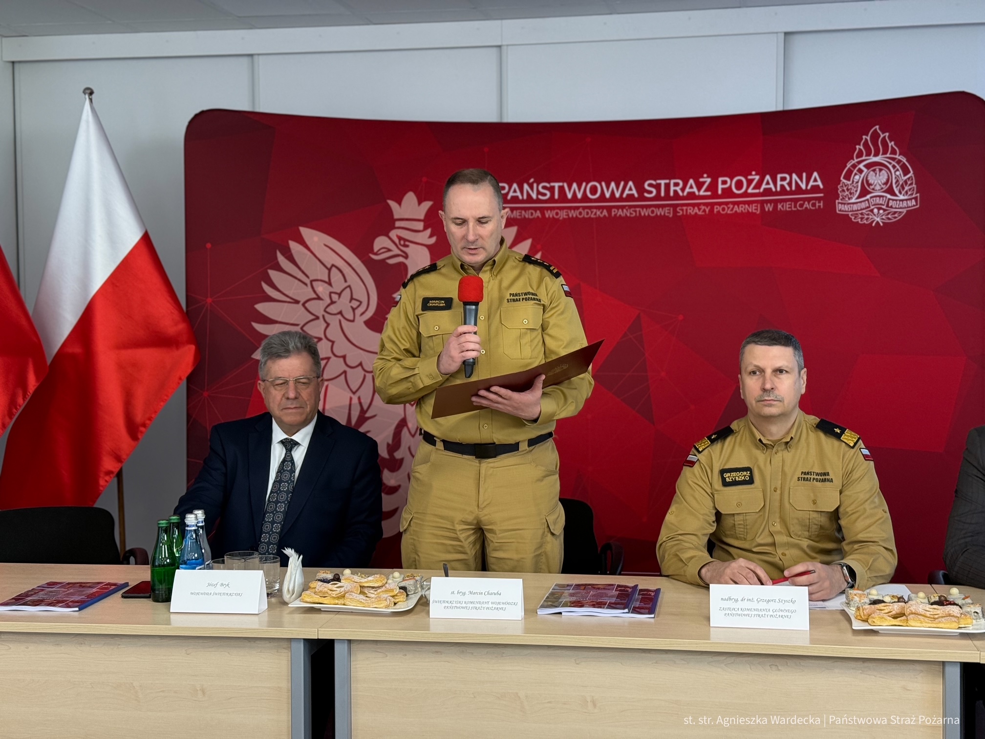 Działalności jednostek organizacyjnych PSP na terenie woj. świętokrzyskiego za rok 2025 przedstawili Świętokrzyski Komendant Wojewódzki PSP st. bryg. Marcin Charuba wraz z zastępcami, omawiając działalność poszczególnych pionów: operacyjnego, finansowego, kadrowego, kontrolno-rozpoznawczego, logistyczno-technicznego, szkoleniowego, organizacyjnego. Omówiono także zadania z zakresu: współpracy z OSP, prewencji społecznej, a także zadania dotyczące ochrony ludności i obrony cywilnej oraz działalność informacyjną i promocyjną. W omawianej tematyce poruszono kwestie szerokiej współpracy z innymi instytucjami w zakresie realizacji zadań związanych z bezpieczeństwem.