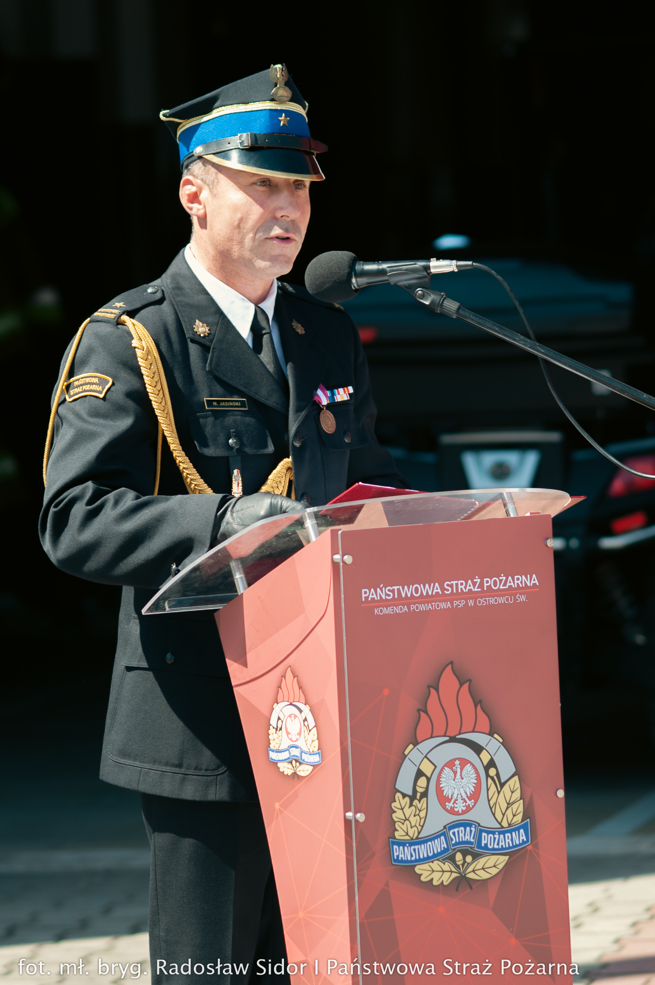 Następnie Świętokrzyski Komendant Wojewódzki PSP przedstawił przebieg służby mł. bryg. Marcina Jasińskiego podkreślając jego doświadczenie zawodowe, zdobyte podczas wieloletniej służby. Mł. bryg. Marcin Jasiński po przywitaniu się ze sztandarem, złożeniu meldunku Świętokrzyskiemu Komendantowi Wojewódzkiemu przejął obowiązki Komendanta Powiatowego Państwowej Straży Pożarnej w Ostrowcu Św. Nowy komendant w swoim przemówieniu podziękował za okazane zaufanie oraz powierzenie mu tak odpowiedzialnej funkcji, wyrażając gotowość do dalszej służby na rzecz bezpieczeństwa mieszkańców powiatu.