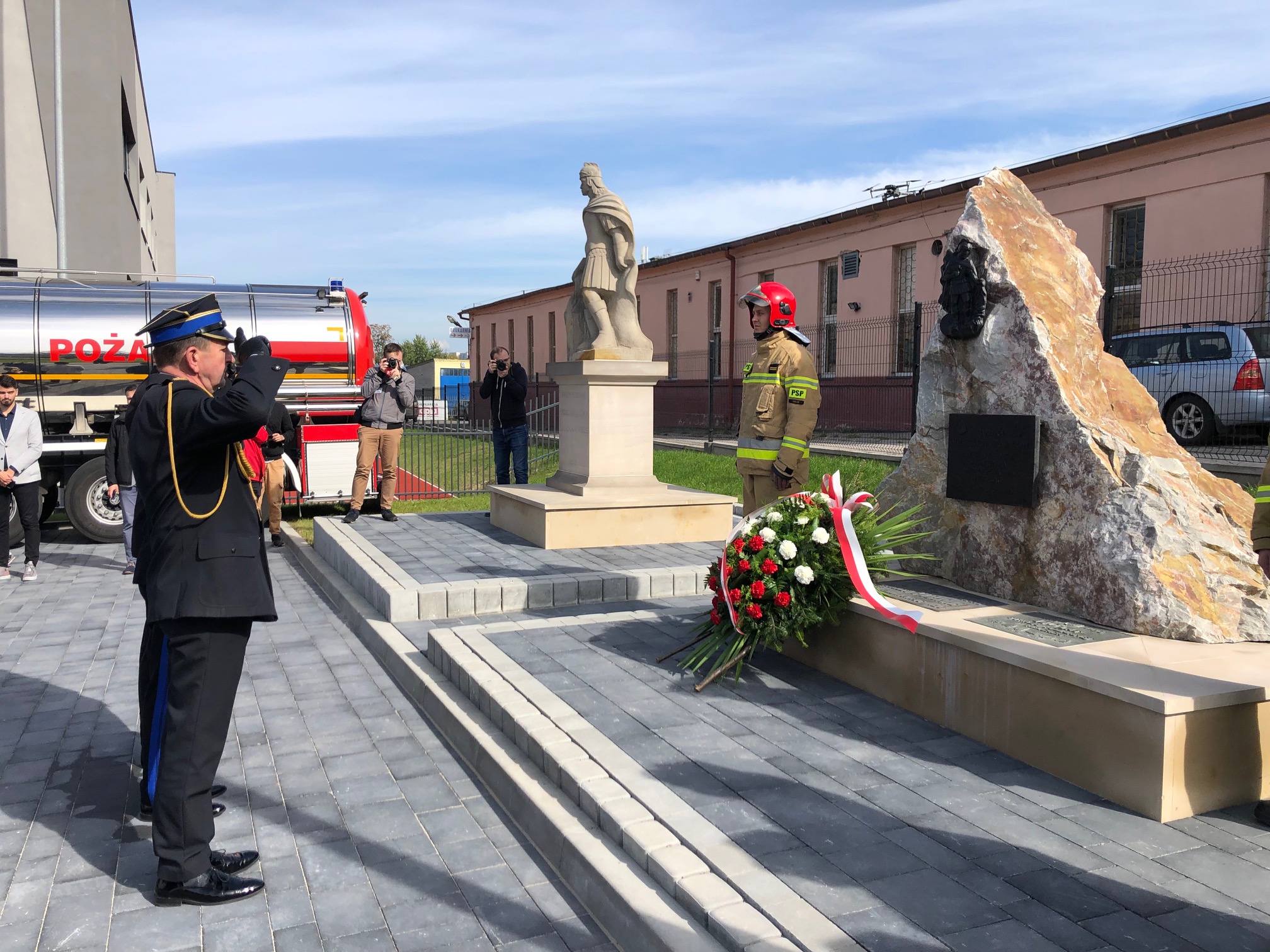 Komendant Główny PSP nadbryg. Andrzej Bartkowiak, Świętokrzyski Komendant Wojewódzki PSP st. bryg. Krzysztof Ciosek, Komendant Miejski PSP w Kielcach st. bryg. Sławomir Karwat złożyli wieniec pod pomnikiem oddając hołd kieleckim strażakom.