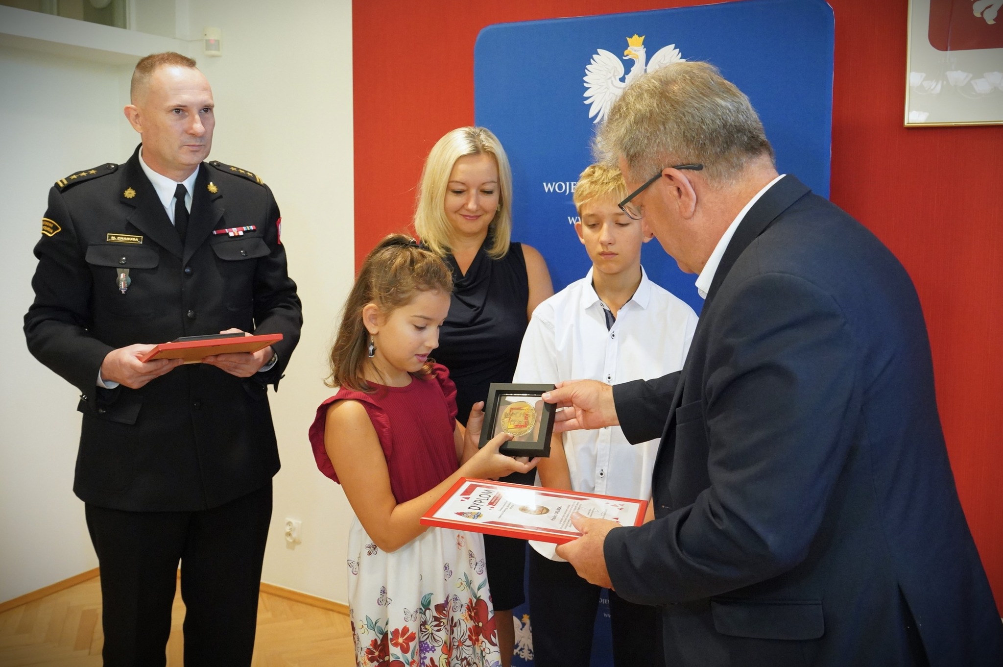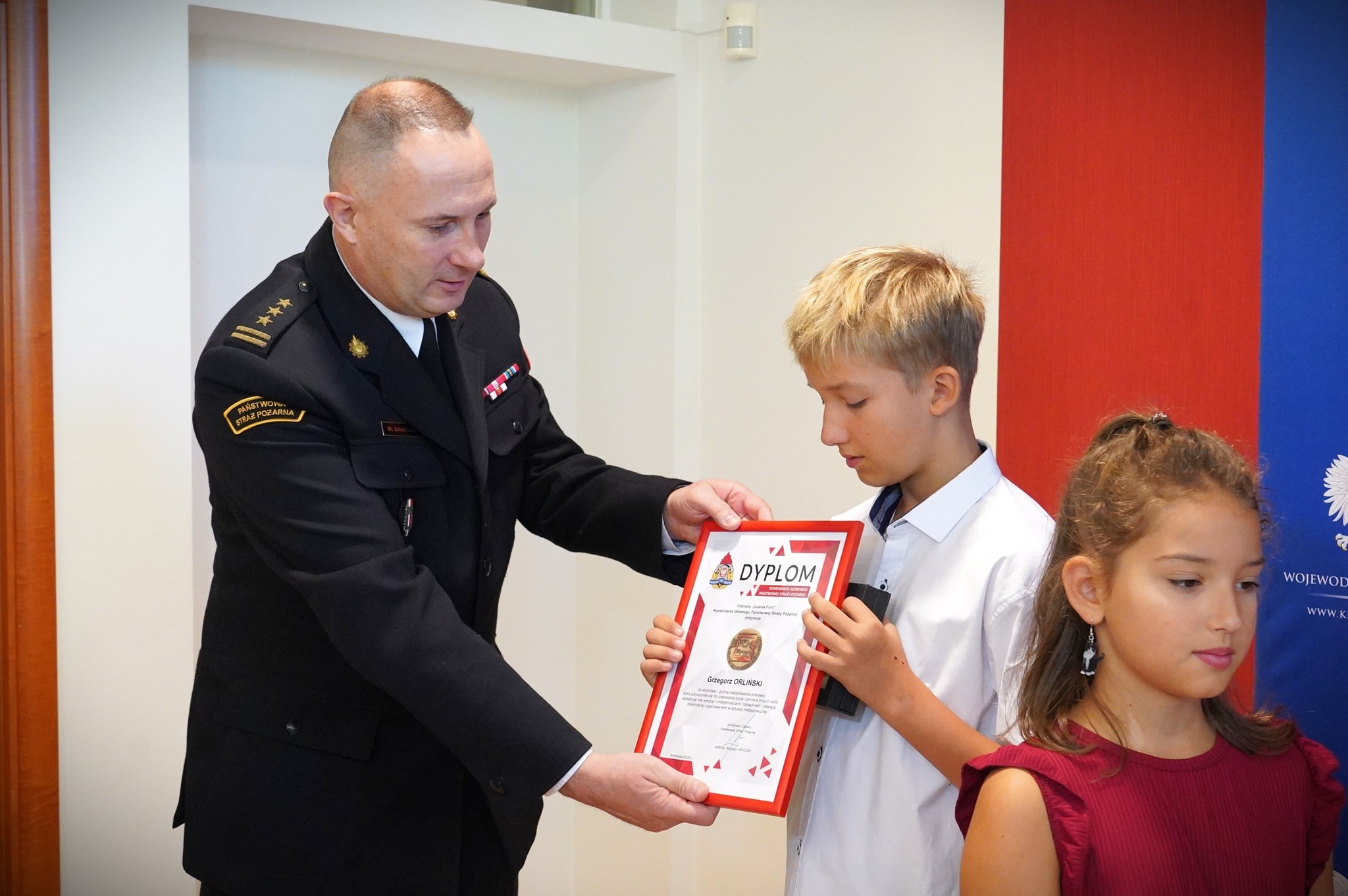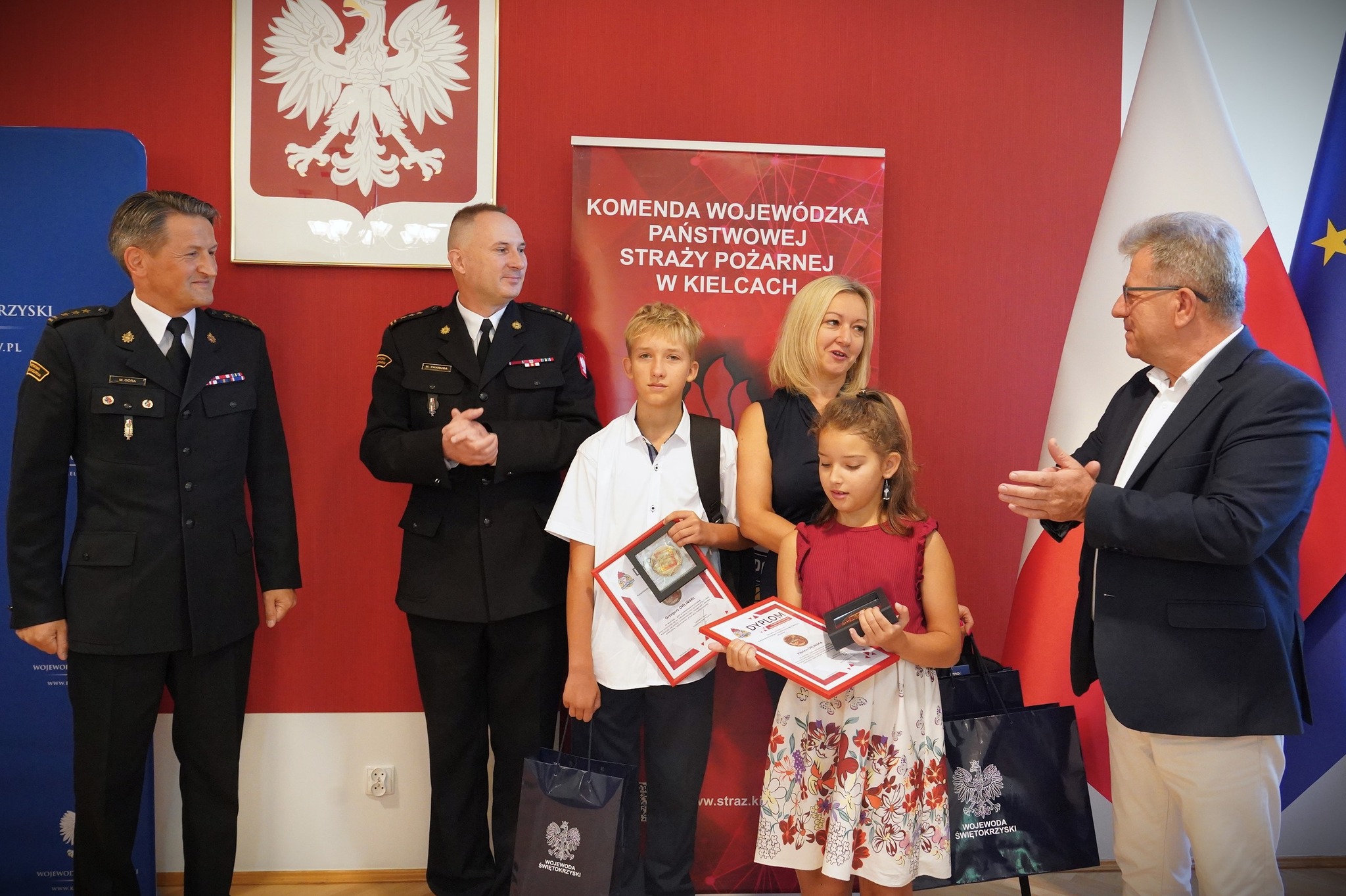 Działania rodzeństwa pozwoliły uniknąć tragedii i stanowią wzór odpowiedzialności, odwagi oraz umiejętności działania w sytuacji zagrożenia. Ich postawa została uhonorowana odznakami IUVENIS FORTI przyznanymi przez Komendanta Głównego Państwowej Straży Pożarnej nadbryg. Wojciecha Kruczka. Obojgu laureatom wojewoda świętokrzyski Pan Józef Bryk oraz Świętokrzyski Komendant Wojewódzki PSP st. bryg. Marcin Charuba serdecznie pogratulowali bohaterskiej postawy oraz wręczyli okolicznościowe upominki. Gratulacje odebrała również mama bohaterskich dzieci, a Komendant Miejski PSP w Kielcach st. bryg. Mariusz Góra zaprosił młodych bohaterów wraz z kolegami ze szkoły do odwiedzenia Sali Edukacyjnej OGNIK, funkcjonującej w Komendzie Miejskiej PSP w Kielcach przy ulicy Sandomierskiej.