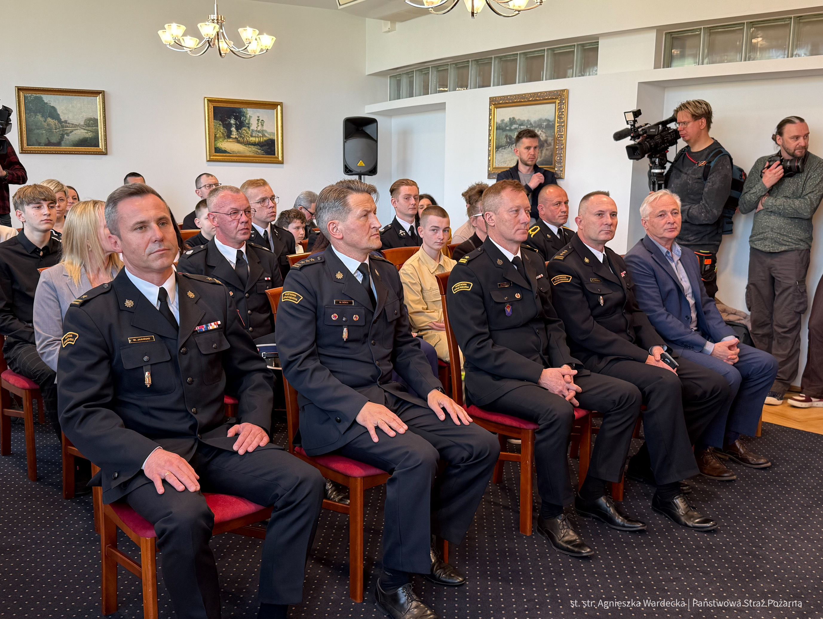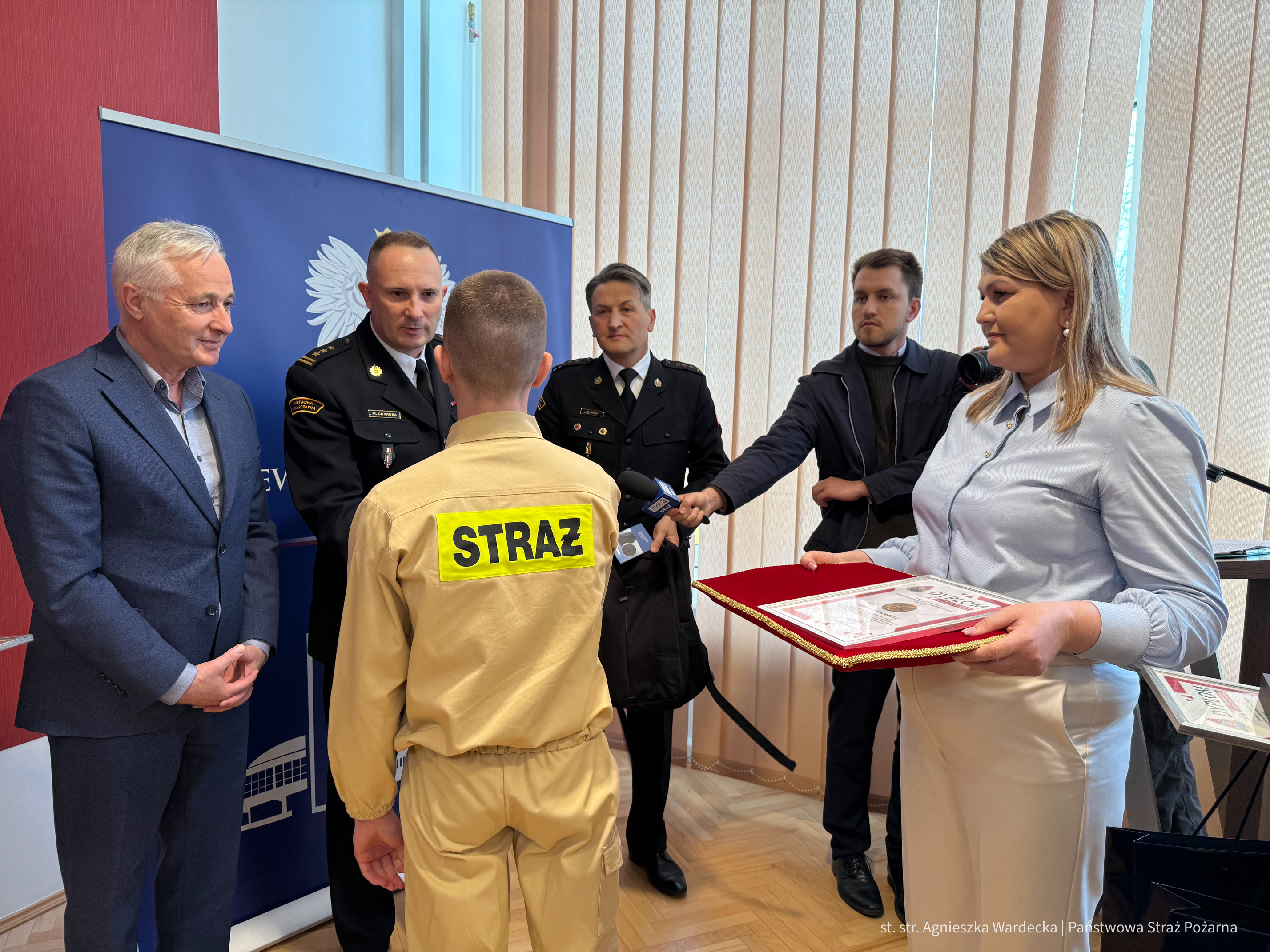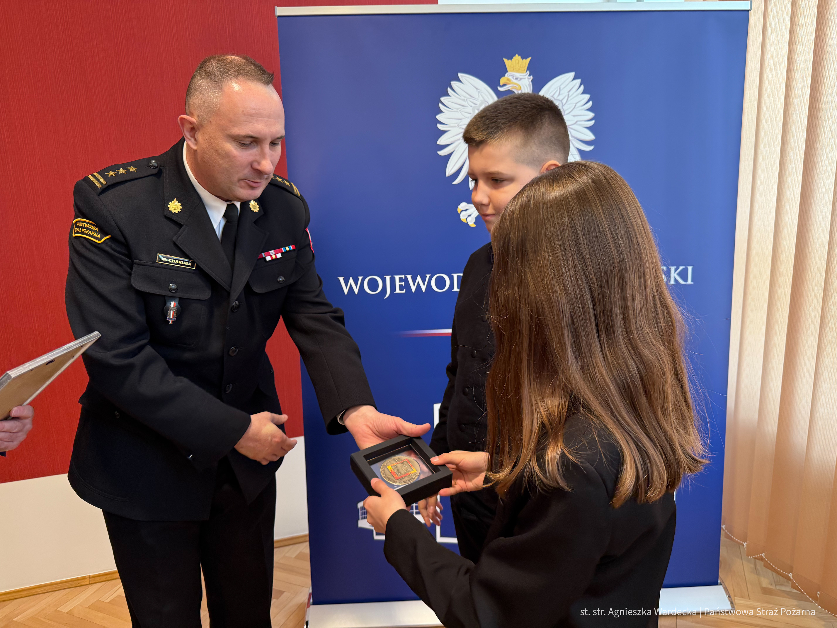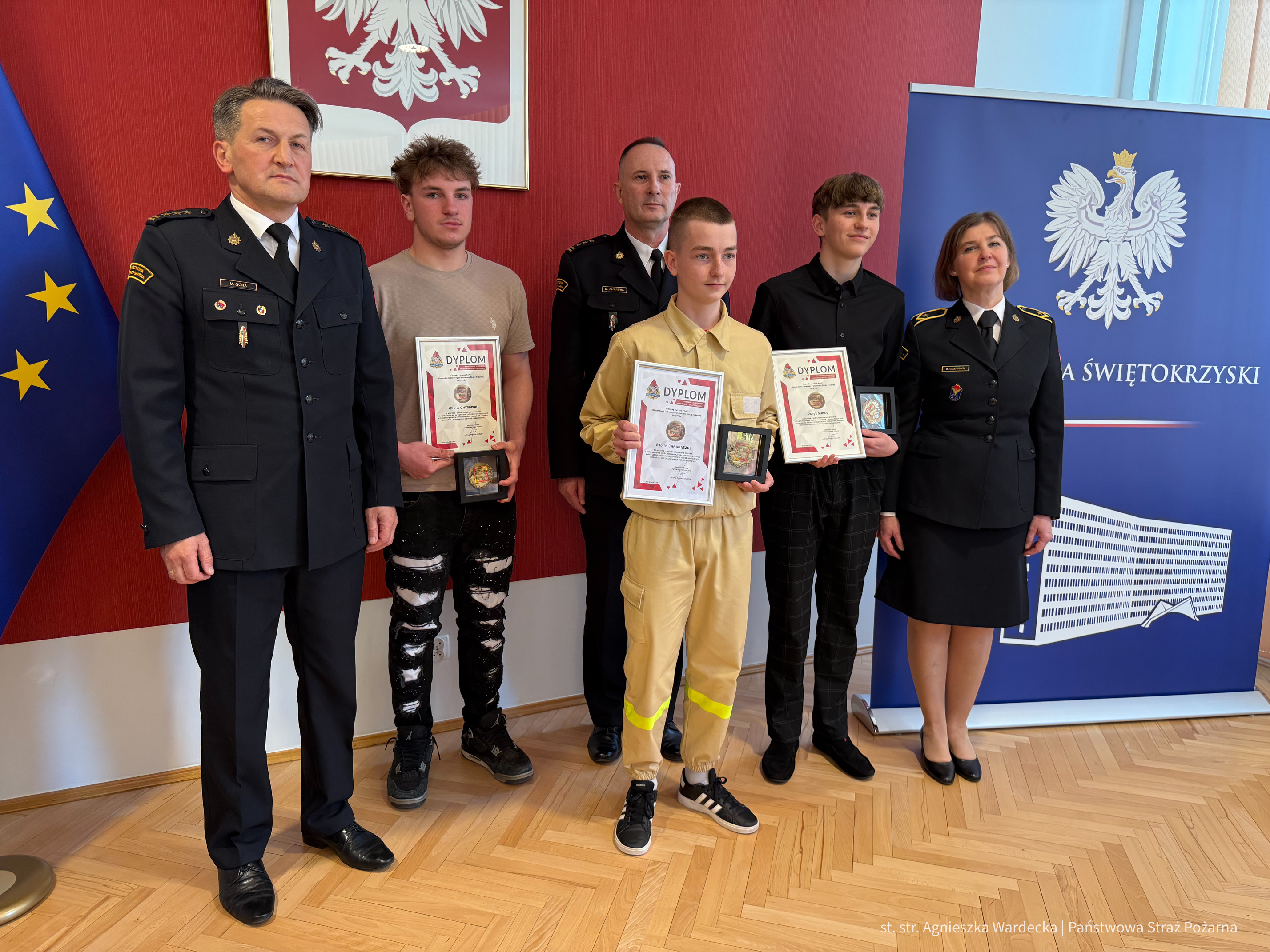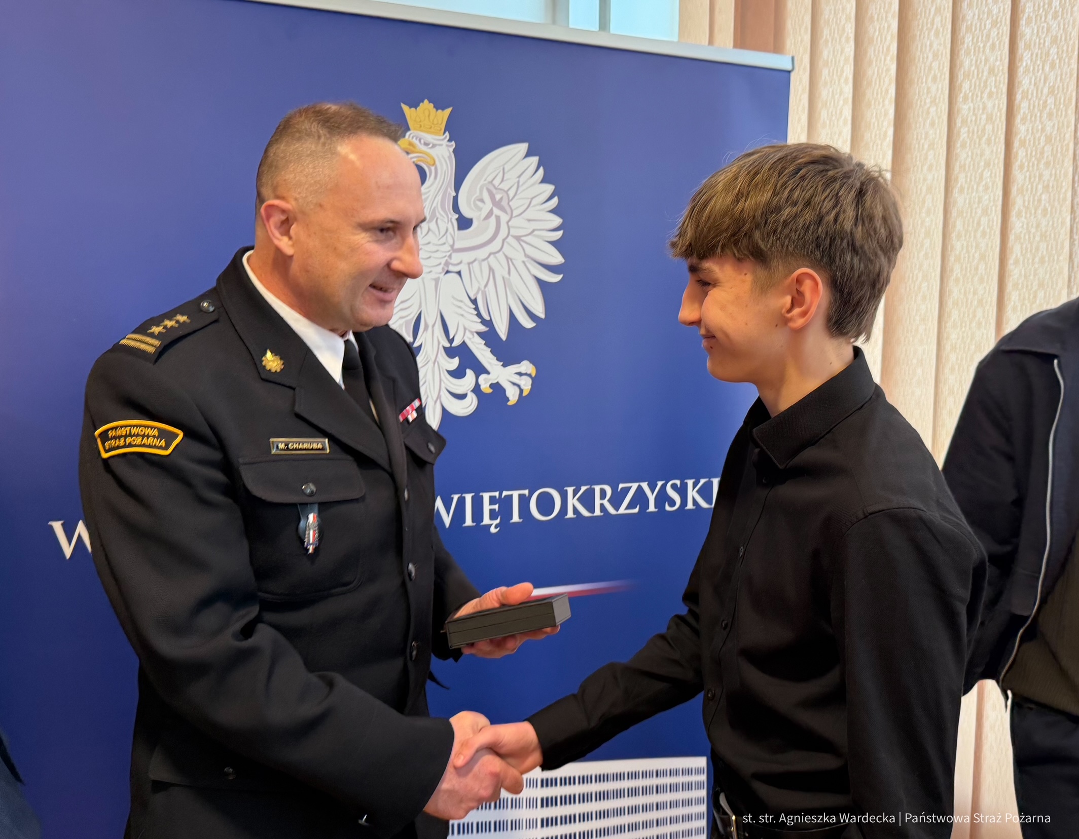 Przyznawana przez Komendanta Głównego Państwowej Straży Pożarnej nadbryg. Wojciecha Kruczka odznaka wręczana jest młodym osobom, które w sytuacjach zagrożenia wykazały się bohaterstwem, odpowiedzialnością oraz gotowością do niesienia pomocy innym. To szczególne wyróżnienie stanowi wyraz uznania dla ich postawy i jednocześnie przykład do naśladowania dla innych. Dziś takie odznaki otrzymali: Gabriel Chrabąszcz, Patryk Sokól i Oliver Gnysiński z powiatu kieleckiego, Zuzanna Dekasińska i Wiktor Kaleta z powiatu ostrowieckiego oraz Kamil Markiewicz z powiatu jędrzejowskiego. Wszyscy wykazali się niezwykłą determinacją i dojrzałością, ratując zdrowie i życie innych osób.