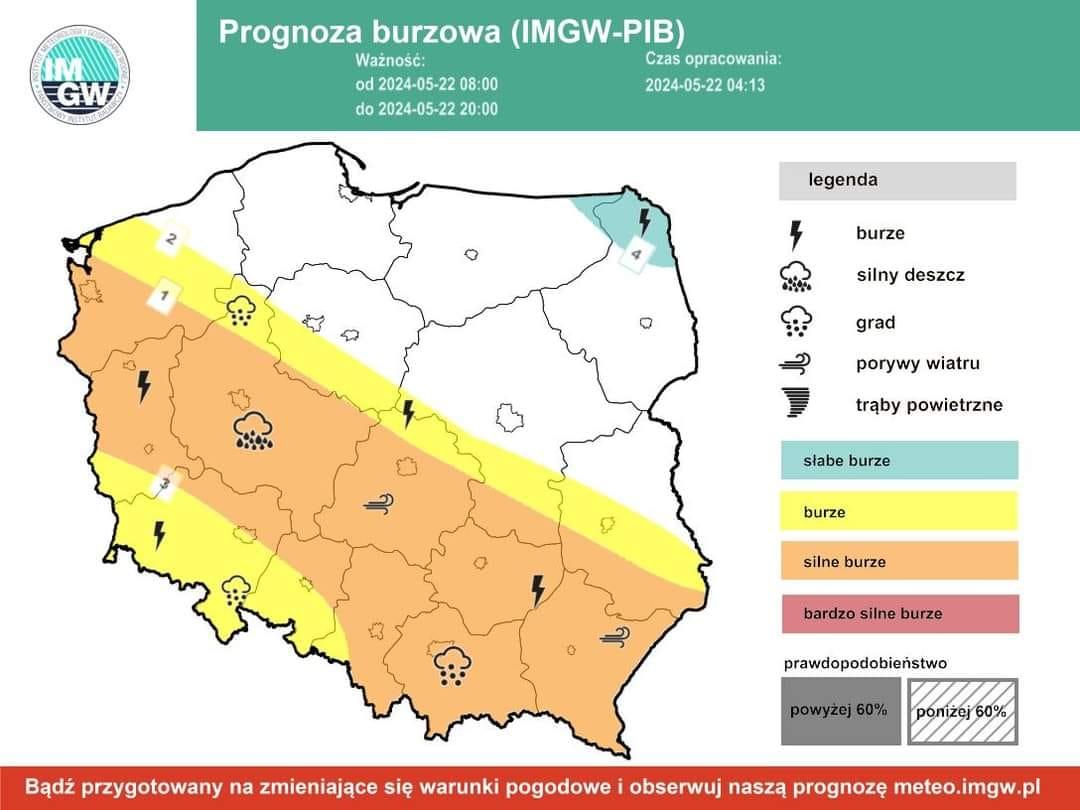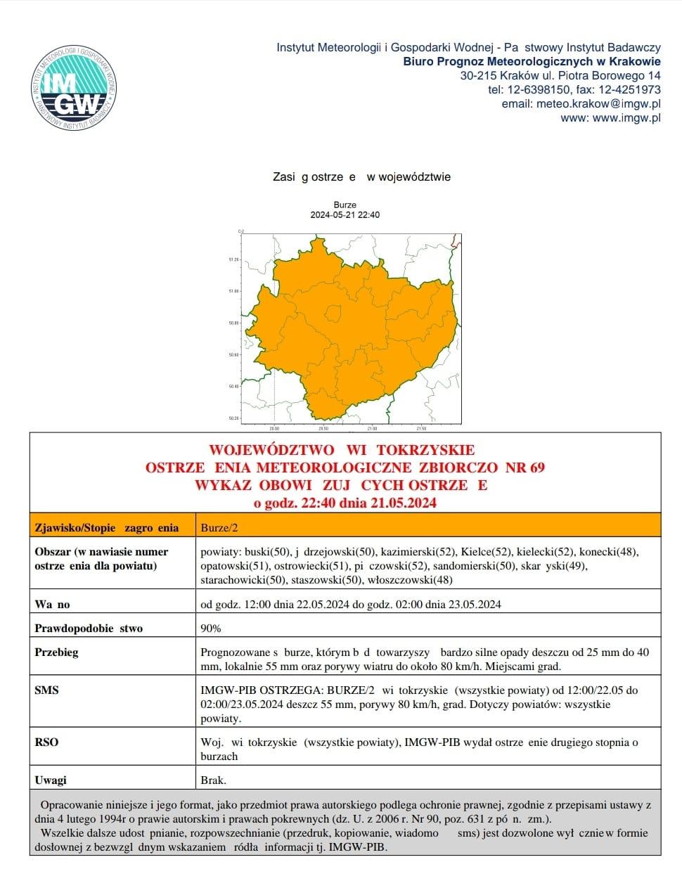 22 maja 2024 roku dla wszystkich powiatów województwa świętokrzyskiego Instytut Meteorologii i Gospodarki Wodnej wydał ostrzeżenie 2 stopnia o zagrożeniu burzami. Prognozowane są intensywne opady deszczu do 55 mm, porywy wiatru nawet do 80 km/h, a miejscami opady gradu.