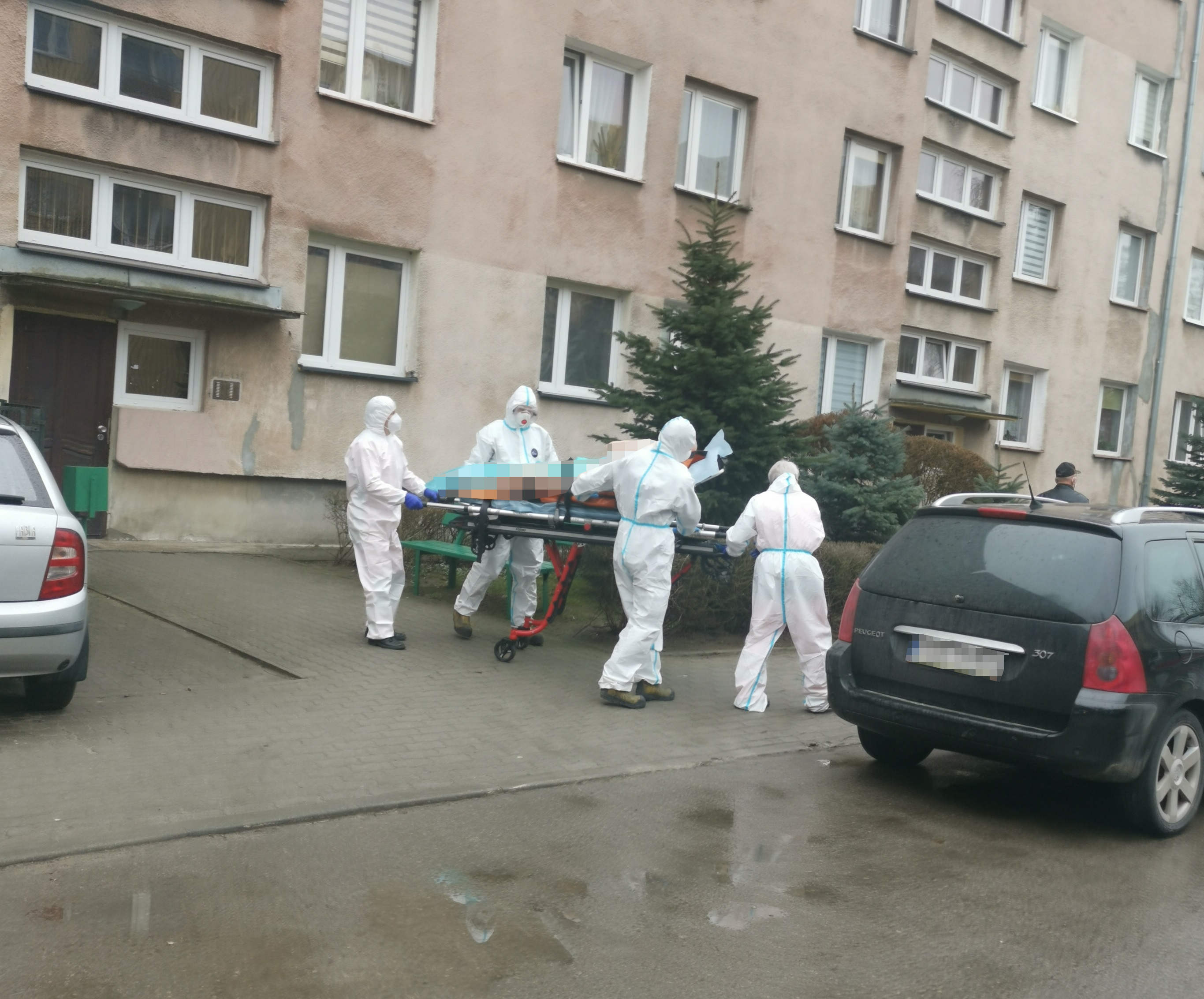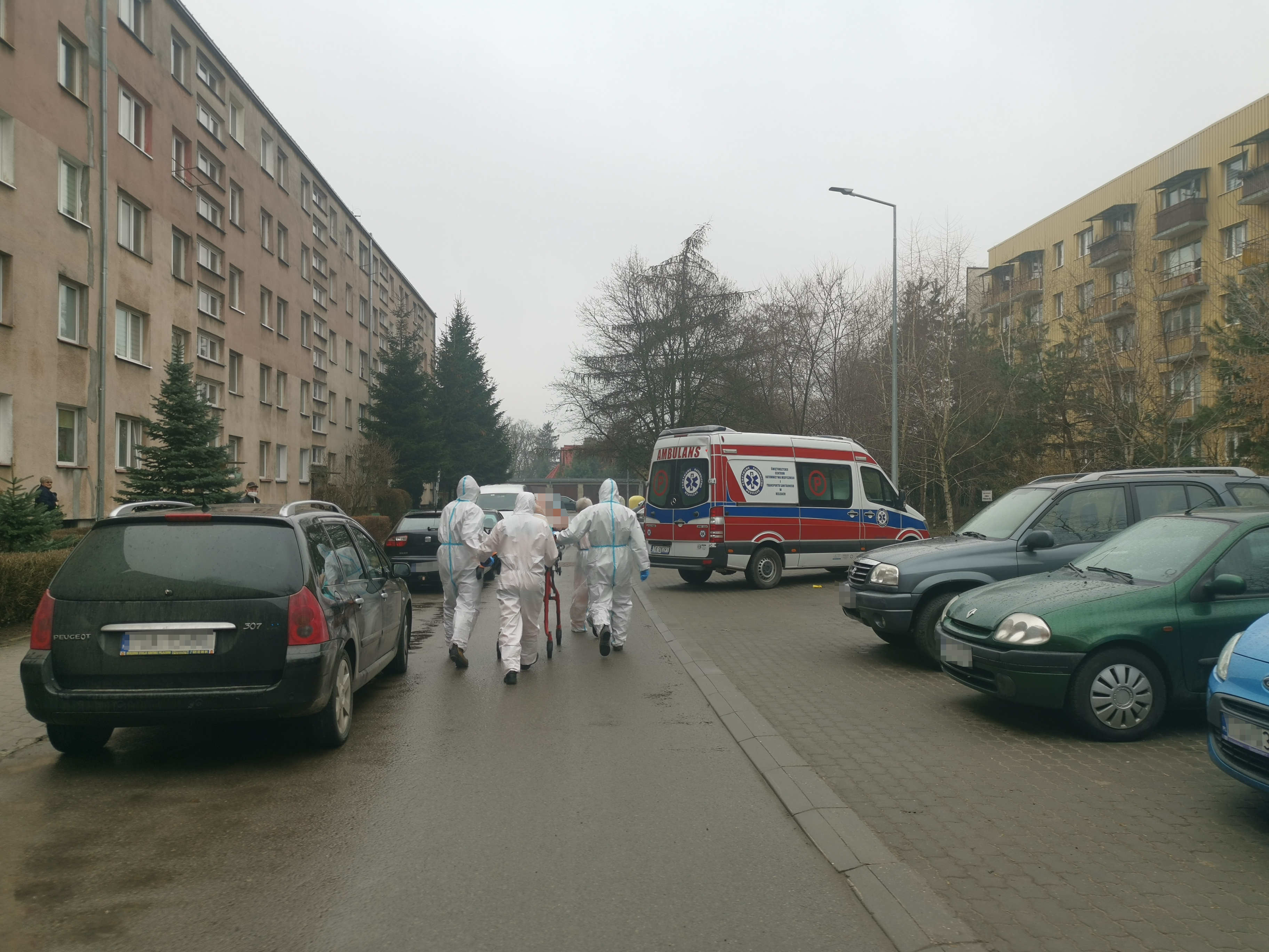 Ratownicy zabezpieczeni w ubrania ochrony biologicznej, maseczki typu FFP3 oraz gogle ochronne, udzielili pomocy ratownikom medycznym w transporcie chorej osoby z drugiego piętra, do stojącego na parkingu ambulansu.
