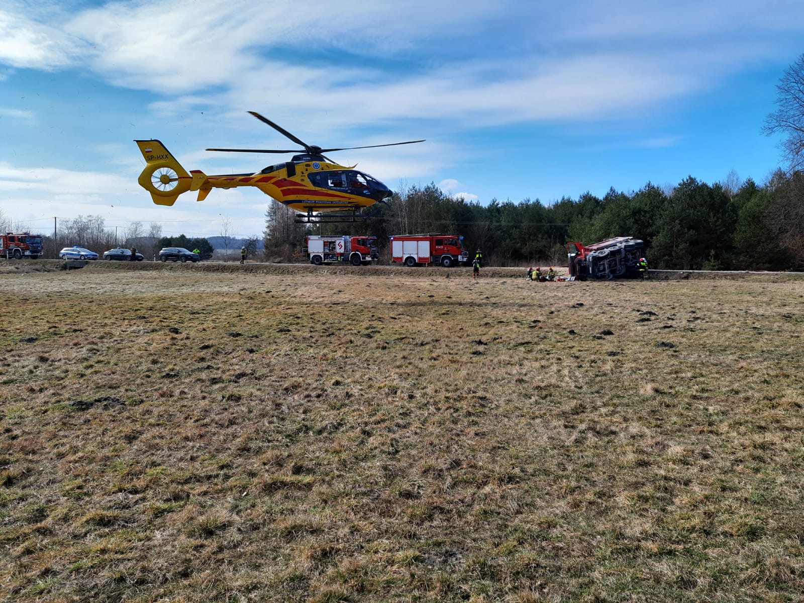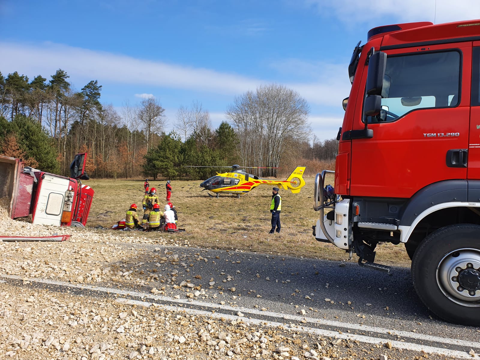 W wyniku zdarzenia z samochodu ciężarowego wysypało się na jezdnię kruszywo, uniemożliwiając ruch w obu kierunkach. Działania jednostek ochrony przeciwpożarowej polegały na zabezpieczeniu miejsca zdarzenia, następnie przystąpiono do odłączenia akumulatorów. Równolegle prowadzono działania medyczne w stosunku do osób poszkodowanych. Strażacy wydobyli poszkodowanego kierowcę ciężarówki z wnętrza pojazdu na nosze typu deska oraz udzielili mu kwalifikowanej pierwszej pomocy. Podróżującym dwóm osobom z samochodu osobowego strażacy- ratownicy opatrzyli otarcia naskórka oraz udzielali wsparcia psychicznego do czasu przybycia na miejsce zespołu ratownictwa medycznego. Przybyły na miejsce zdarzenia śmigłowiec lotniczego pogotowia ratunkowego zabrał poszkodowanego kierowcę ciężarówki do szpitala na dalsze badania.