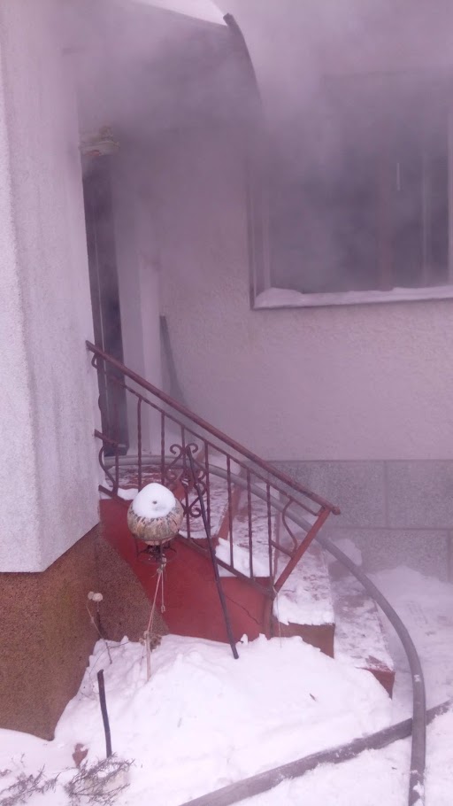 Po dojeździe na miejsce zdarzenia zastępów straży pożarnej stwierdzono silne zadymienie na parterze budynku mieszkalnego w zabudowie bliźniaczej. Budynek nie był zamieszkiwany przez nikogo, natomiast osoby z budynku przyległego opuściły go przed przybyciem jednostek ochrony przeciwpożarowej. Po przeprowadzeniu rozpoznania stwierdzono, że na skutek pożaru sadzy w przewodzie kominowym doszło do jego rozszczelnienia i zapalenia wyposażenia jednego z pomieszczeń. Działania zastępów straży pożarnej polegały na zabezpieczeniu miejsca zdarzenia, odłączeniu prądu w budynku i podaniu jednego prądu wody do wnętrza pomieszczenia. Po zlokalizowaniu pożaru, wygaszono piec c.o. i dokonano niezbędnych prac rozbiórkowych. Budynek mieszkalny przewietrzono oraz sprawdzono przy pomocy detektora wielogazowego na obecność tlenku węgla, wynik pomiaru negatywny.