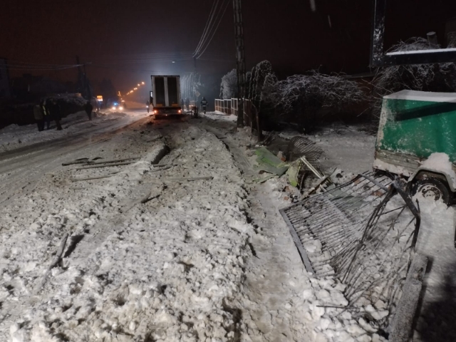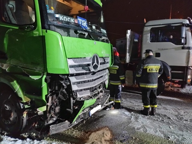 Po dojeździe na miejsce akcji stwierdzono, że doszło do kolizji samochodu ciężarowego marki Mercedes Actros z przydrożnym żelbetonowym podwójnym słupem energetycznym. Uszkodzony pojazd znajdował się na jezdni blokując jeden pas ruchu. Kierujący opuścił auto o własnych siłach przed przybyciem służb ratowniczych i nie uskarżał się na żadne dolegliwości. W wyniku zdarzenia uszkodzony został słup niskiego napięcia oraz ogrodzenia dwóch pobliskich posesji, a także na długości około 30 metrów metalowa bariera oddzielająca jezdnię od chodnika. W samochodzie ciężarowym zniszczeniu uległ przód ciągnika oraz bak paliwa, z którego wyciekał olej napędowy. Na miejscu obecny patrol policji oraz ZRM. Kierujący pojazdem poinformował ratowników, że załadunek naczepy stanowią puste plastikowe wiaderka.
