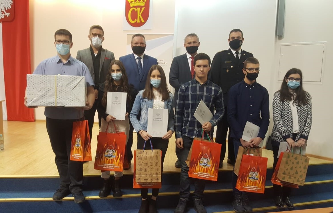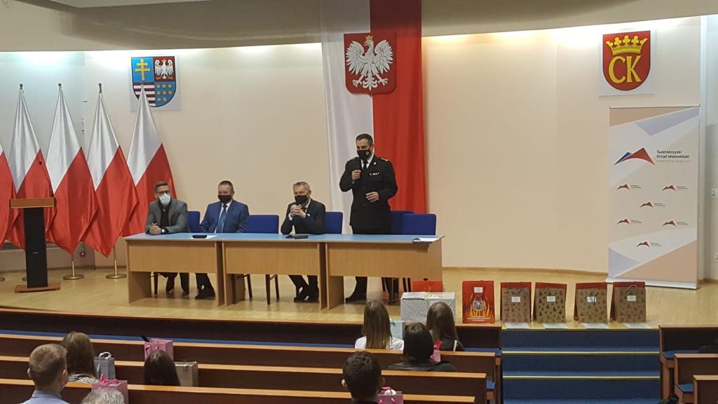 Podczas uroczystego zakończenia Świętokrzyski Komendant Wojewódzki PSP st. bryg. Krzysztof Ciosek wręczył nagrodę za zdobycie II miejsca oraz upominki pozostałym laureatom.