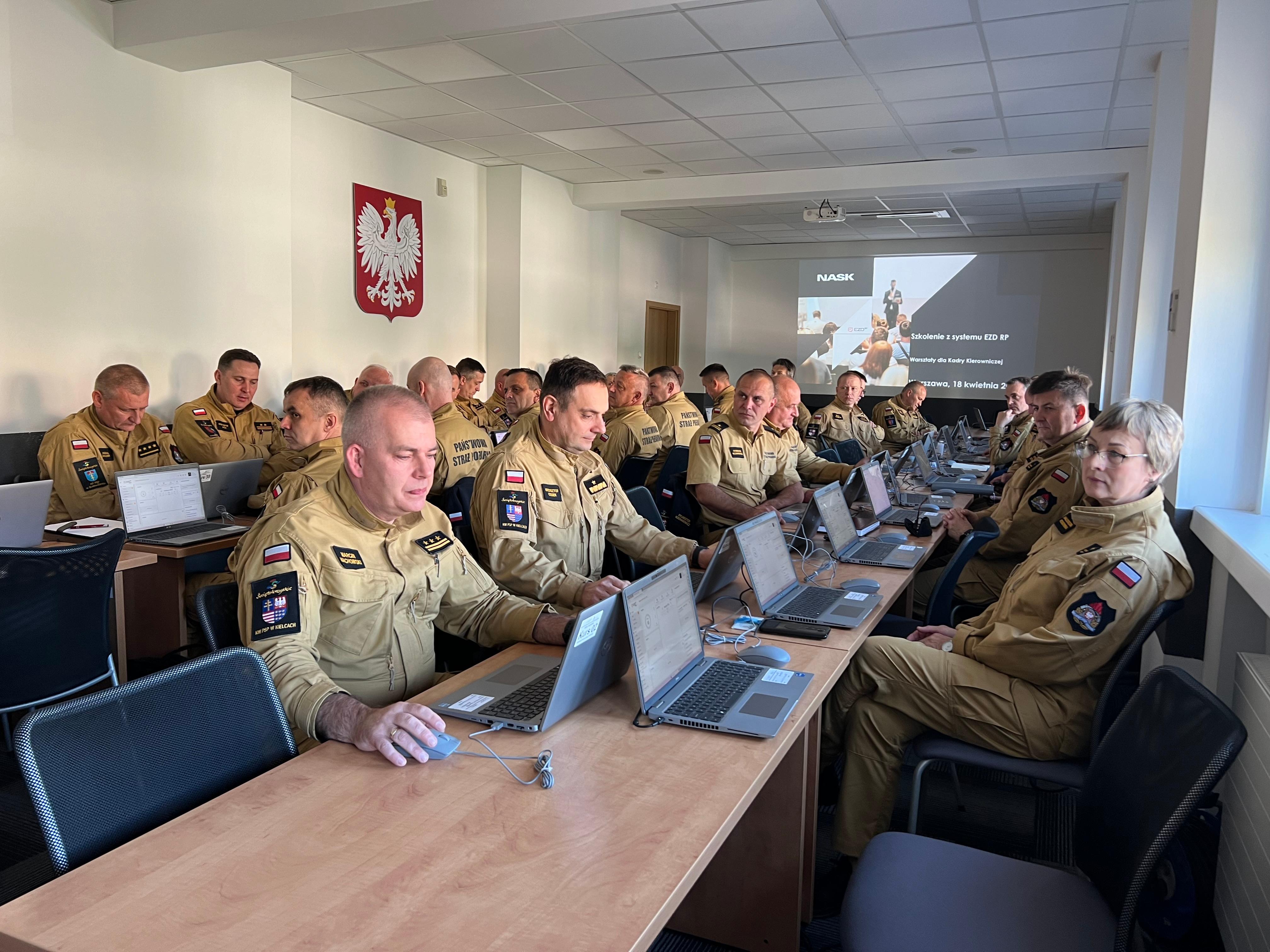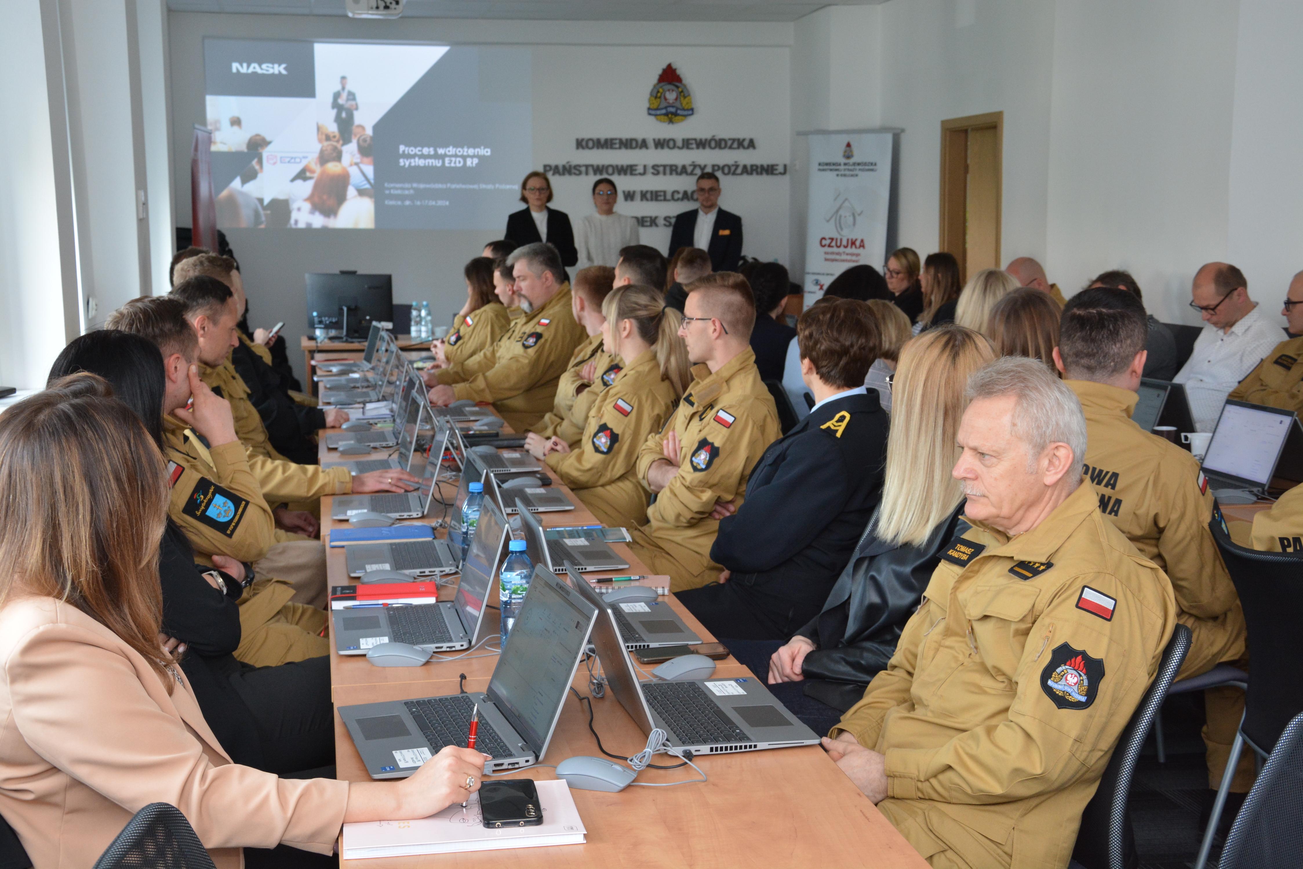 W dniach 16-18 kwietnia 2024 roku w Komendzie Wojewódzkiej PSP w Kielcach, w związku z planowanym wdrożeniem nowego systemu elektronicznego zarządzania dokumentacją EZD RP w jednostkach organizacyjnych PSP z terenu województwa świętokrzyskiego, odbyły się szkolenia stacjonarne z modułów i funkcji systemu, przeprowadzone przez pracowników firmy NASK.