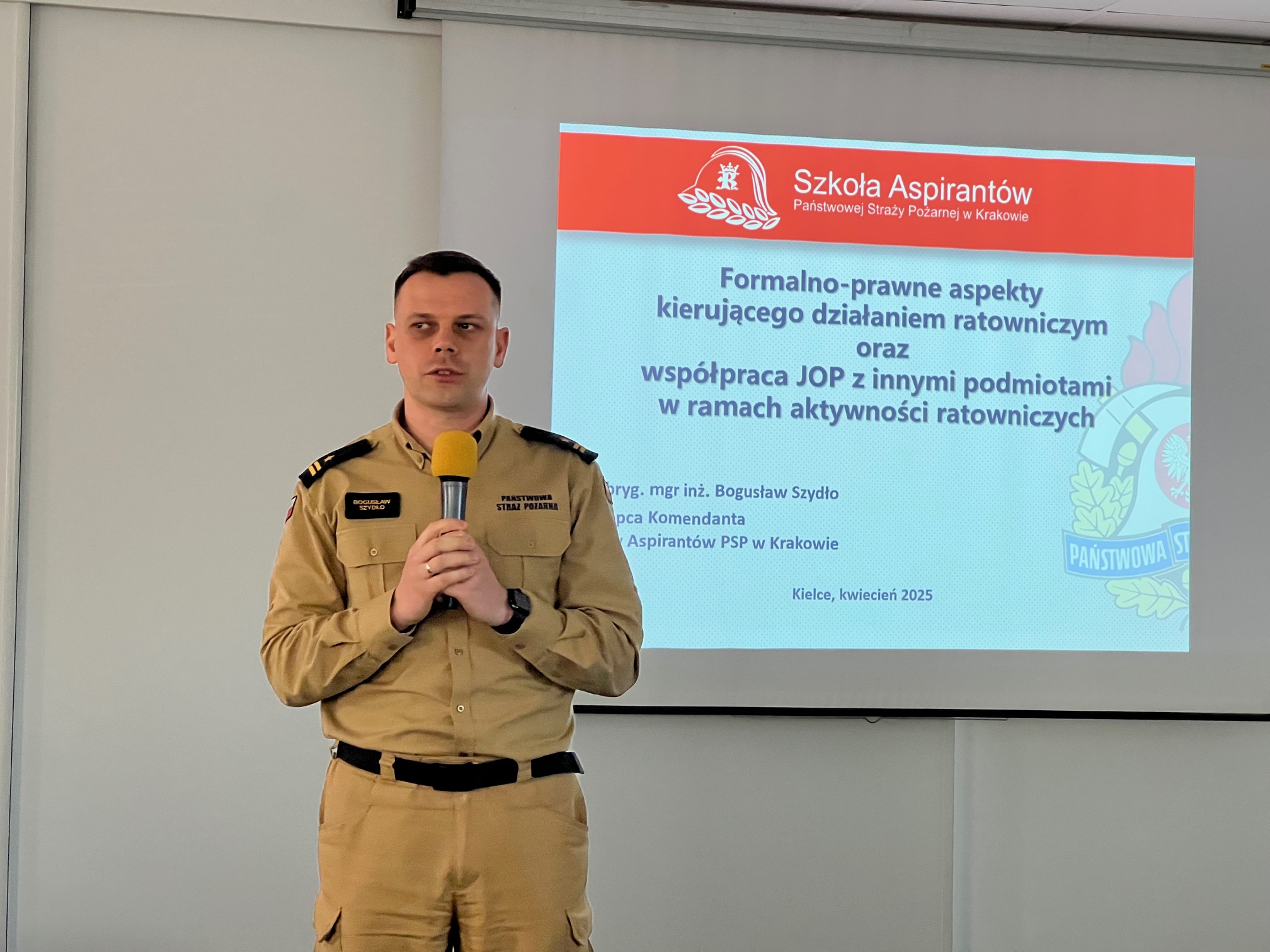 W dniach 23-24 kwietnia 2025 roku Szkoła Aspirantów PSP w Krakowie we współpracy z Komendą Wojewódzką PSP w Kielcach zorganizowała szkolenie doskonalące z zakresu kierowania działaniami ratowniczymi na poziomie taktycznym oraz współdziałania z kompanią szkolną Kraków Centralnego Odwodu Operacyjnego Krajowego Systemu Ratowniczo-Gaśniczego (COO KSRG).