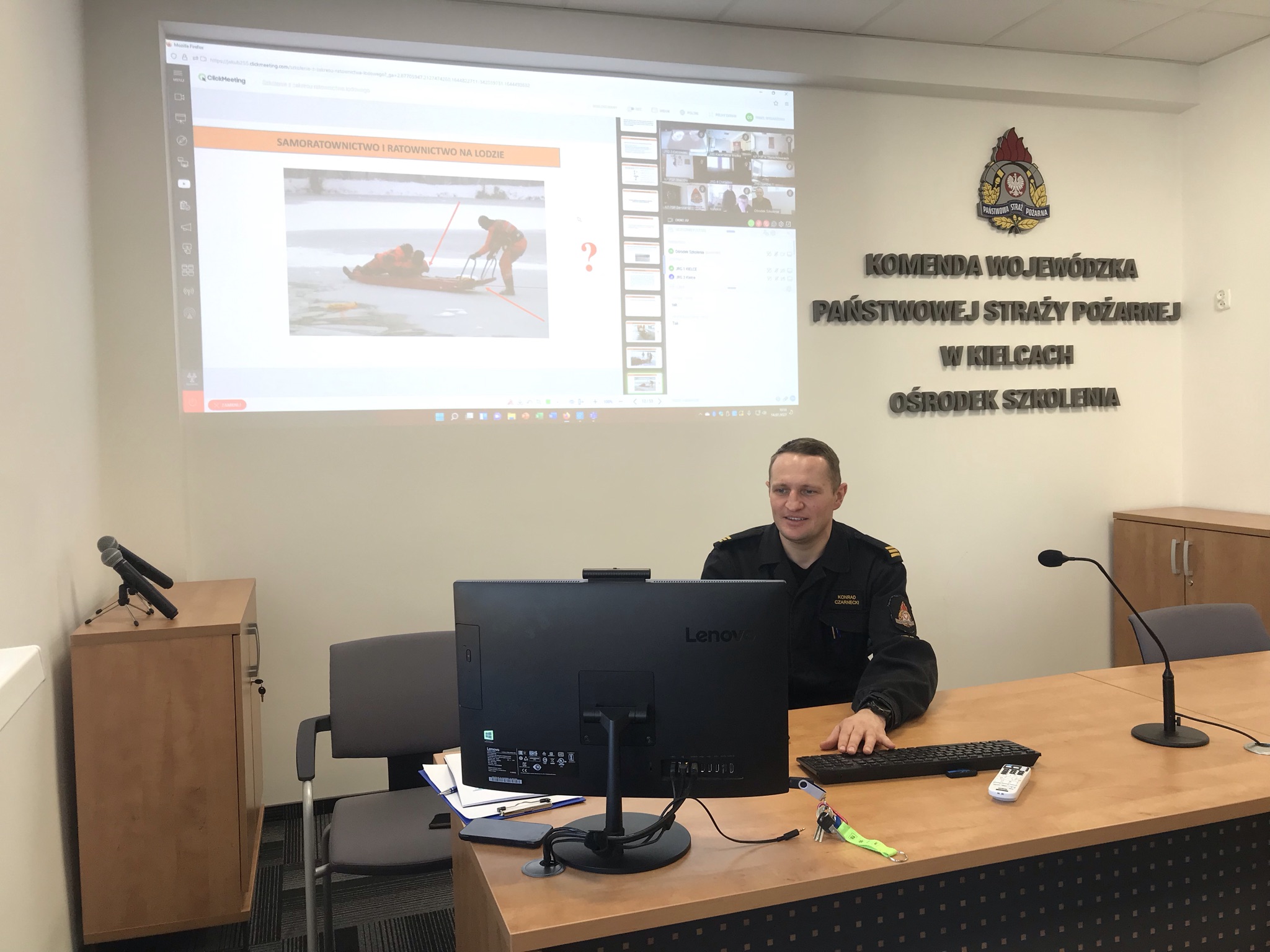 W dniach 14, 15 oraz 16 lutego 2022 roku Ośrodek Szkolenia Komendy Wojewódzkiej Państwowej Straży Pożarnej w Kielcach przy wykorzystaniu systemu wideokonferencyjnego ClickMeeting przeprowadził szkolenie doskonalące z zakresu ratownictwa lodowego. Tematyka zajęć dotyczyła: bezpieczeństwa działań ratowniczych na lodzie, podstawowych wiadomości o parametrach lodu, sprzętu do ratownictwa lodowego oraz technik ratownictwa lodowego i samoratownictwa.