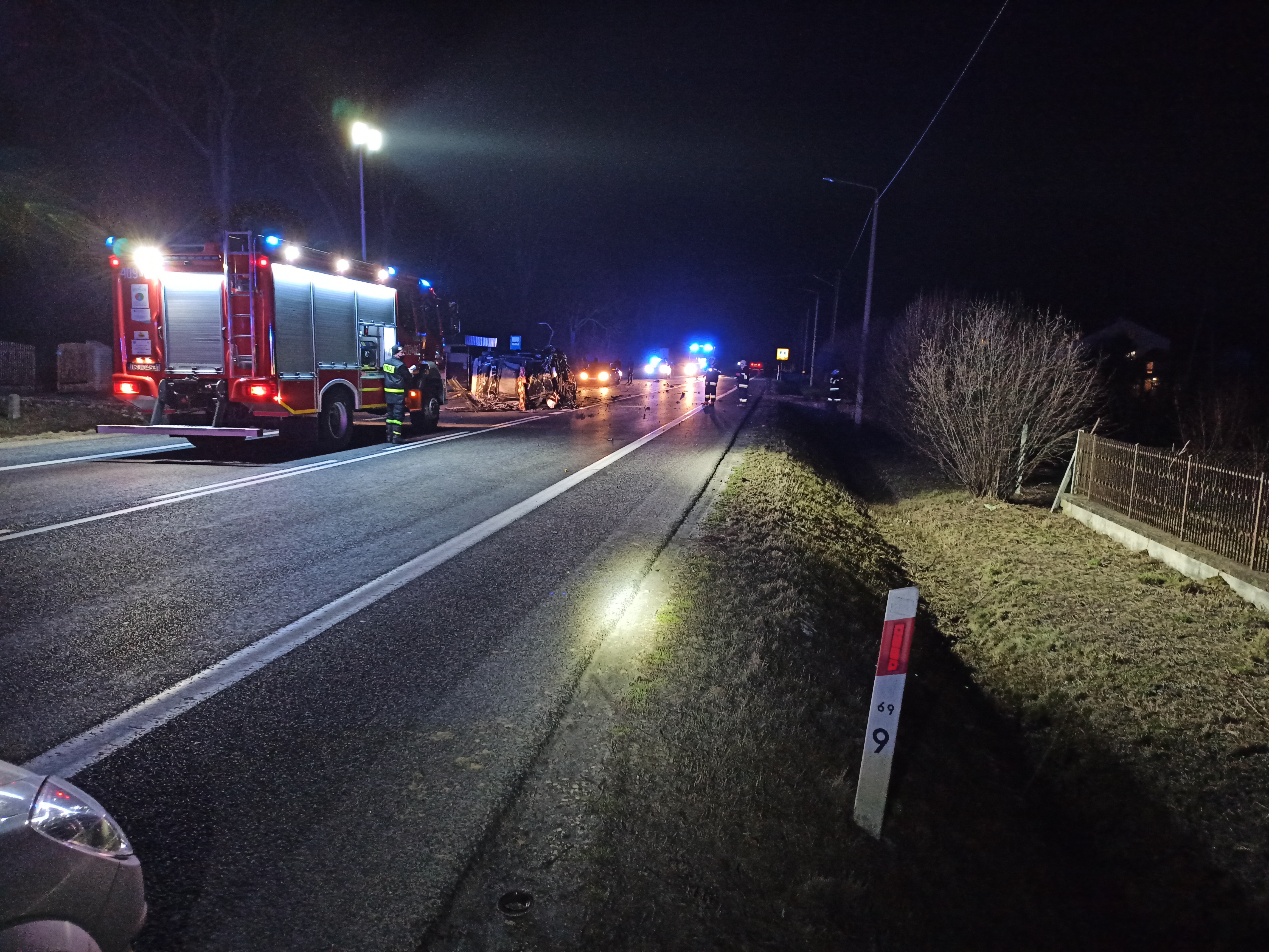 Po przybyciu na miejsce wypadku pierwszych jednostek ochrony przeciwpożarowej stwierdzono, że samochód osobowy jest przewrócony na lewy bok, znajduje się na pasie drogowym i wyciekają z niego płyny eksploatacyjne. Wewnątrz pojazdu nie było osób poszkodowanych, natomiast kierowca znajdował się poza pojazdem, w przydrożnym rowie. Obecny na miejscu zdarzenia ZRM rozpoznał zgon mężczyzny. Dalsze działania JOP polegały na zabezpieczaniu i oświetlaniu terenu akcji podczas czynności dochodzeniowych prowadzonych przez Policję. W działaniach udział brały 2 zastępy Straży Pożarnej (10 strażaków).