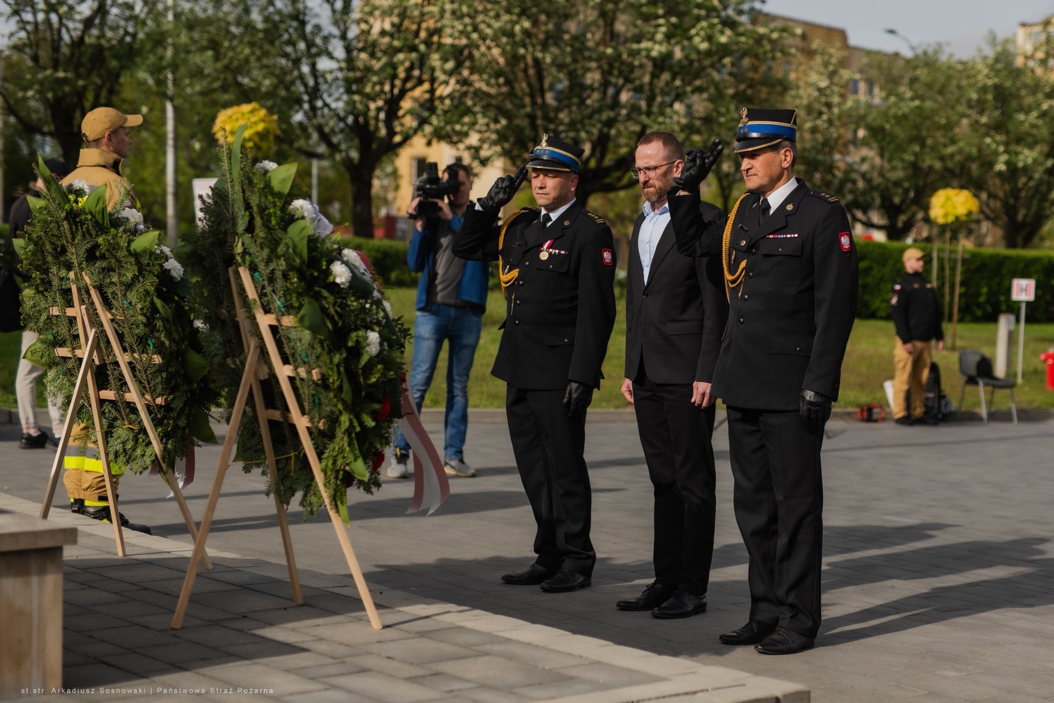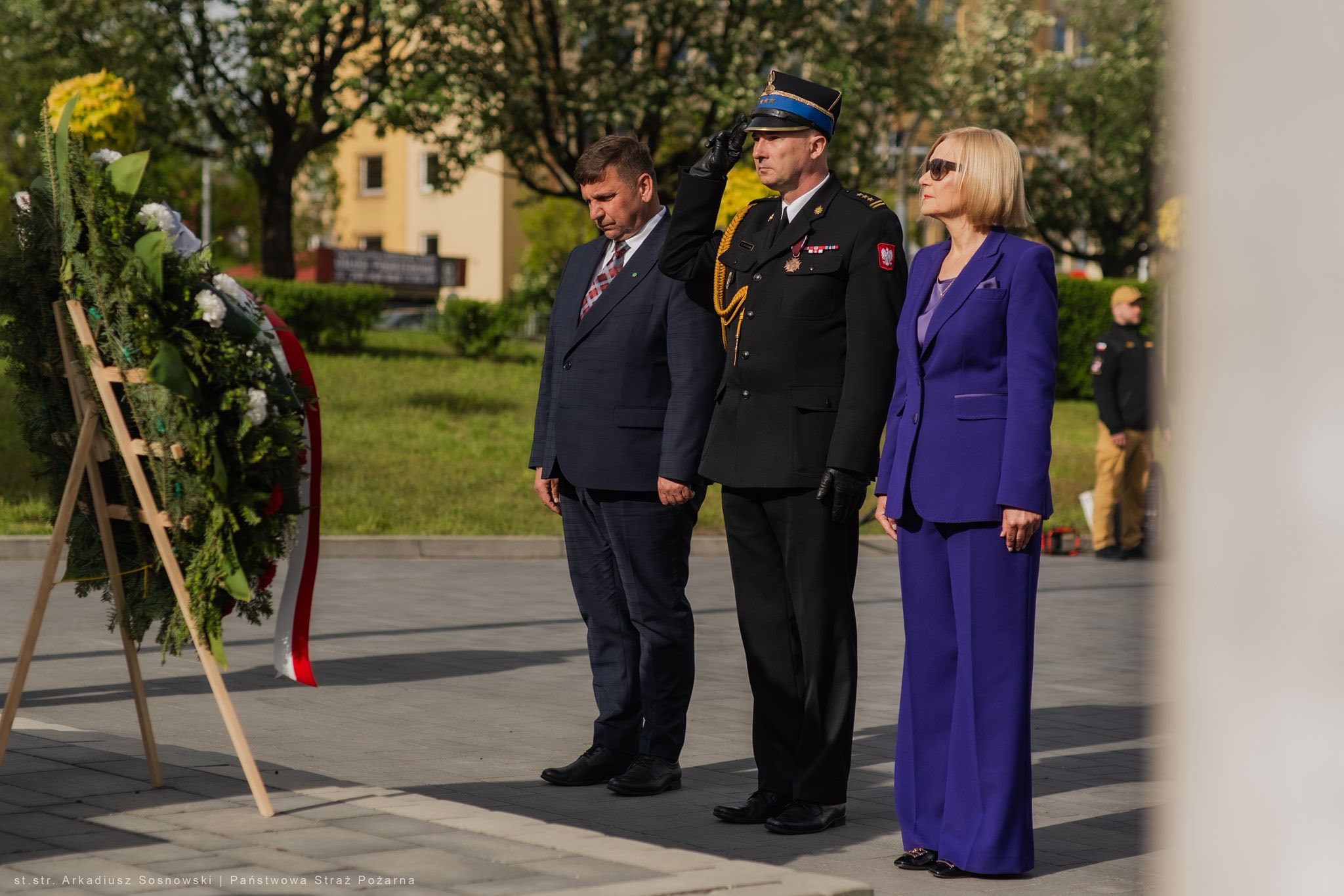 Podczas uroczystości strażacy upamiętnili również zmarłych strażaków składając wieńce przed pamiątkowym obeliskiem.