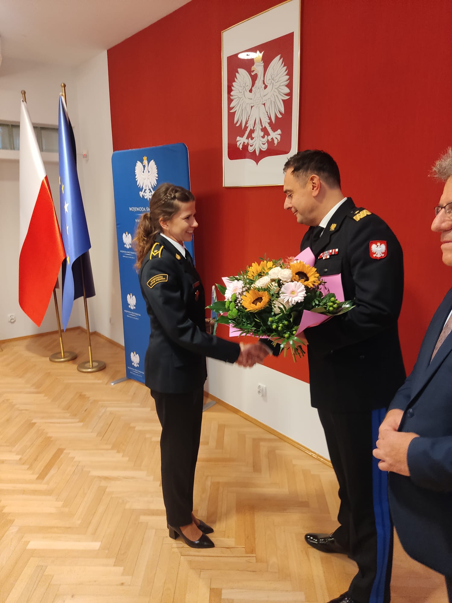 21 listopada w Świętokrzyskim Urzędzie Wojewódzkim pojawili się strażacy, którzy w ostatnim czasie osiągnęli sukcesy na arenach sportowych zmagań w Polsce i Europie. Wojewoda świętokrzyski nie szczędził ciepłych słów pod adresem strażaków, którzy z sukcesami reprezentowali województwo. W wydarzeniu, oprócz Pana wojewody, udział brał Świętokrzyski Komendant Wojewódzki PSP nadbryg. Krzysztof Ciosek. Głównymi bohaterami byli dziś jednak strażacy-sportowcy, a wśród nich m.in. pani mł.asp. Dominika Ostrowska z Komendy Powiatowej Państwowej Straży Pożarnej w Jędrzejowie. Rywalizowała ona w zawodach Sky Tower Run 2024, gdzie wśród wszystkich strażaczek zajęła 2 miejsce w Mistrzostwach Polski w biegu po schodach na 49 piętro wieżowca.