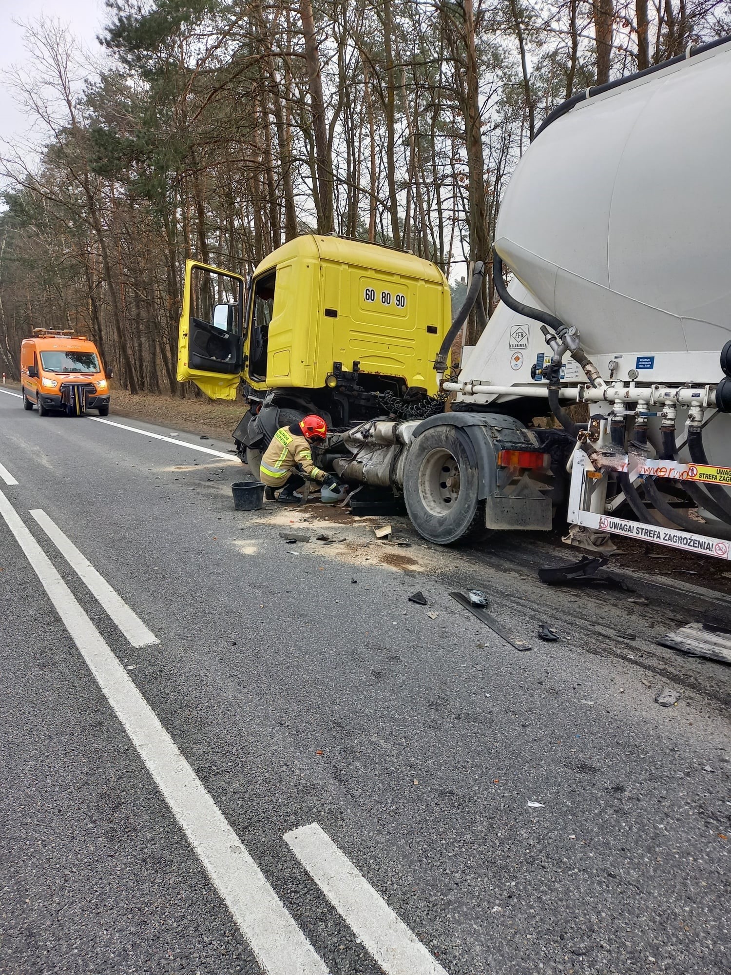Po przyjeździe na miejsce zdarzenia zastępów straży pożarnej stwierdzono, że na drodze krajowej nr 74 w miejscowości Szymanówka doszło do zderzenia samochodu osobowego Honda CRV z ciągnikiem siodłowym Scania wraz z naczepą, na której przewożony był cement. Samochodem osobowym podróżował kierowca, który znajdował się w pojedzie pod opieką ZRM, natomiast kierowca ciężarówki znajdował się poza pojazdem i nie odniósł żadnych obrażeń. Pojazdy zajmowały część jednego pasa drogowego i pobocze, z ciągnika siodłowego wyciekał olej napędowy. Na miejscu znajdowała się Policja, ZRM i Służba Drogowa. W momencie przyjazdu zastępów straży pożarnej na miejsce zdarzenia ruch na drodze krajowej nr 74 został zamknięty. Działania zastępów straży pożarnej polegały na zabezpieczeniu miejsca zdarzenia, odłączeniu akumulatorów w obydwu pojazdach, zakręceniu zaworu gazu w samochodzie Honda, wykonaniu dostępu do kierowcy samochodu osobowego (wycięcie drzwi kierowcy i pasażera, odciągnięcie kolumny kierownicy) oraz wydobyciu go z pojazdu pod nadzorem ZRM. Kierowca Hondy po przebadaniu przez ZRM został zabrany do szpitala, a kierowca Scani bez obrażeń pozostał na miejscu zdarzenia. Kolejne działania polegały na ograniczeniu wycieku płynów eksploatacyjnych ze zbiornika paliwa samochodu ciężarowego poprzez sorpcję oraz podłożenie wanny wyłapującej. Paliwo z rozszczelnionego zbiornika oraz część zanieczyszczonej olejem ziemi z nasypu drogowego zabezpieczyli pracownicy Służby Drogowej.