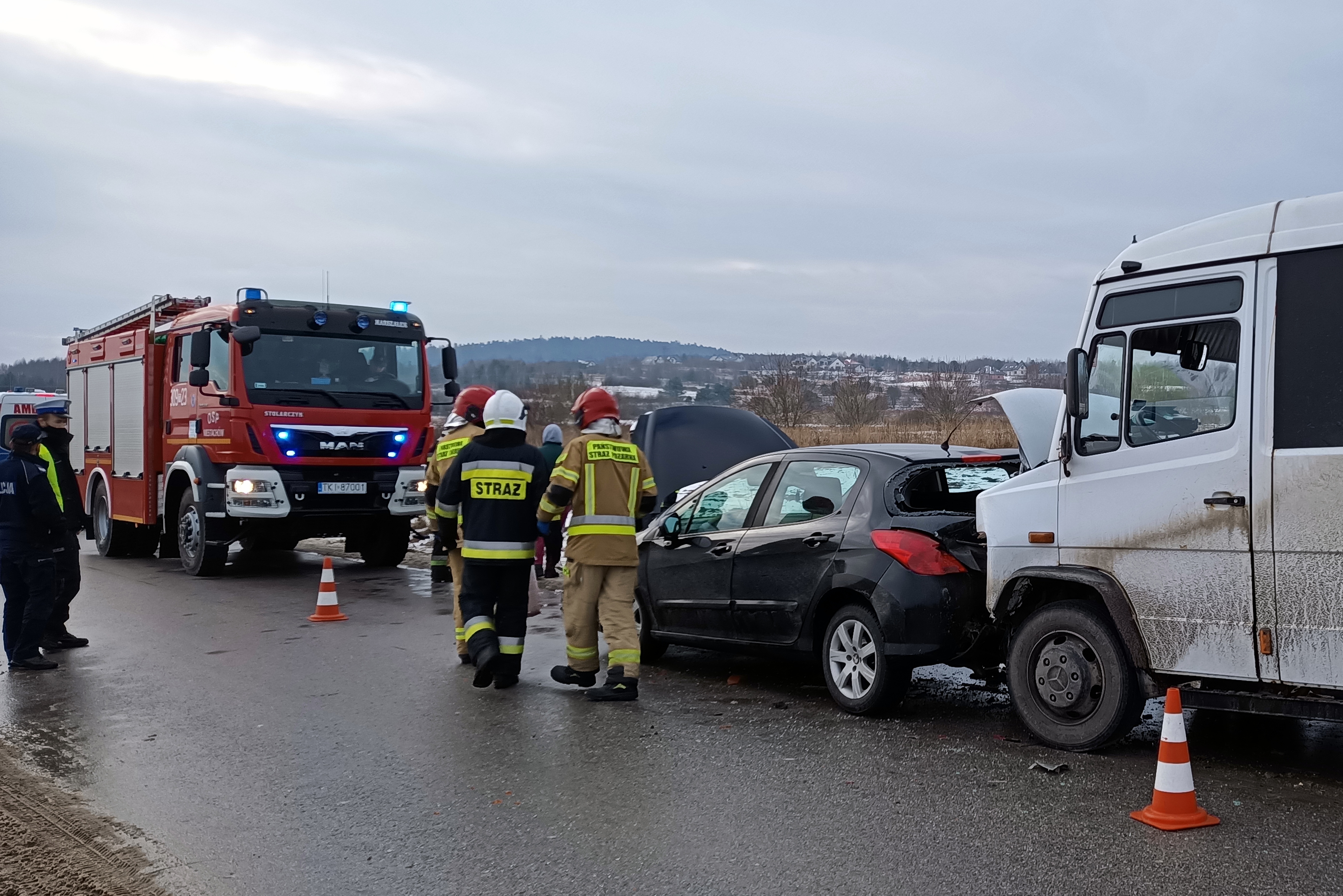 3 lutego 2021 roku o godz. 13:41 do Stanowiska Kierowania Komendanta Miejskiego Państwowej Straży Pożarnej w Kielcach za pośrednictwem Centrum Powiadamiania Ratunkowego wpłynęło zgłoszenie, dotyczące zderzenia samochodu osobowego Peugeot 308 i busa do przewodu osób Mercedesa Vario. Do zdarzenia zadysponowano 2 zastępy z Jednostki Ratowniczo-Gaśniczej nr 1 w Kielcach oraz Ochotniczą Straż Pożarną z Niestachowa. Działania przybyłych na miejsce strażaków polegały na zabezpieczeniu miejsca zdarzenia i odłączeniu akumulatorów w pojazdach. Kobieta podróżująca Peugeotem uskarżała się na ból głowy. Udzielono jej KPP (szybkie badanie urazowe i wsparcie psychiczne). Gdy na miejsce zdarzenia dotarł Zespół Ratownictwa Medycznego i przebadał poszkodowaną kobietę postanowiono o przetransportowaniu jej do szpitala. Wszyscy pasażerowie busa nie odnieśli obrażeń, przesiedli się do samochodu podstawionego przez przewoźnika i odjechali przed przybyciem służb ratowniczych.