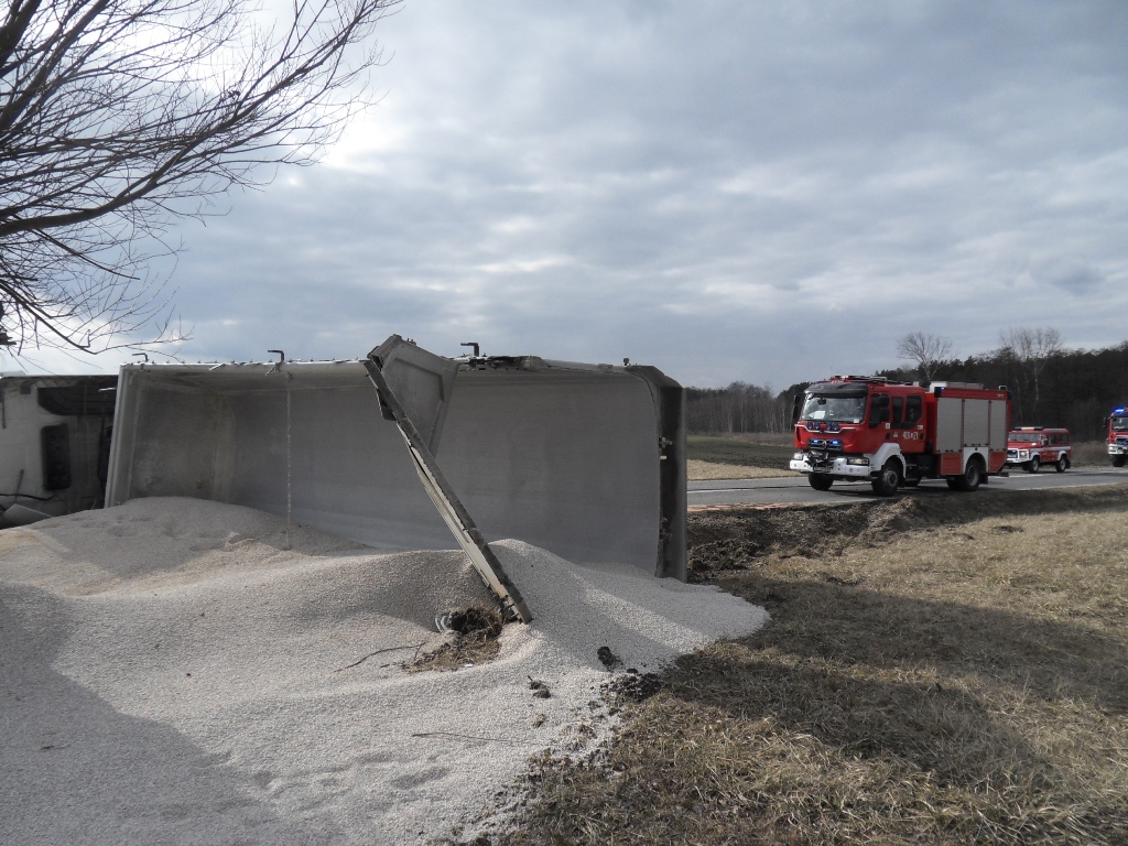 Działania zastępów jednostek ochrony przeciwpożarowej w pierwszej fazie polegały na zabezpieczeniu miejsca zdarzenia oraz ograniczeniu wycieków płynów eksploatacyjnych. O zaistniałej sytuacji został poinformowany zarządca drogi oraz właściciel pojazdu, który przybyły na miejsce zdarzenia wraz z ciężkim sprzętem i przystąpił do usuwania rozsypanego kruszywa i uszkodzonego samochodu ciężarowego. Następnie strażacy przystąpili do kolejnego etapu polegającego na oświetleniu terenu akcji oraz sorpcji i neutralizacji płynów eksploatacyjnych rozlewających się w trakcie stawiania zestawu na koła. Przybyły na miejsce zdarzenia przedstawiciel zarządcy drogi, który zebrał zużyty sorbent celem dalszej utylizacji.