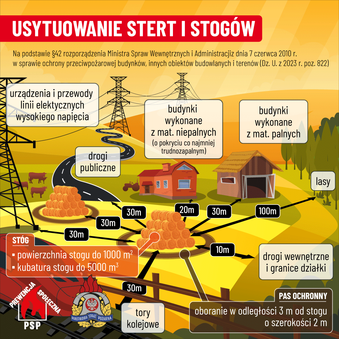 - Wypalanie słomy i pozostałości roślinnych na polach jest zabronione. Właściciele, zarządcy lub użytkownicy obiektów magazynowych oraz inwentarskich, zapewniają i wdrażają instrukcję bezpieczeństwa pożarowego - instrukcja jest wymagana dla obiektów magazynowych o kubaturze brutto budynku przekraczającej 1000m3 i obiektów inwentarskich przekraczających 1500m3.