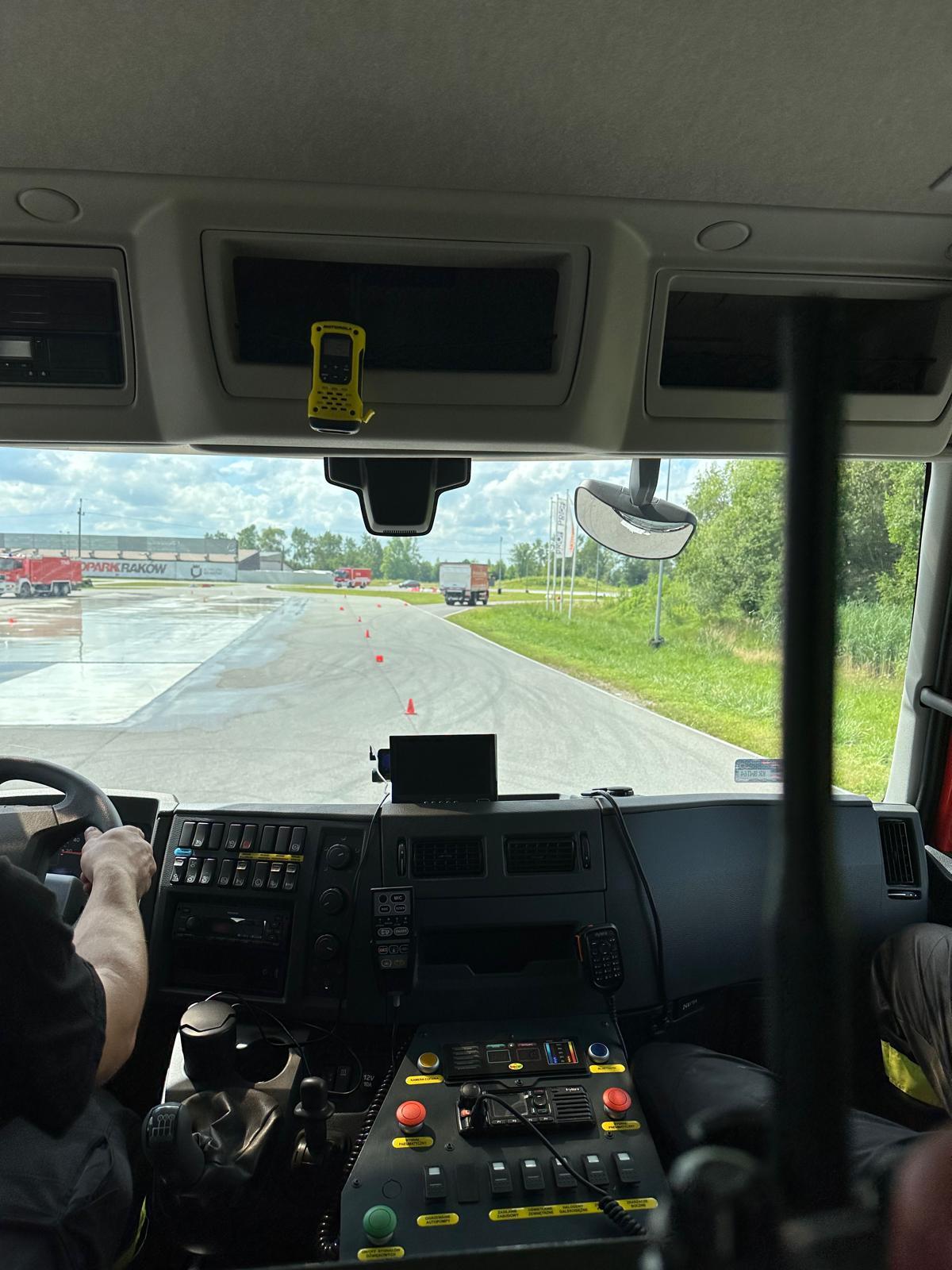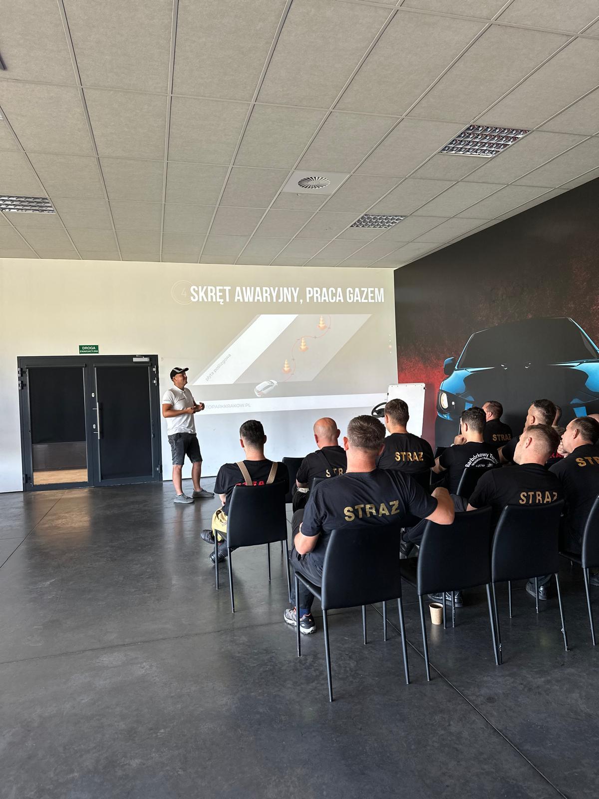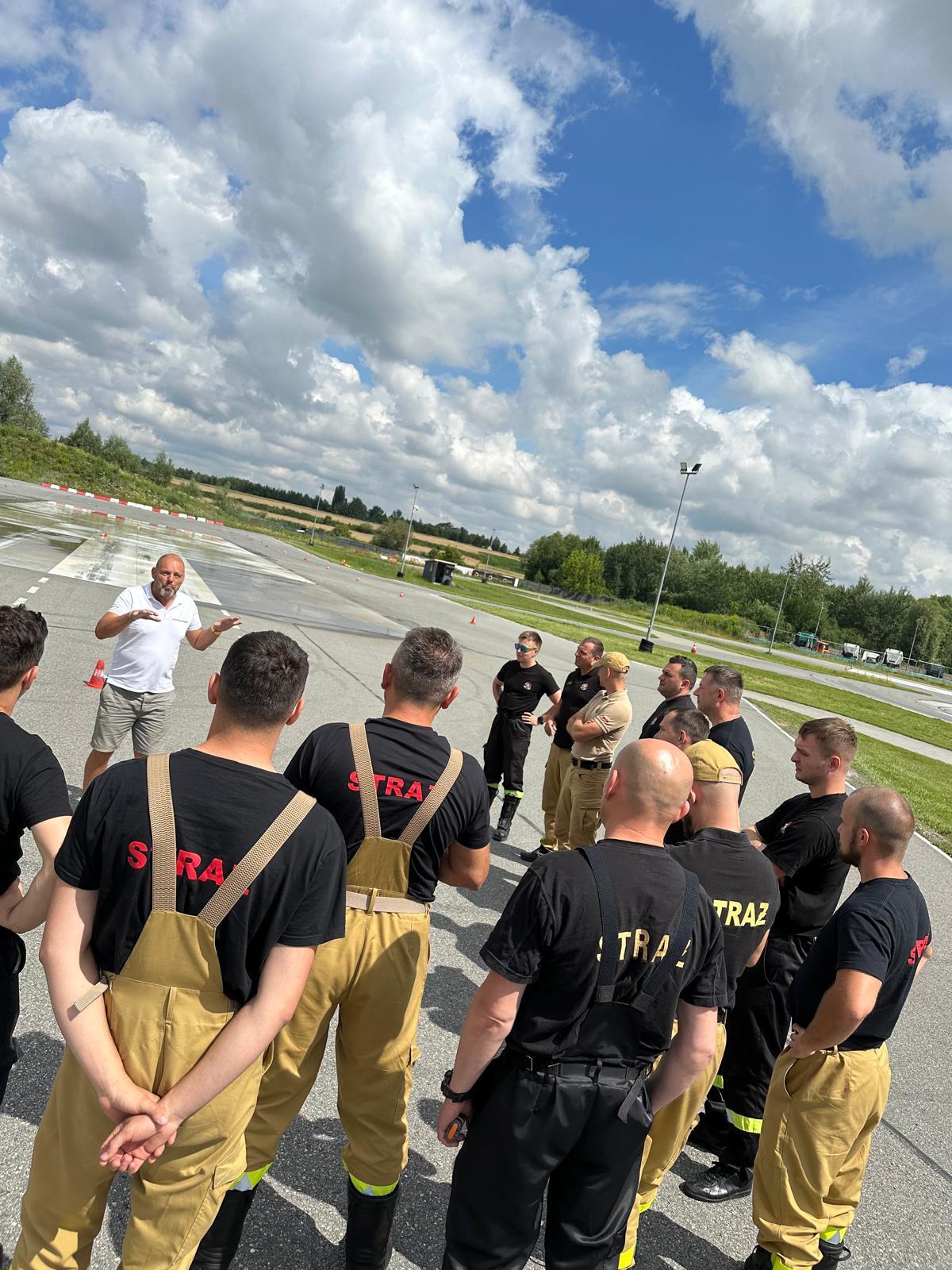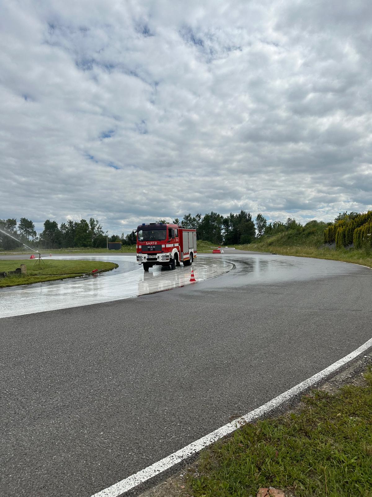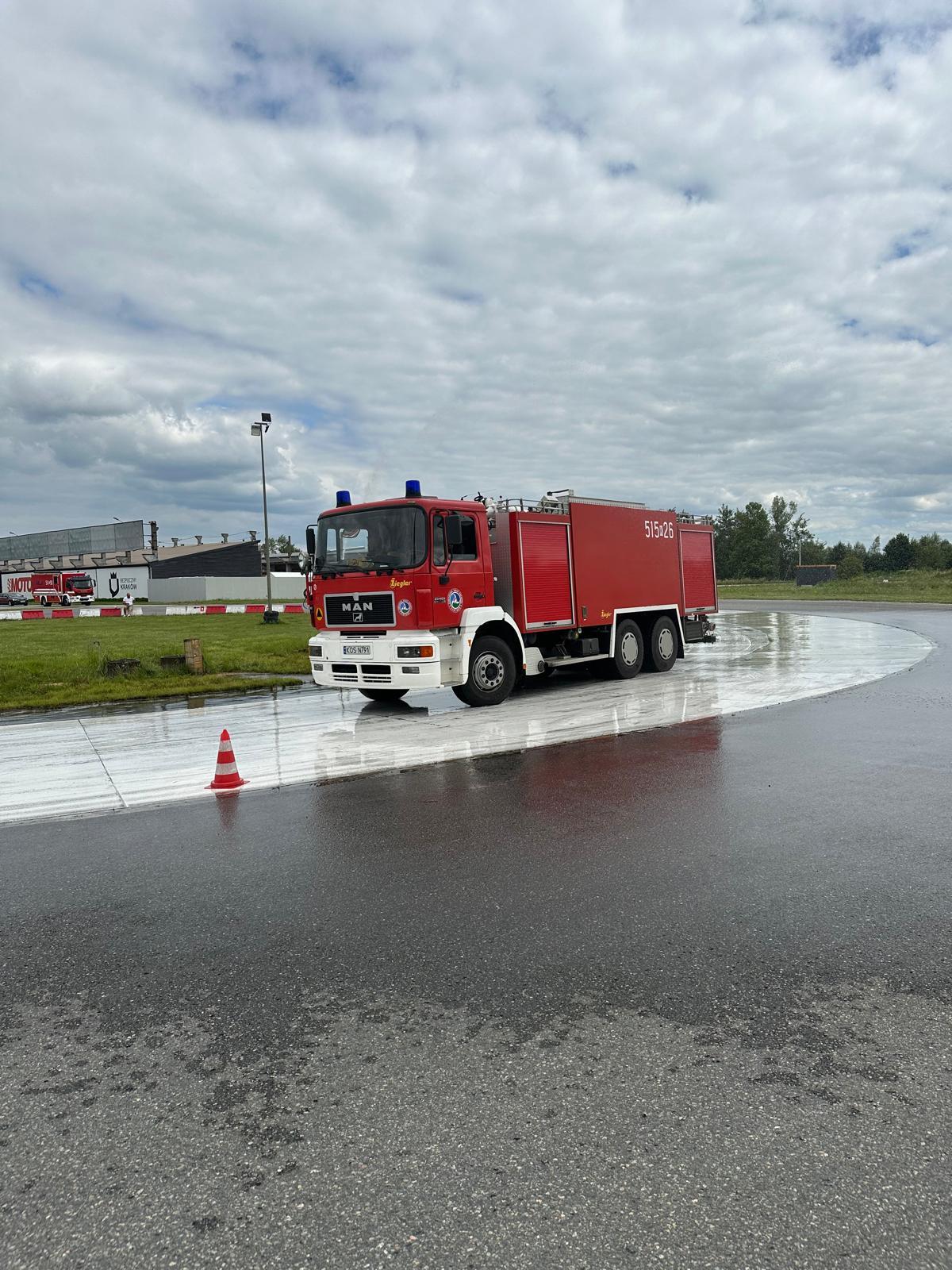 Hamowanie awaryjne. Hamowanie awaryjne na wprost na przyczepnej, mieszanej i śliskiej nawierzchni. Hamowanie awaryjne z ominięciem przeszkody (kurtyny wodne) i w zakręcie.Rolę kierownika szkolenia pełnił mł. asp. Tomasz Pachoń z Ośrodka Szkolenia KW PSP w Krakowie.