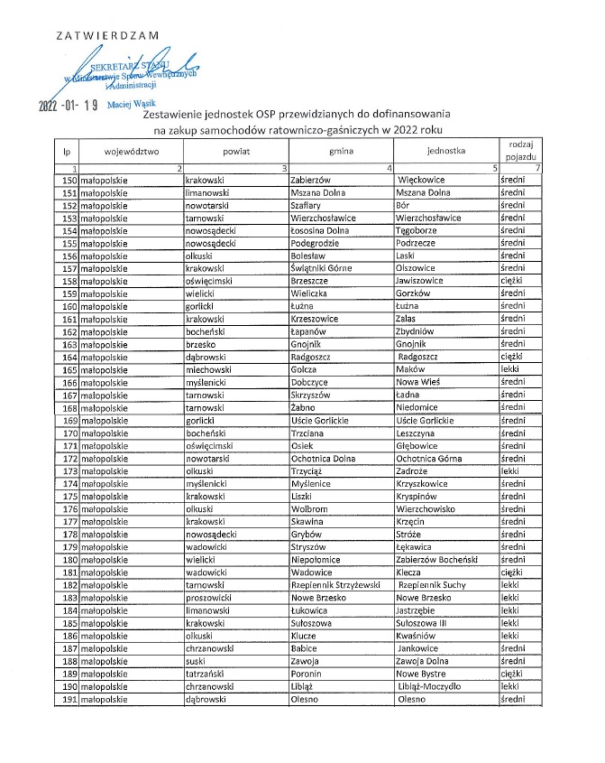 Wczoraj (19 stycznia) wiceszef Ministerstwa Spraw Wewnętrznych i Administracji Maciej Wąsik zatwierdził zestawienie jednostek OSP, które w 2022 r. otrzymają dofinansowanie na zakup samochodów ratowniczo-gaśniczych. Dzięki tym środkom do strażaków ochotników z całego kraju trafi 456 nowych pojazdów. 42 z nich otrzymają małopolskie Ochotnicze Straże Pożarne.