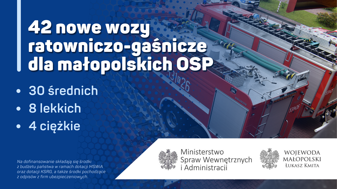 – Do małopolskich jednostek OSP trafi 30 średnich samochodów ratowniczo-gaśniczych, 8 lekkich i 4 ciężkie. Bardzo dziękuję kierownictwu Ministerstwa Spraw Wewnętrznych i Administracji za nowy sprzęt dla małopolskich OSP. Dzięki krajowym funduszom możemy stale doposażać nasze służby w najnowszy sprzęt, a tym samym zwiększać bezpieczeństwo obywateli – mówi wojewoda małopolski Łukasz Kmita.